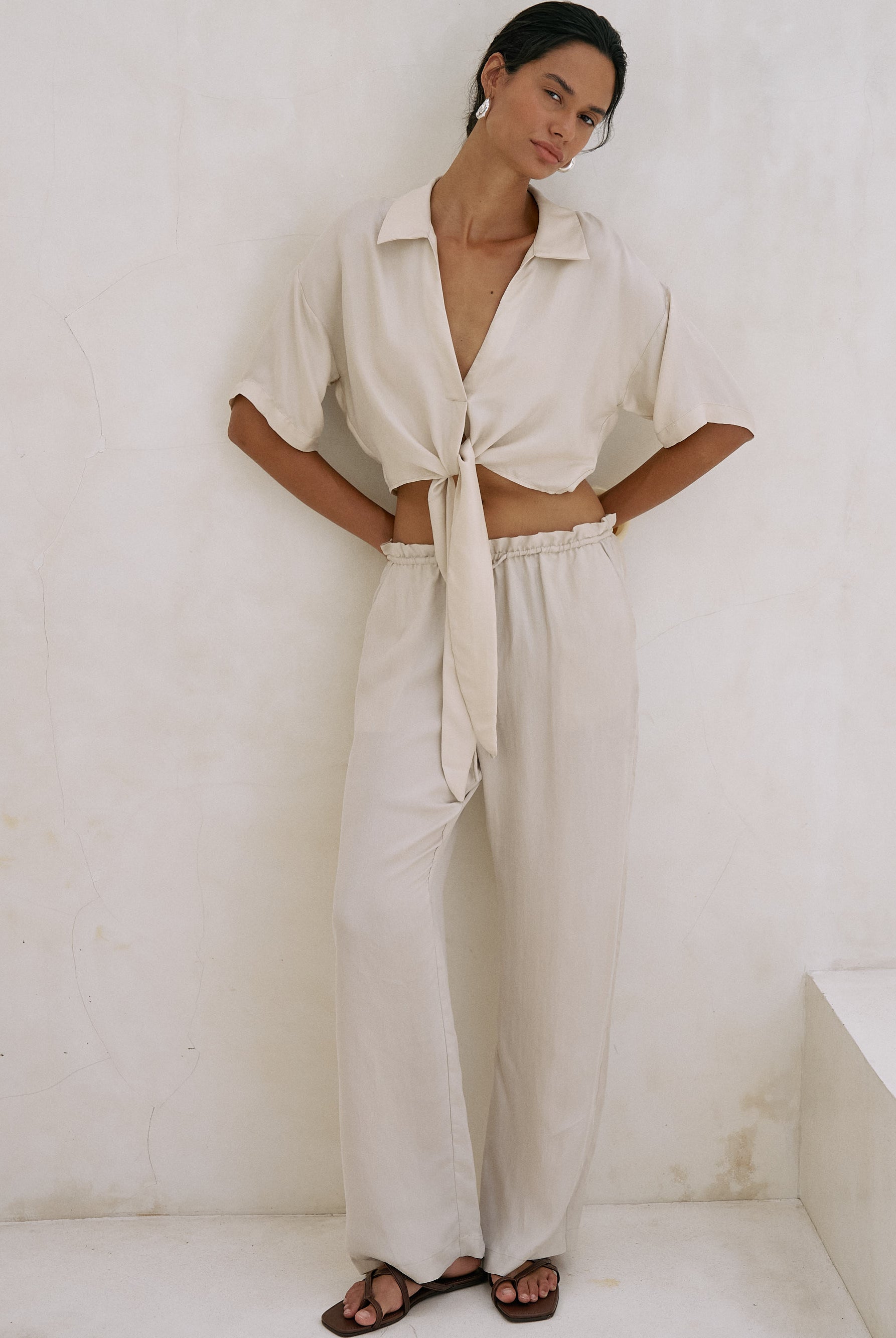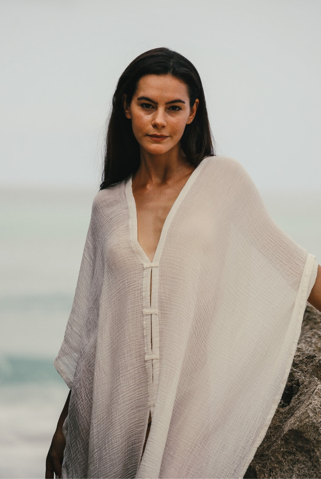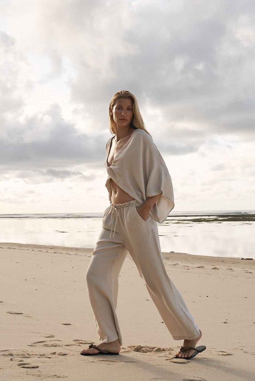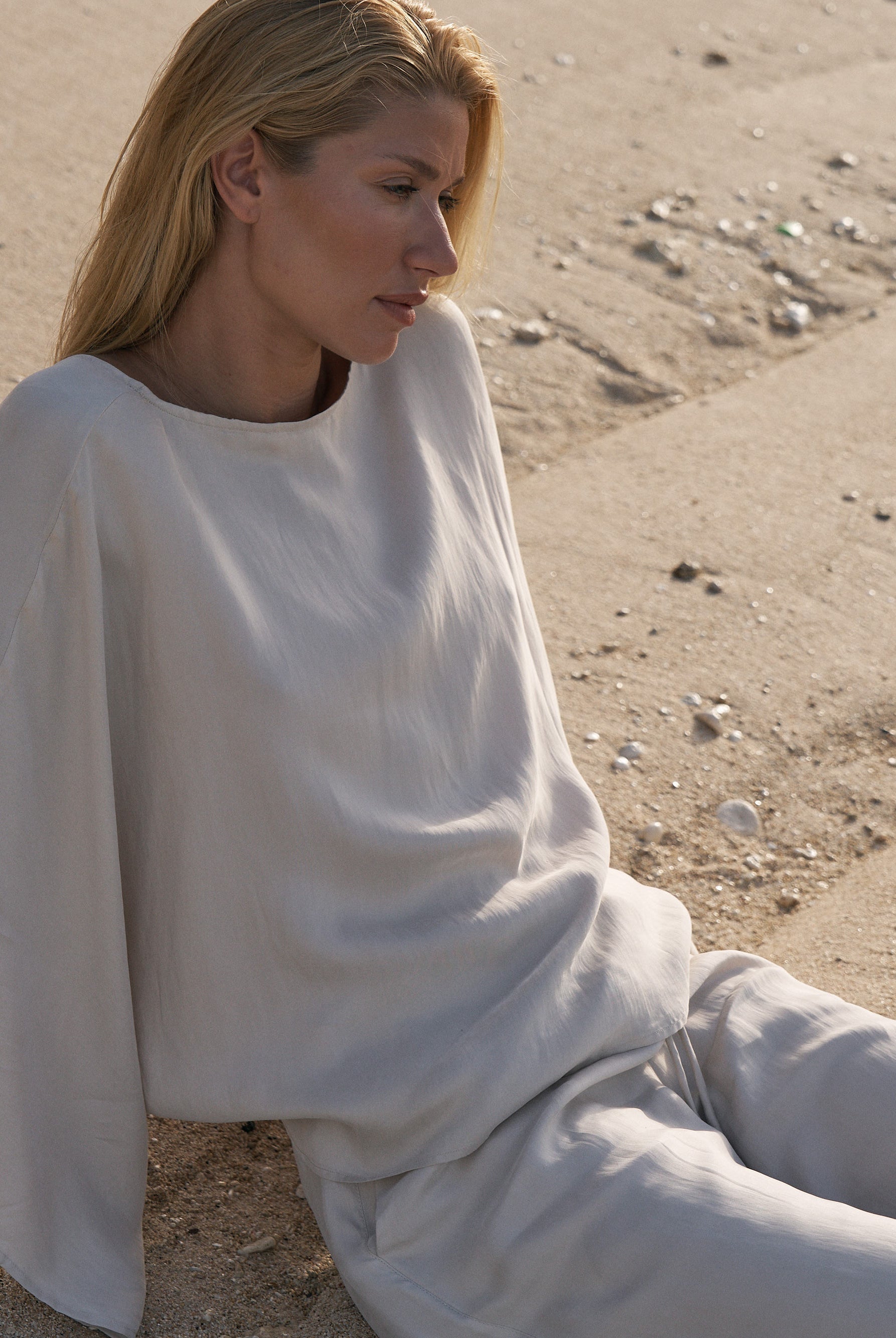 The billowy flow of this top pairs perfectly with cut-off shorts for a beachy, casual look.