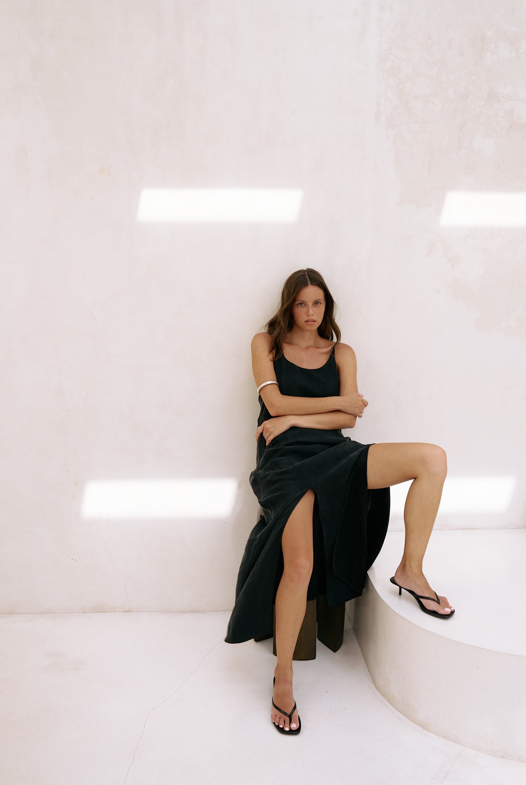 The Sade Top Black Stripes's surplice silhouette adds a romantic cross-front drape to a tunic body. An elongating vertical stripe cascades down its length. Flowing material feels irresistibly breezy with wide sleeves and a low back hem. It’s perfect for strolls in the sand or layering over a transitional look. A soft-tailored collar adds “boyfriend shirt” appeal, while an optional invisible closure lets you wear it more modestly.