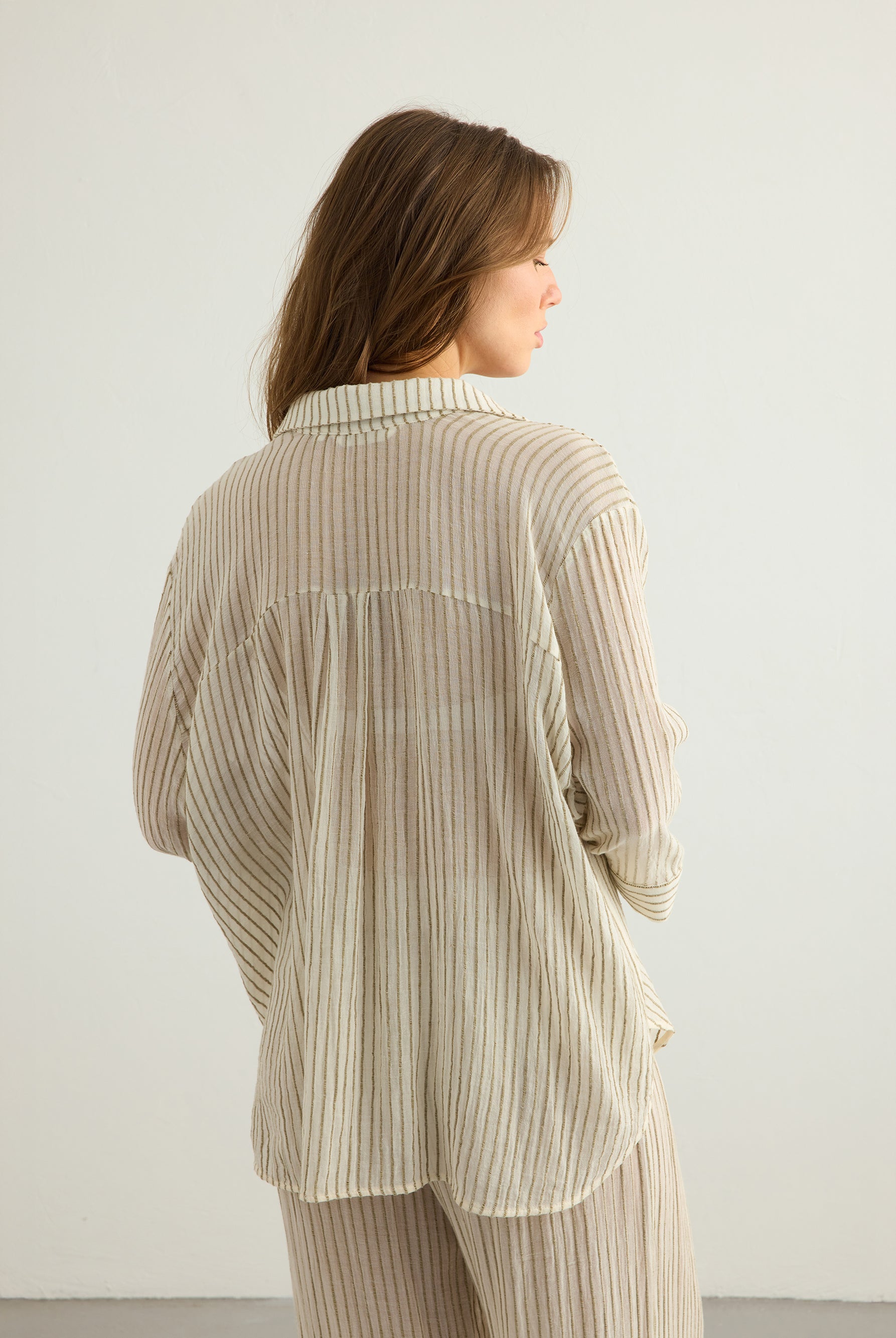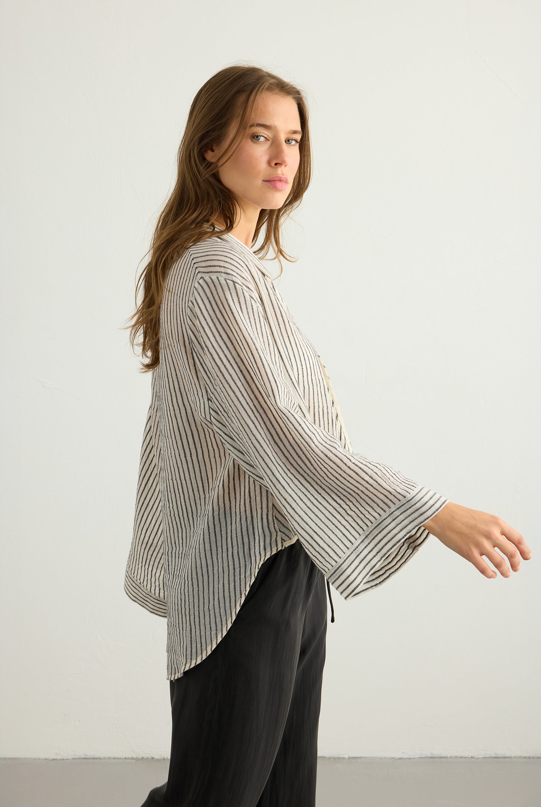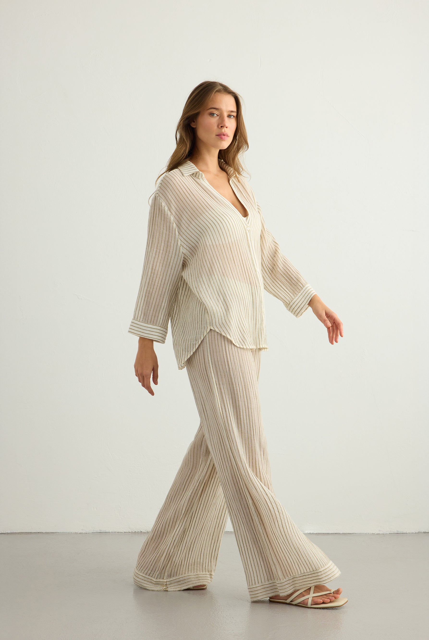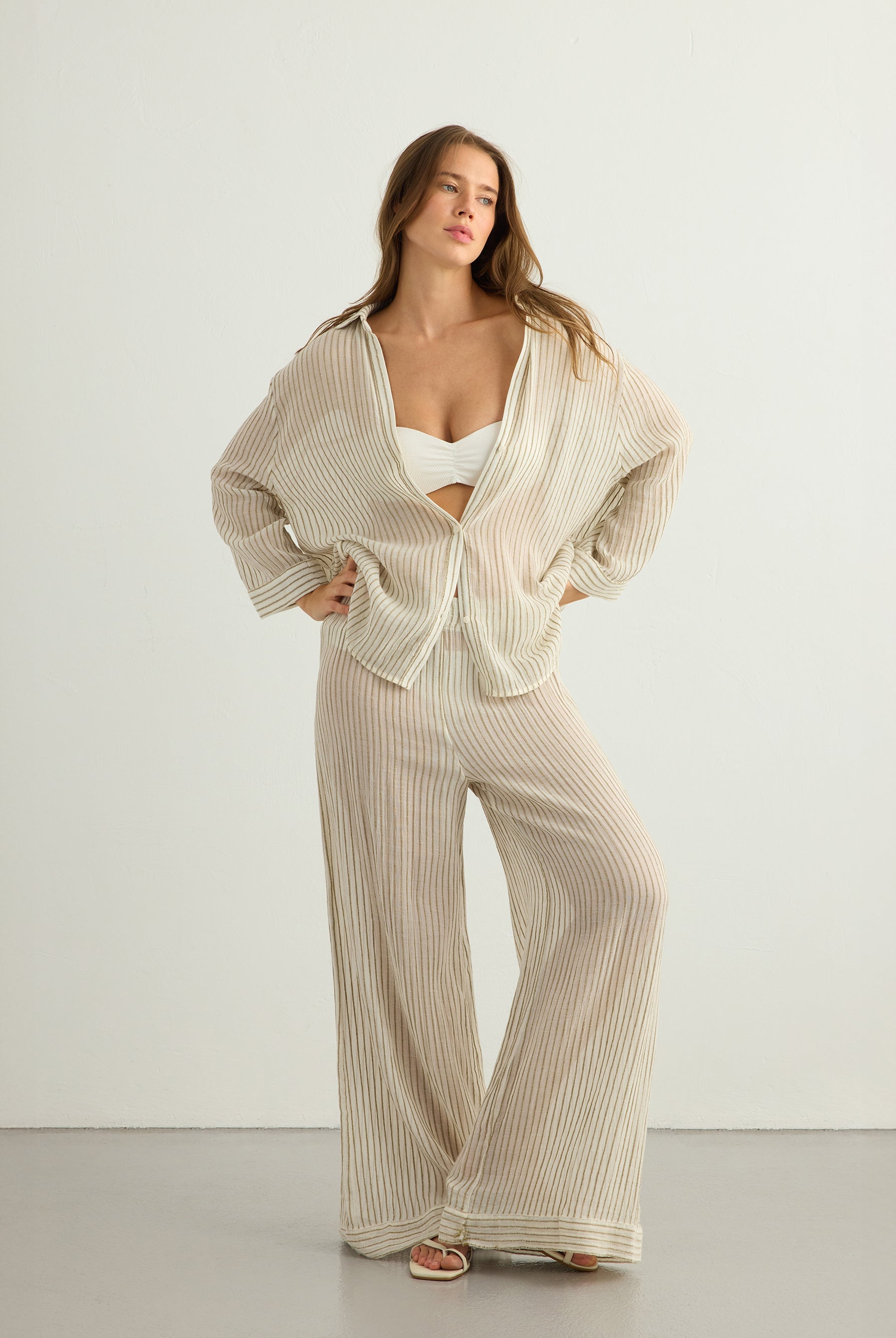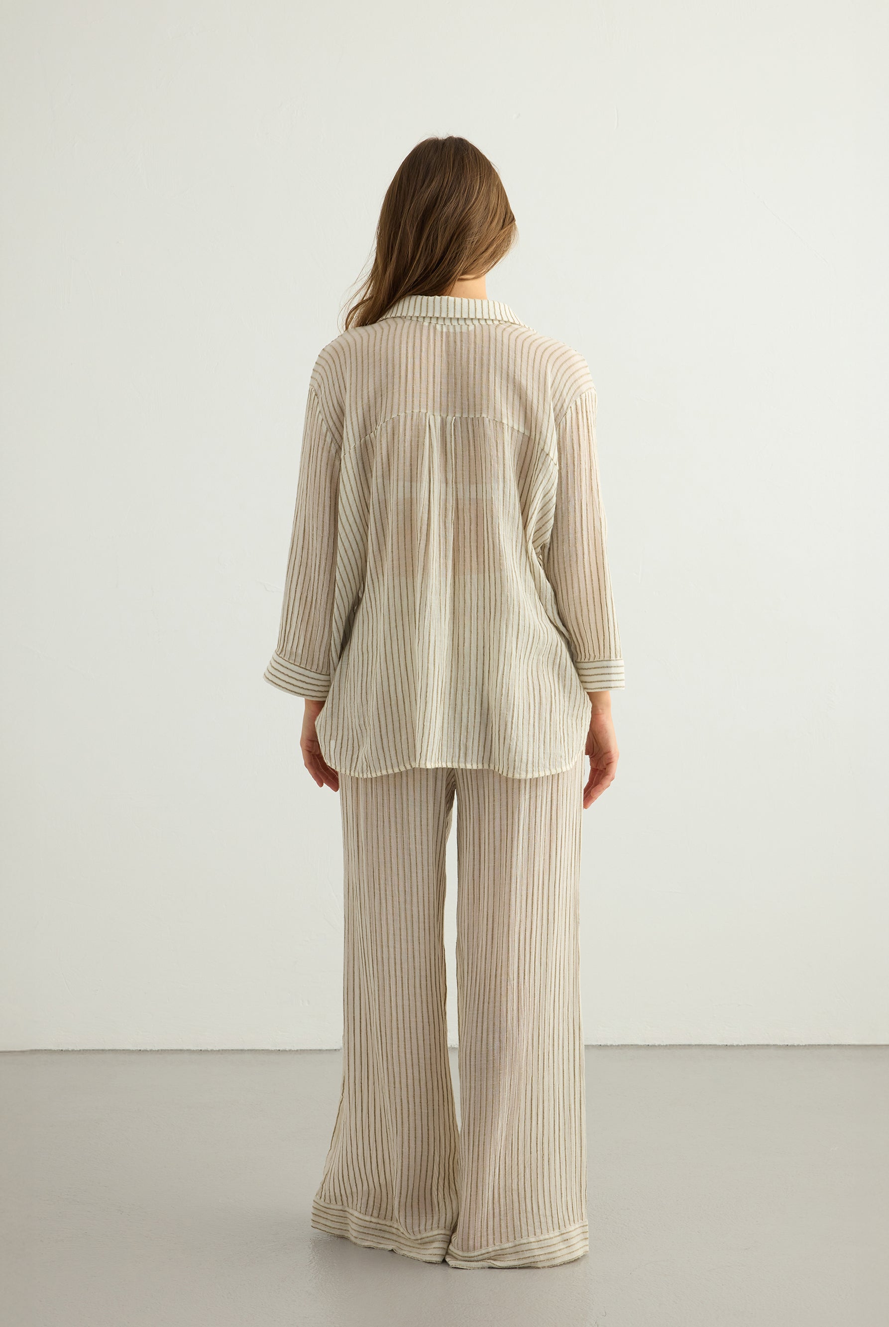 A playful yet timeless exploration of pattern. This collection reimagines classic stripes in layered textures and natural tones, crafted from 100% Organic Turkish cotton. Effortless silhouettes meet rhythmic lines, creating pieces made for everyday ease and summer light.