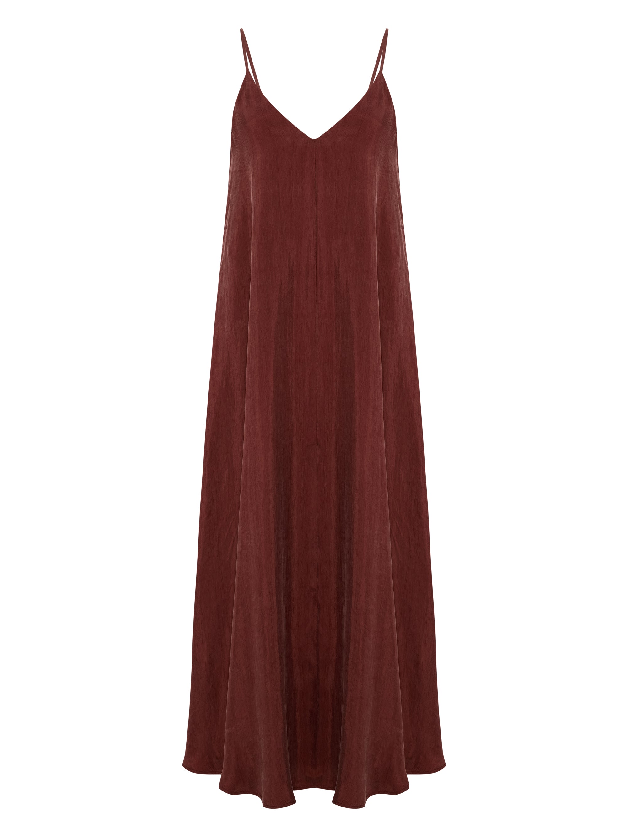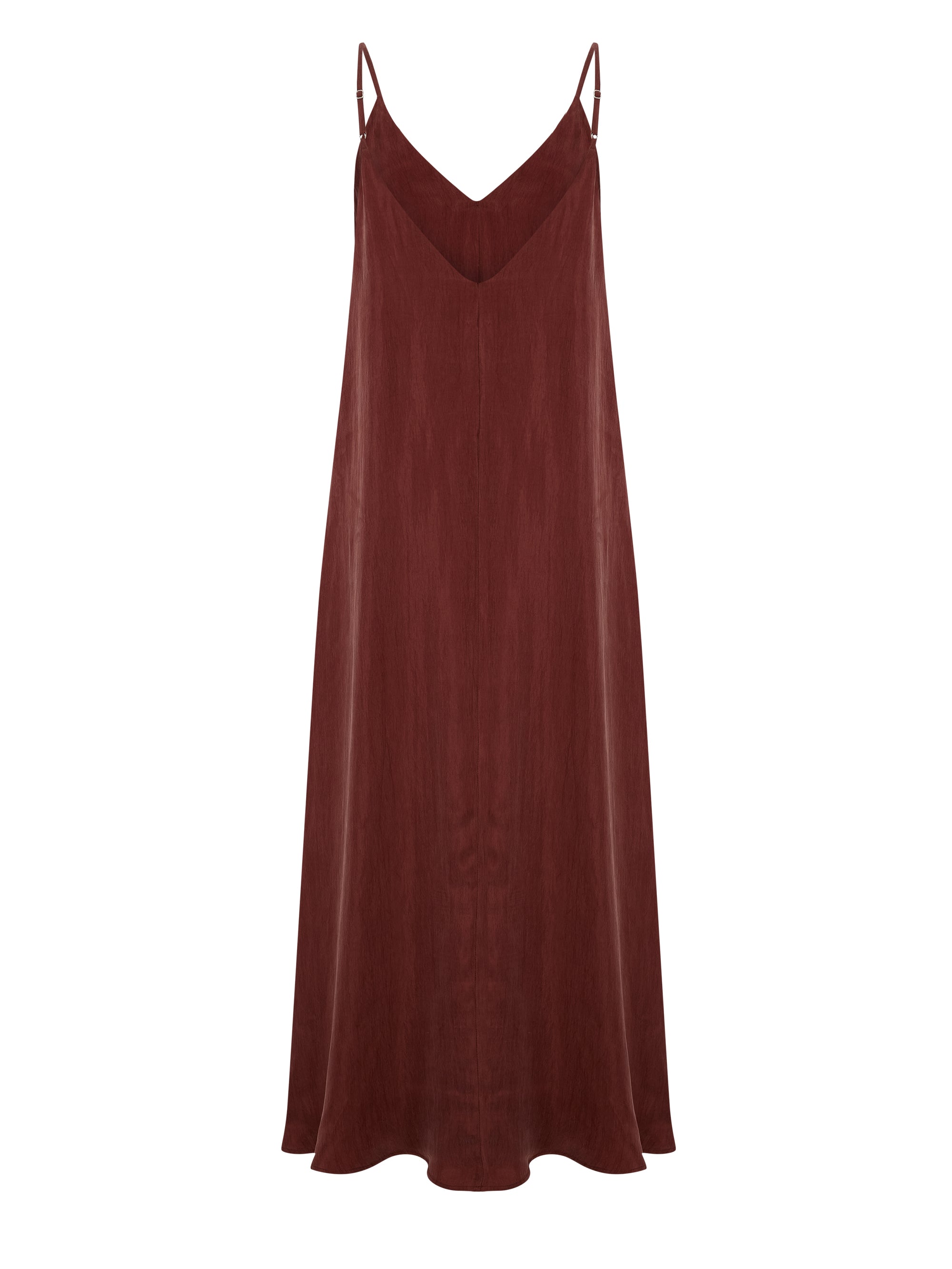 This voluminous summer style features a delicate V-neckline, slender adjustable straps, and a graceful silhouette. The lightweight fabric offers a subtle sheen and a luxurious drape. An elegant open-back detail adds sophistication, making it perfect for both relaxed days and evening occasions.