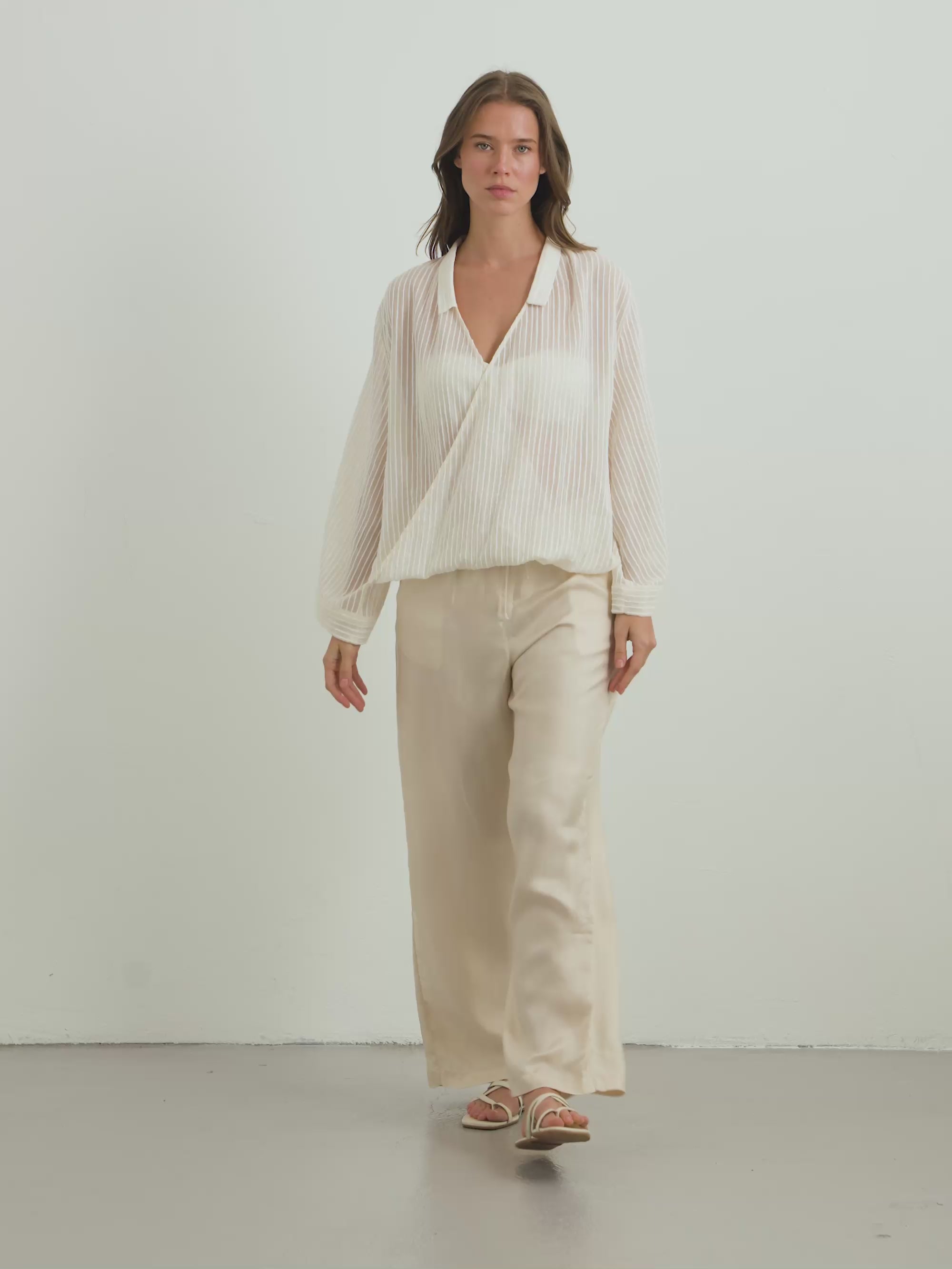 The Sade Top White Stripes’s surplice silhouette adds a romantic cross-front drape to a tunic body. An elongating vertical stripe cascades down its length. Flowing material feels irresistibly breezy with wide sleeves and a low back hem. It’s perfect for strolls in the sand or layering over a transitional look. A soft-tailored collar adds “boyfriend shirt” appeal, while an optional invisible closure lets you wear it more modestly.