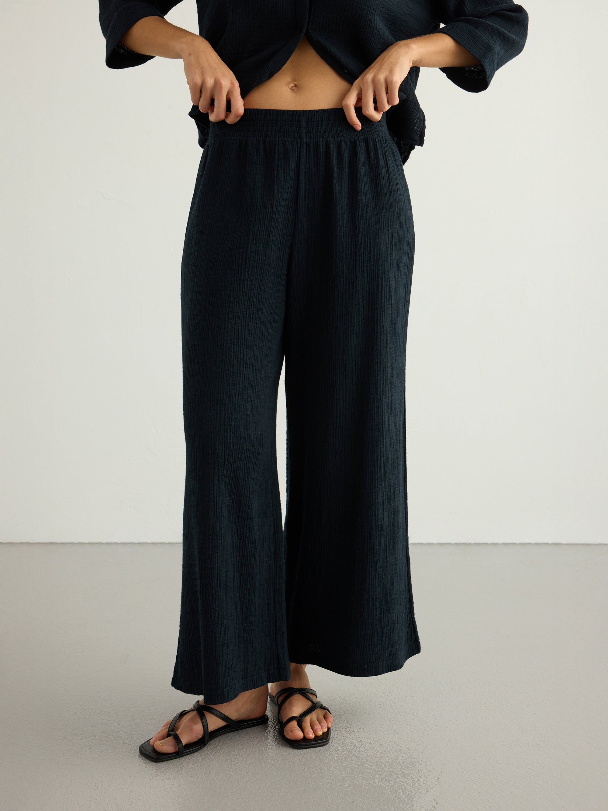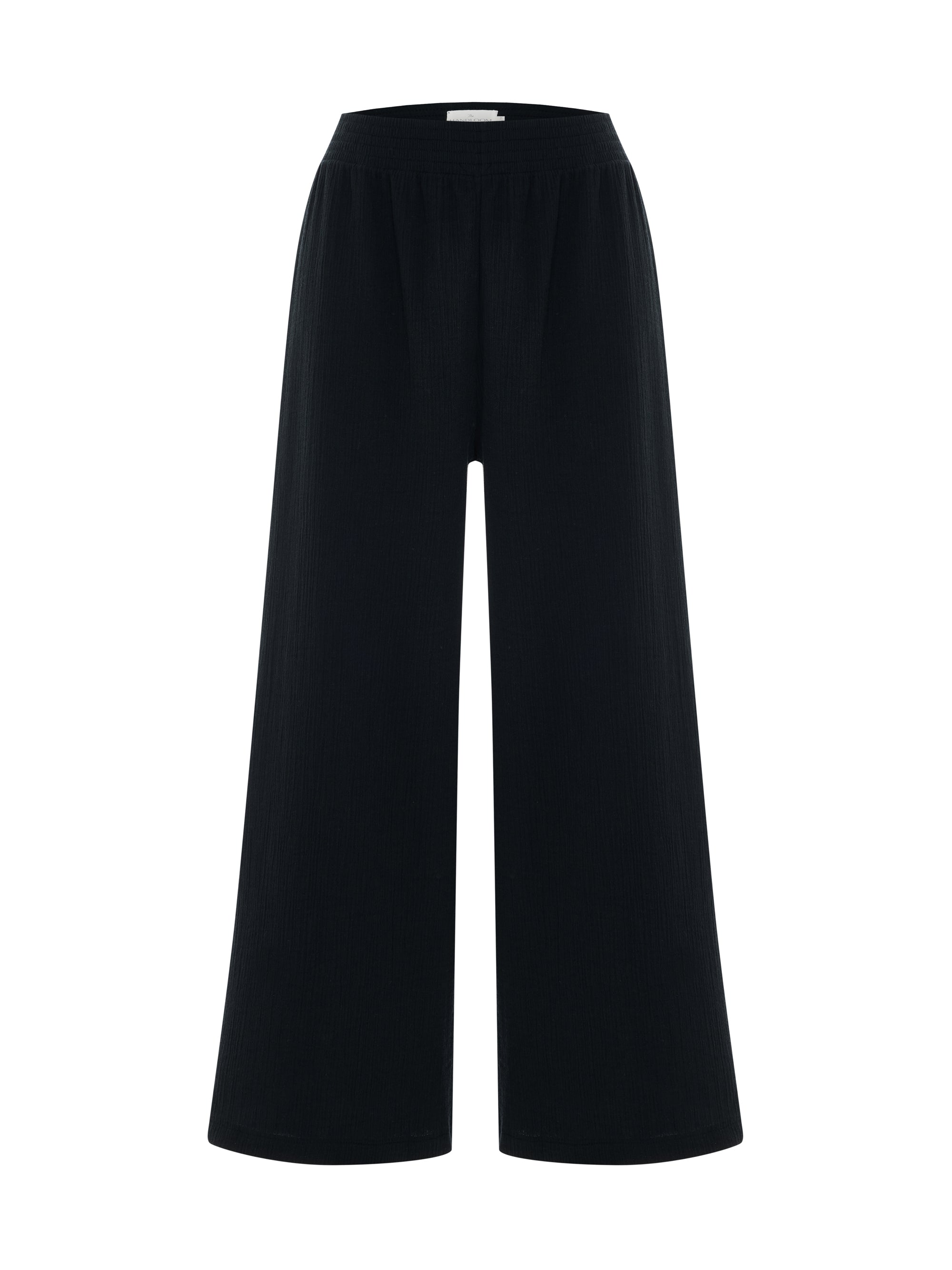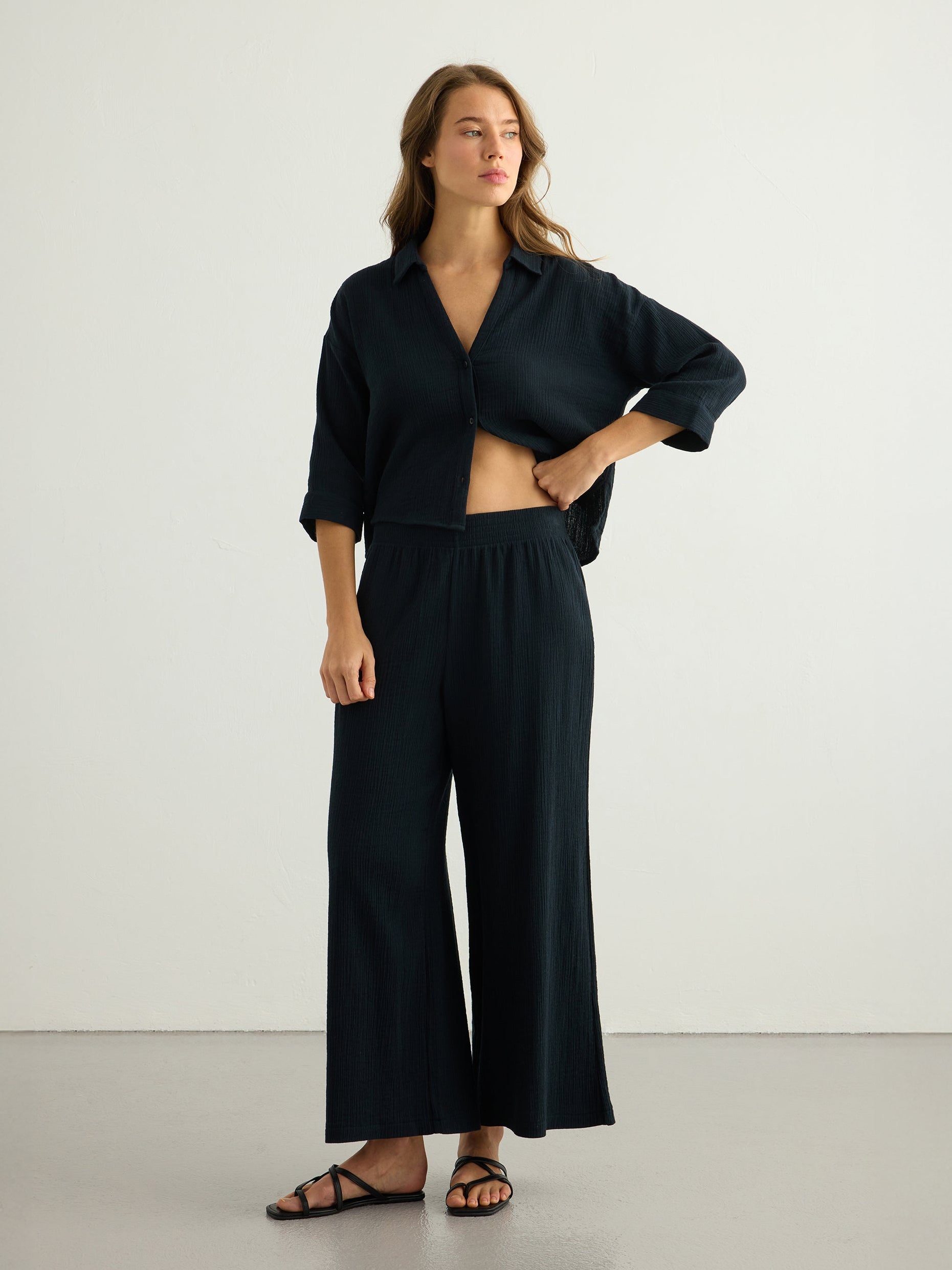 Designed for everyday comfort, these lightweight palazzo pants are cut in a relaxed, wide-leg silhouette that moves softly with the body. Crafted from breathable, textured fabric, they offer an airy feel for warm-weather days and effortless all-day wear. Finished with an elasticated waistband, they can be worn high on the waist or lower on the hips for a more relaxed fit. An easy wardrobe staple for slow mornings, travel and long summer days. Style with the Aura Mini Shirt or Aura Maxi Shirt for a relaxed, coordinated look.