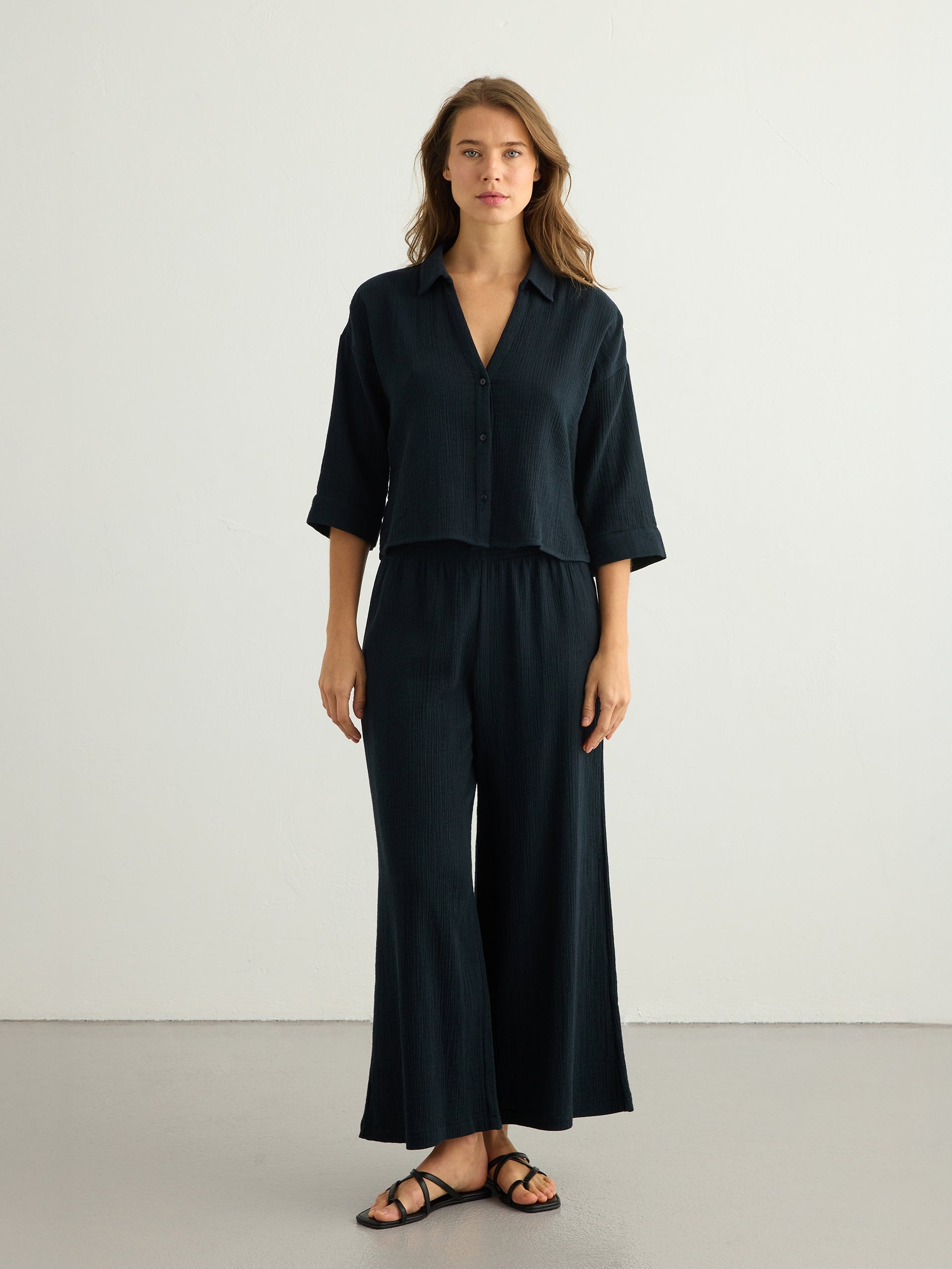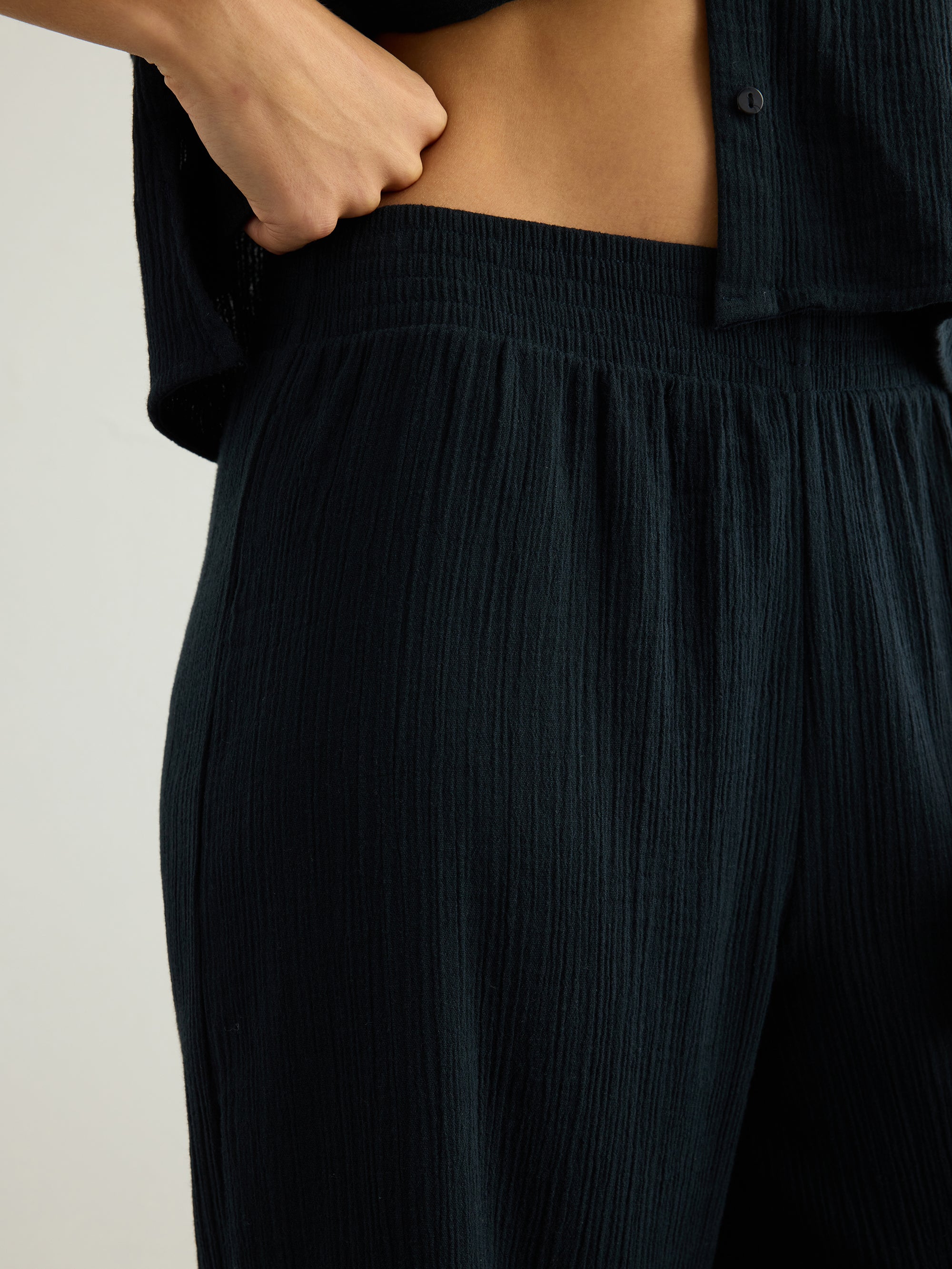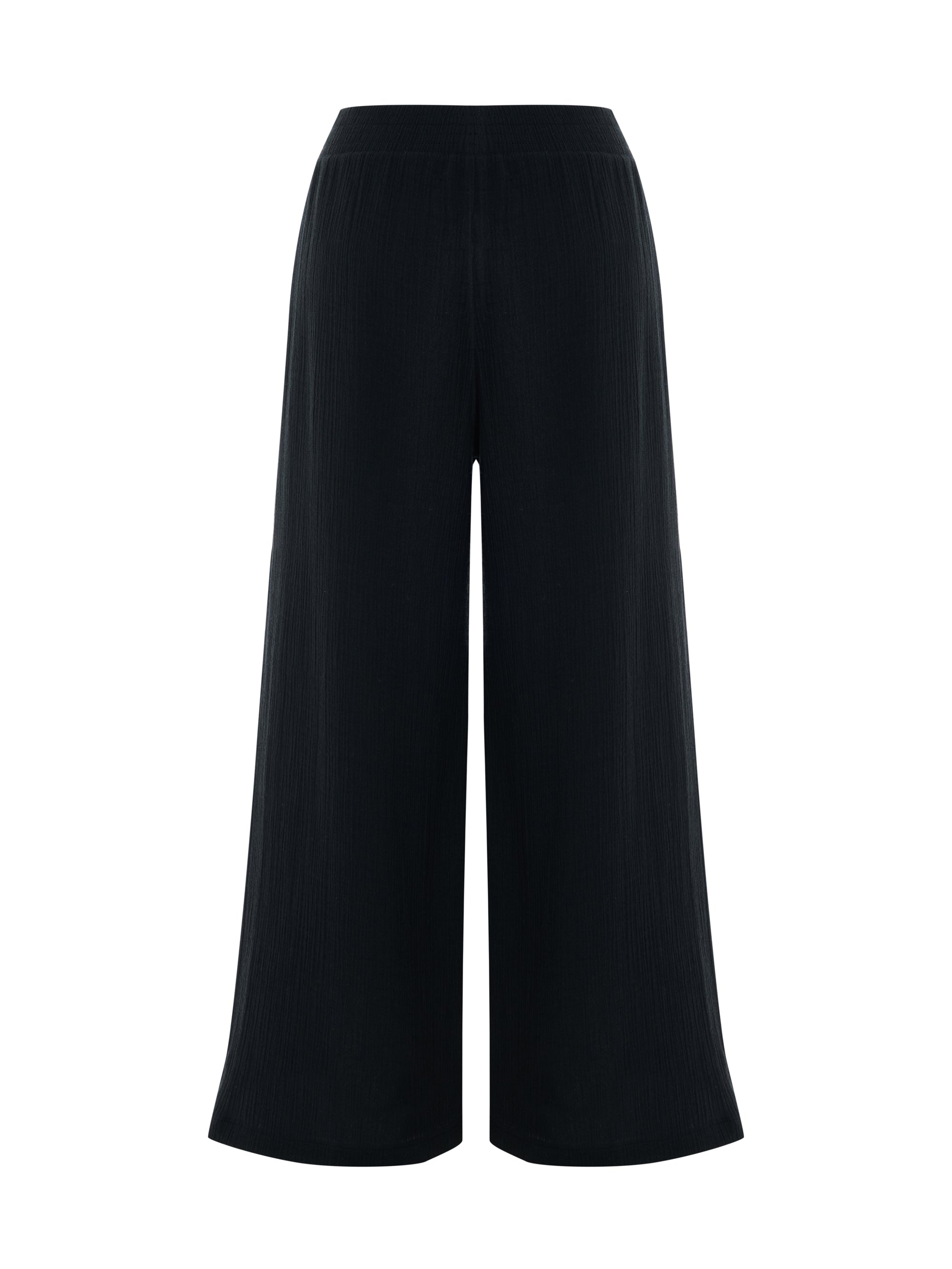 Designed for everyday comfort, these lightweight palazzo pants are cut in a relaxed, wide-leg silhouette that moves softly with the body. Crafted from breathable, textured fabric, they offer an airy feel for warm-weather days and effortless all-day wear. Finished with an elasticated waistband, they can be worn high on the waist or lower on the hips for a more relaxed fit. An easy wardrobe staple for slow mornings, travel and long summer days. Style with the Aura Mini Shirt or Aura Maxi Shirt for a relaxed, coordinated look.