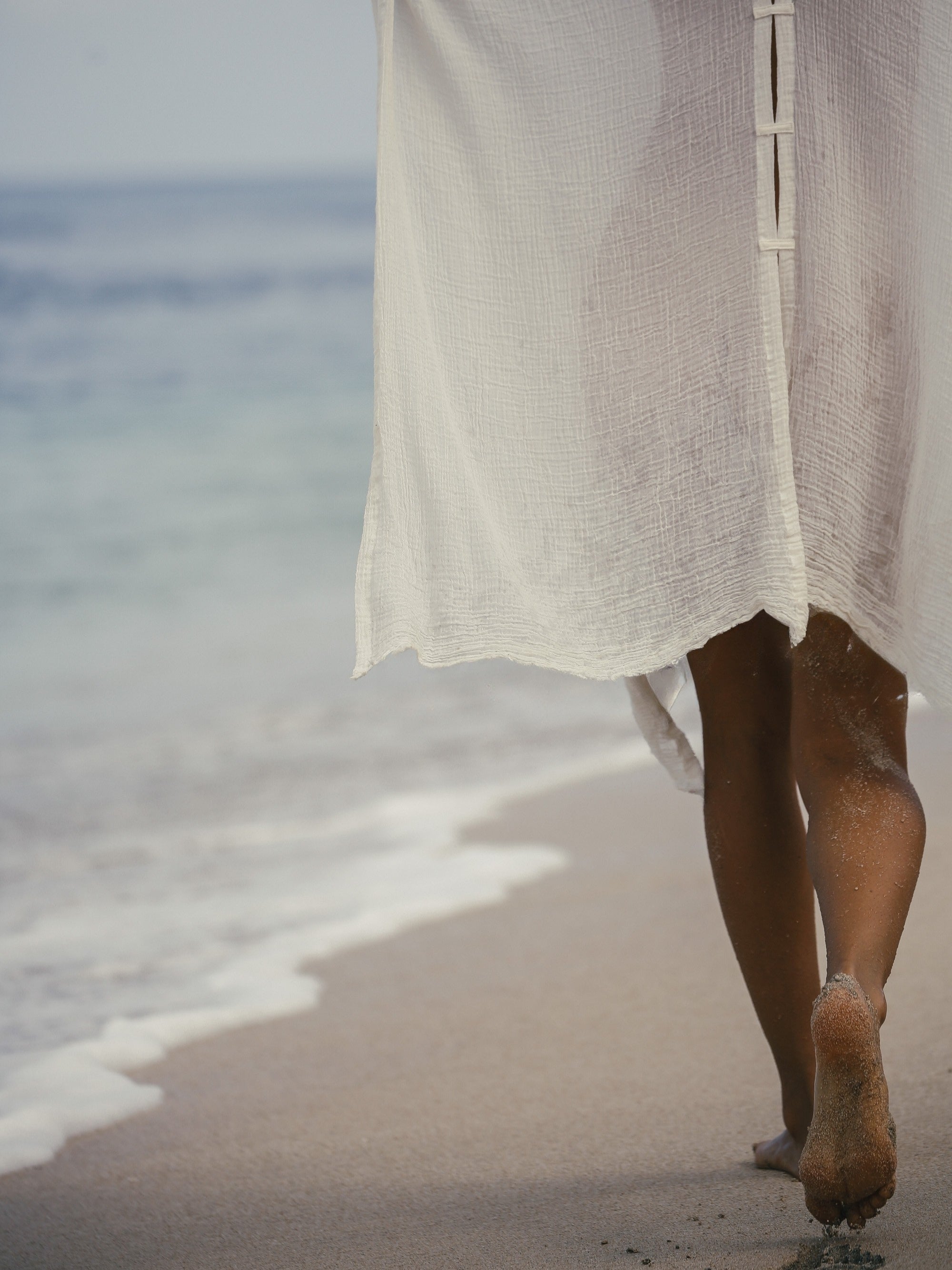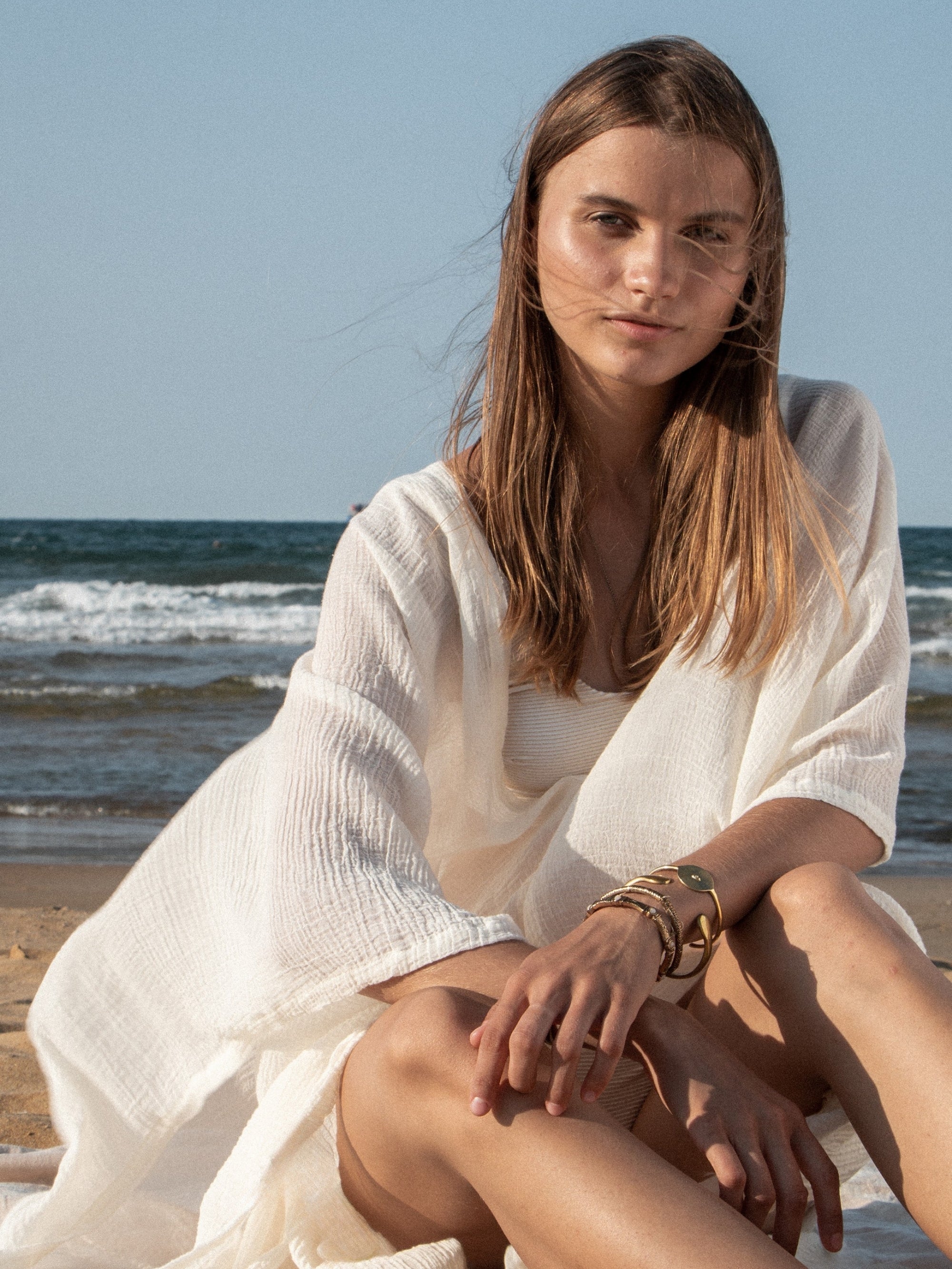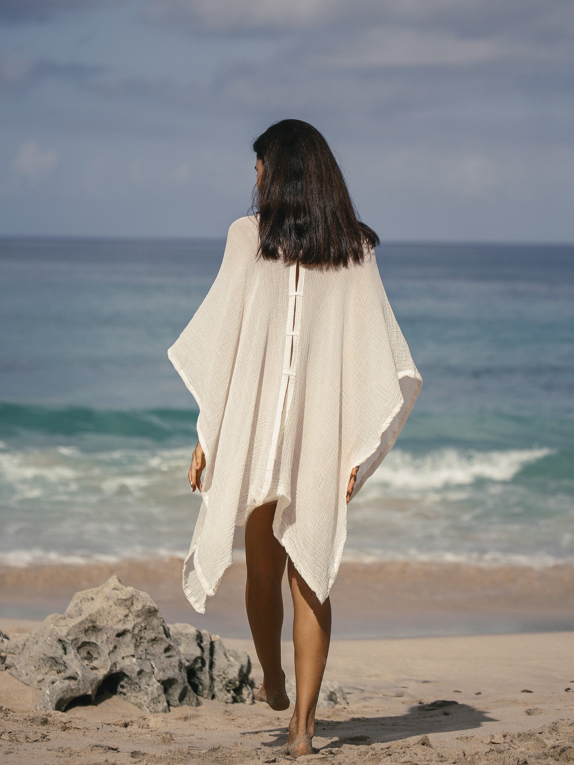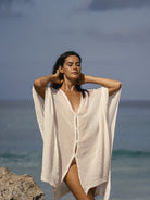 Make a memorable statement by the sea or in the lounge with the hand loomed Ava Kimono Natural. An asymmetric frayed hem along with side slits, add movement and flow to a roomy drape. Featured artisanal striped motifs woven into its flowy fabric which boasts a linen-like feel. Breathable fibers and naturally built-in cooling properties make this the perfect beach kaftan.