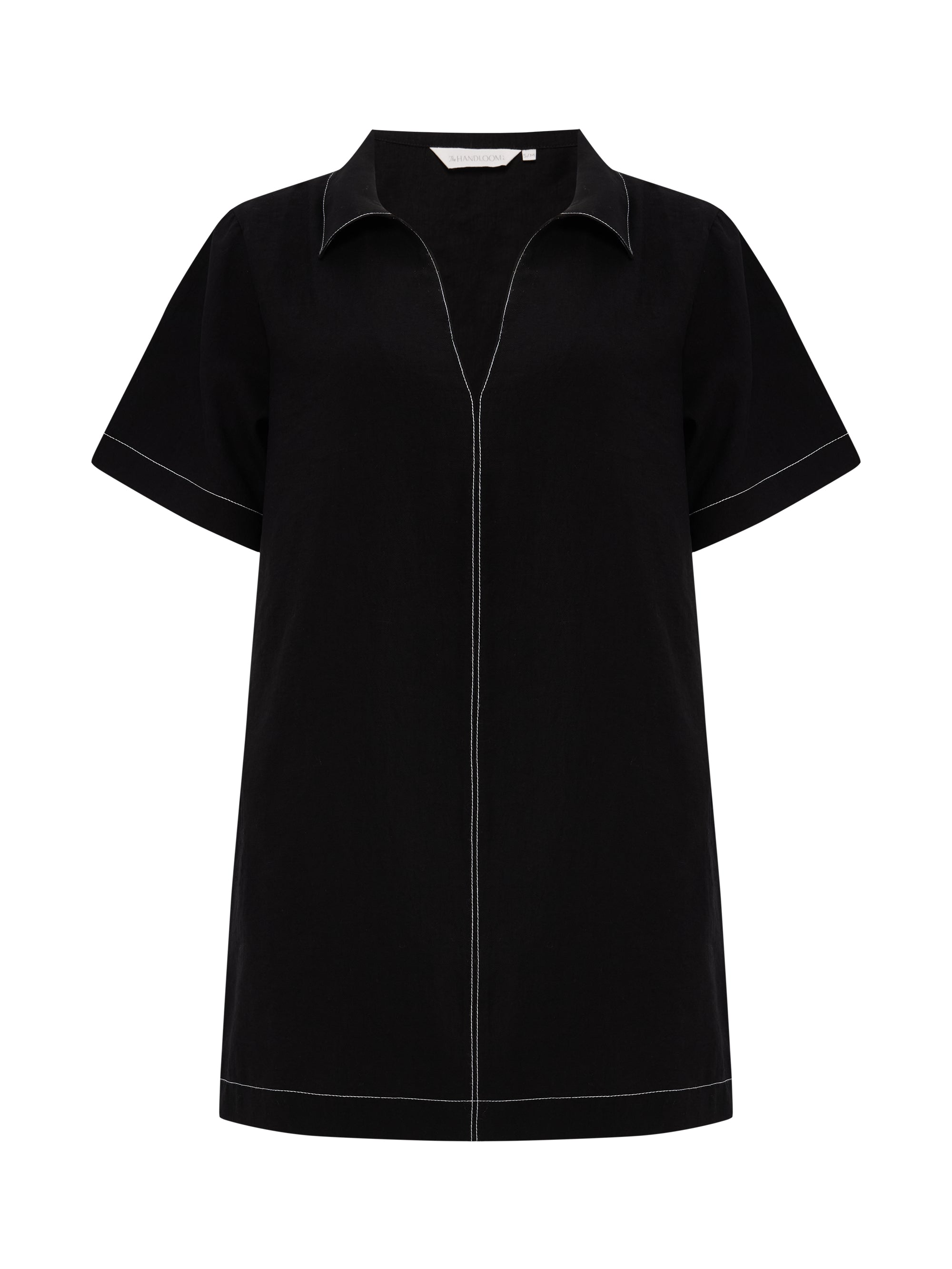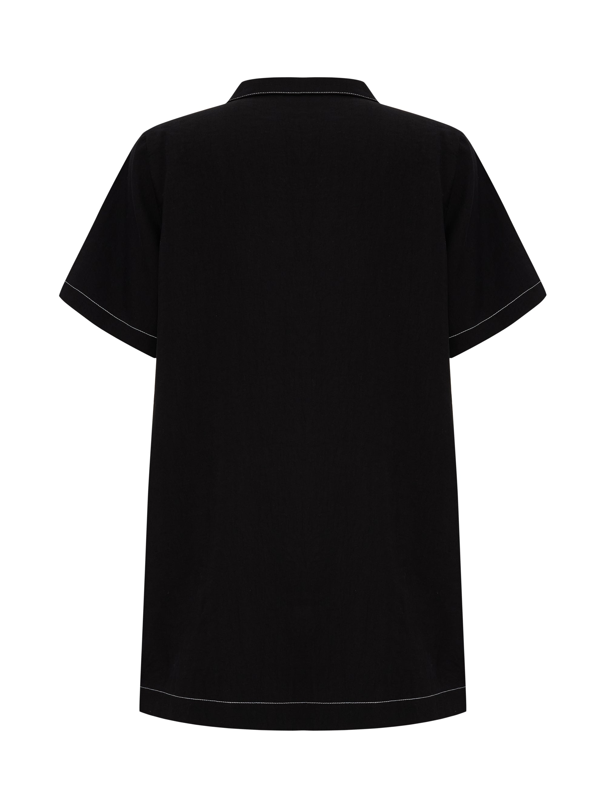 This mini dress features an oversized fit with a relaxed silhouette and subtle contrast stitching for a modern touch. The open collar and short sleeves add to its understated charm, making it a versatile go-to for everyday wear.
