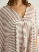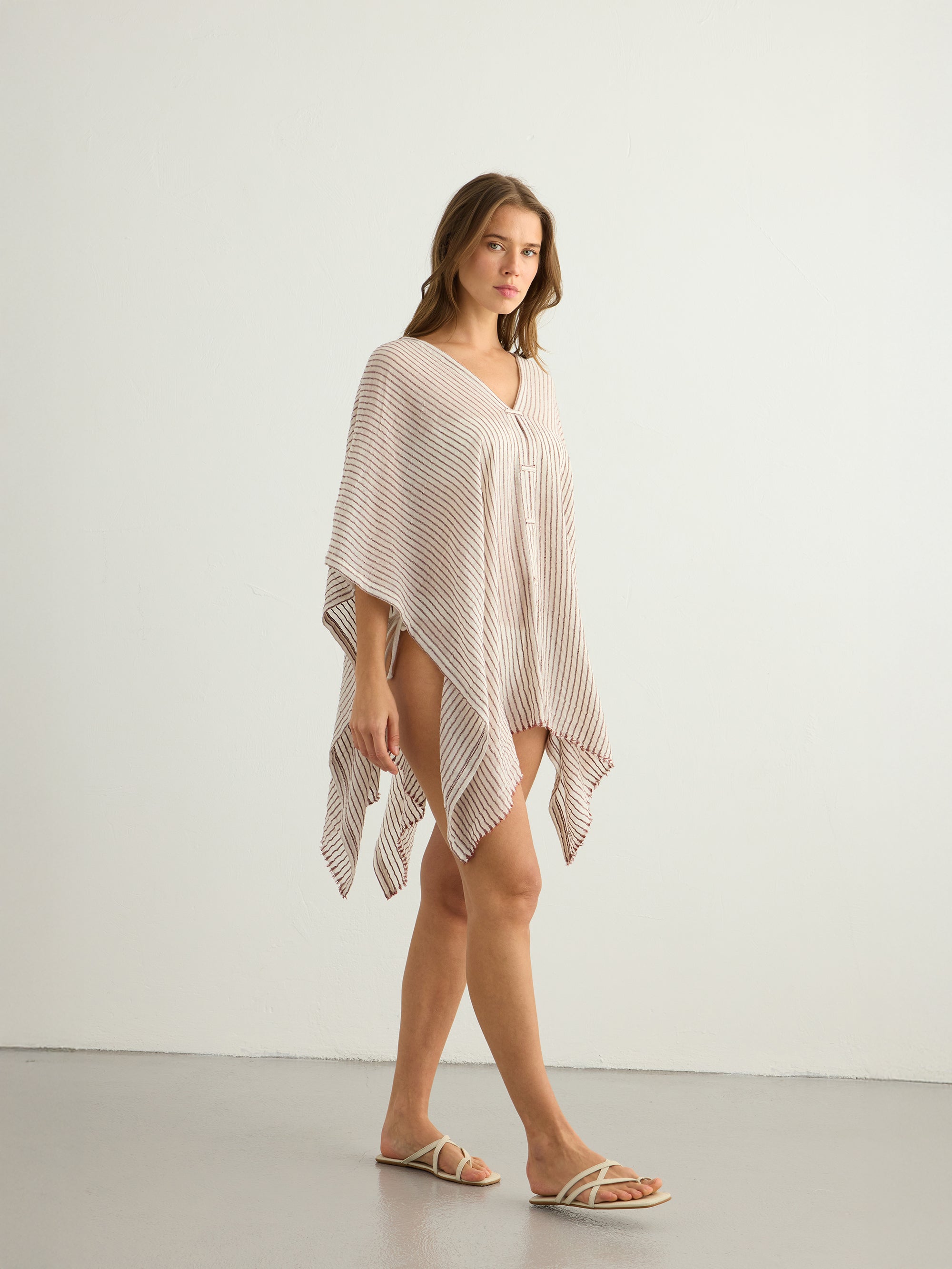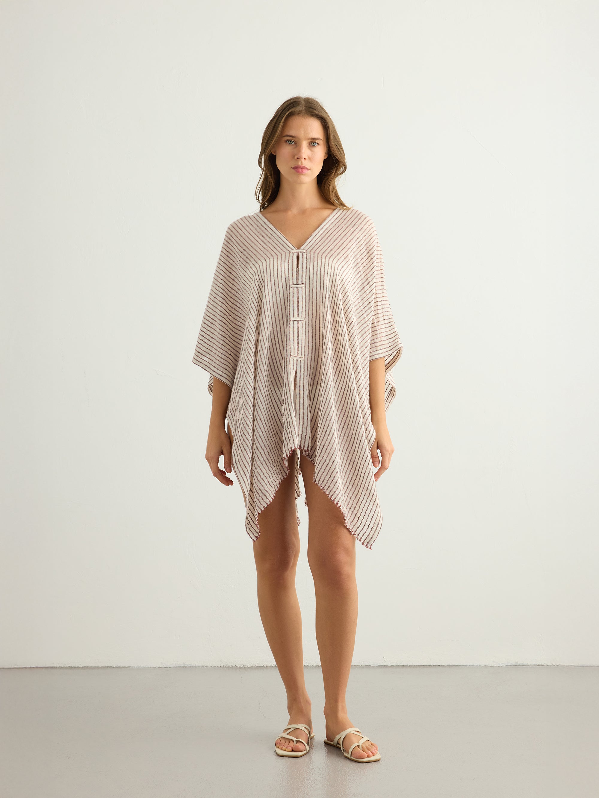 Make a memorable statement by the sea or in the lounge with the hand loomed Ava Kimono Burgundy Stripes. An asymmetric frayed hem along with side slits, add movement and flow to a roomy drape. Featured artisanal striped motifs woven into its flowy fabric which boasts a linen-like feel. Breathable fibers and naturally built-in cooling properties make this the perfect beach kaftan.