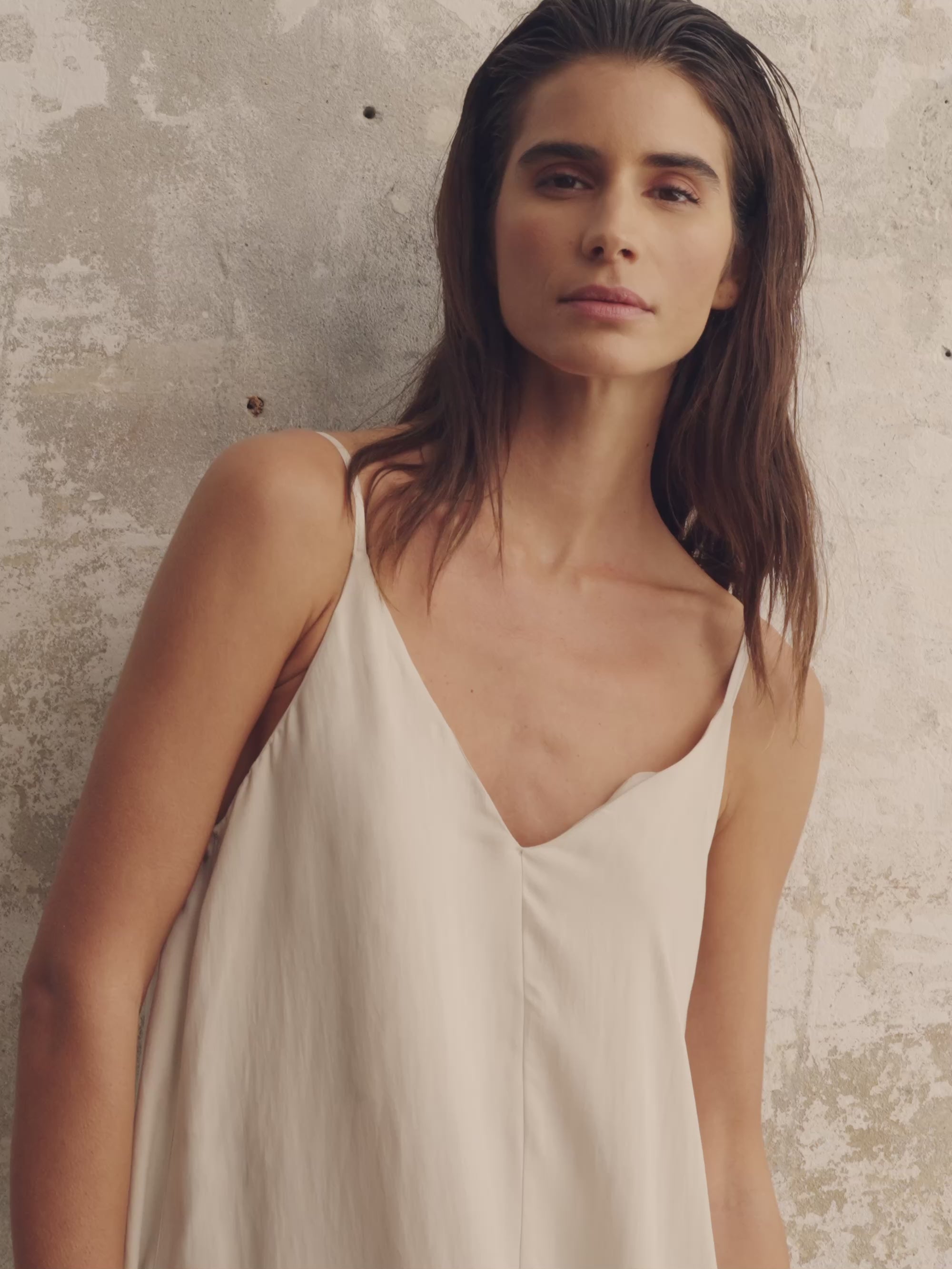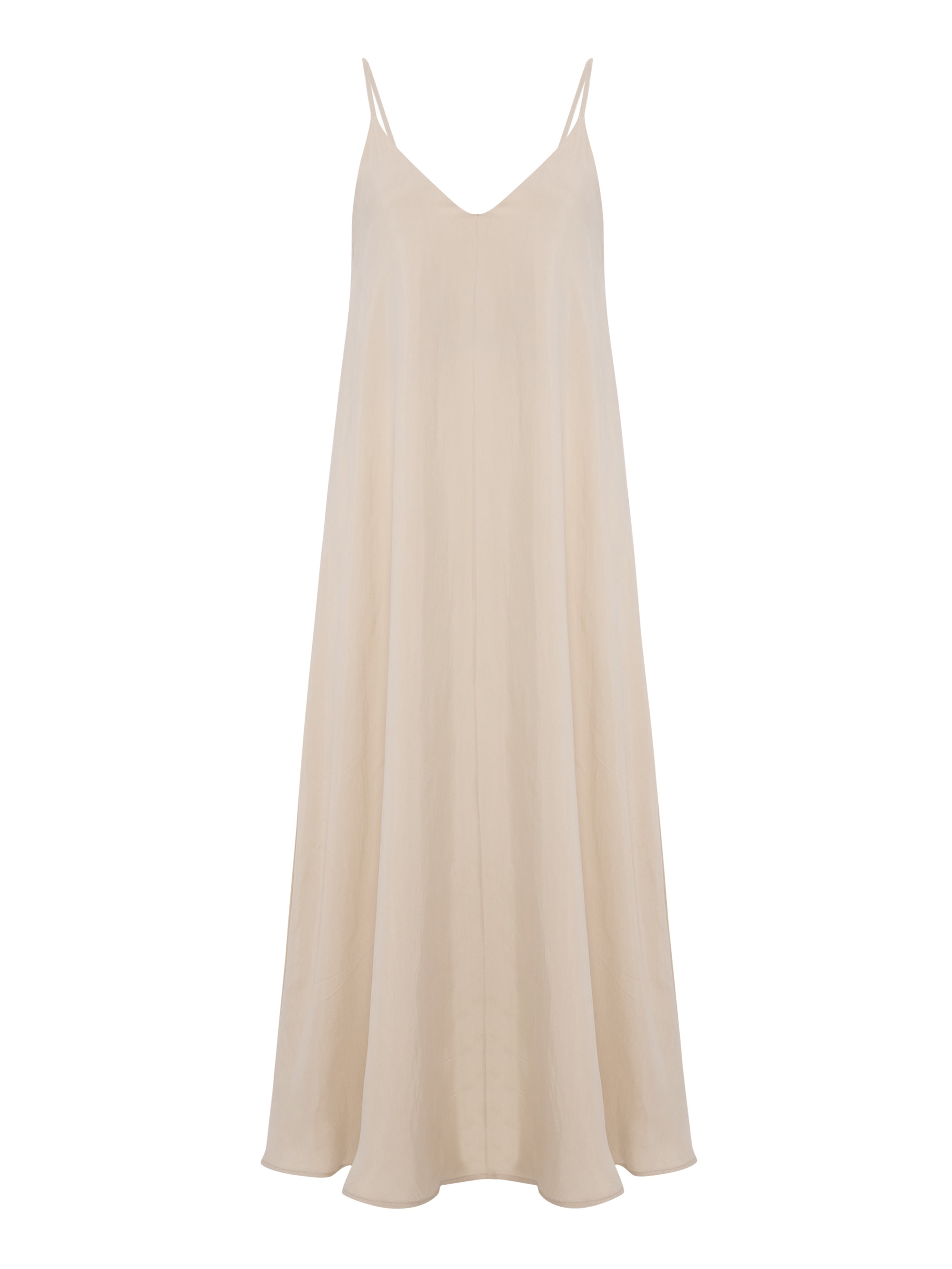 This voluminous summer style features a delicate V-neckline, slender adjustable straps, and a graceful silhouette. The lightweight fabric offers a subtle sheen and a luxurious drape. An elegant open-back detail adds sophistication, making it perfect for both relaxed days and evening occasions.
