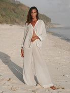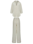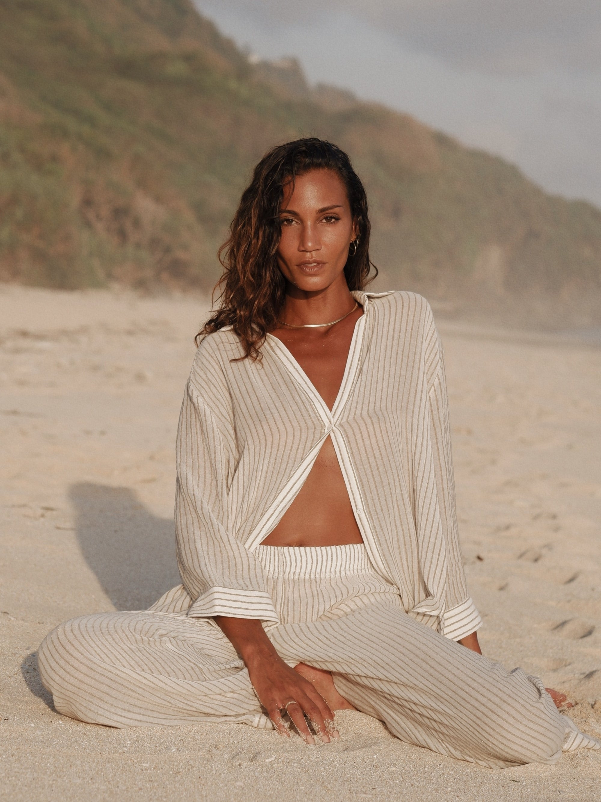 This modern Voyage Set Khaki Green Stripes brings a burst of energy for body, mind and style. 100% textured cotton cues calm and coastal while light texture brings freshness to your hot summer days. The Sheer Cotton makes you feel irresistibly comfy and comes with Voyage Pants.