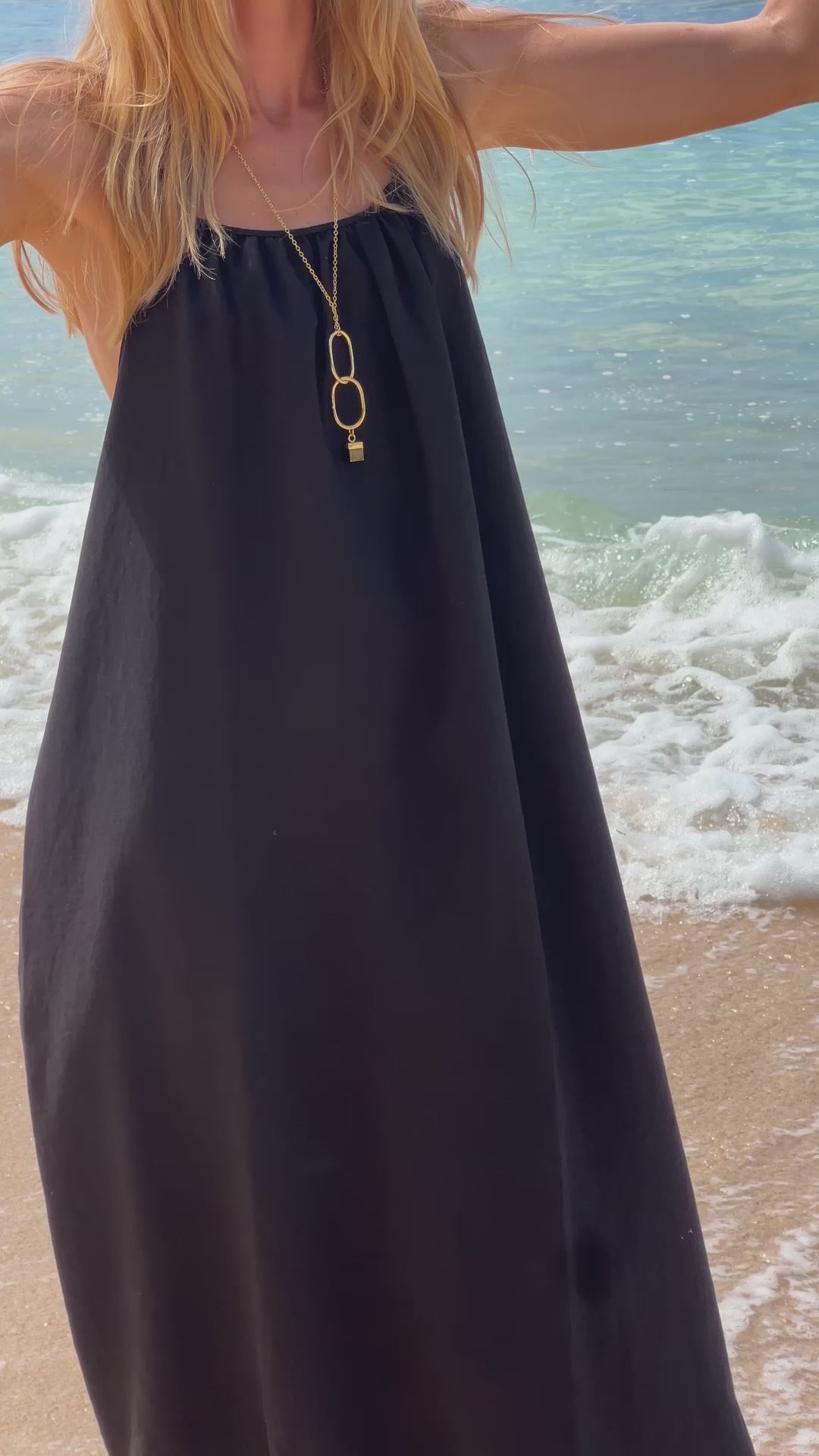 This maxi dress embodies effortless elegance with its simple yet refined silhouette. The delicate shoulder straps and softly gathered neckline enhance its minimalistic charm, while the relaxed fit offers an understated sense of sophistication. Designed with discreet side pockets, it merges practicality with a chic, flowing aesthetic.