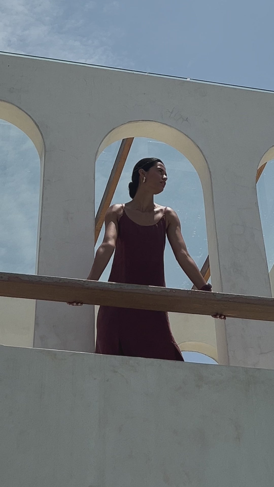 Featuring a feminine scoop neckline, slender adjustable straps, and a striking open-back bow detail, this maxi dress embodies effortless elegance. The fabric's subtle sheen and impeccable drape offer a luxurious finish. High front slits add an element of graceful movement, making it perfect for sunset soirées or sophisticated evenings.