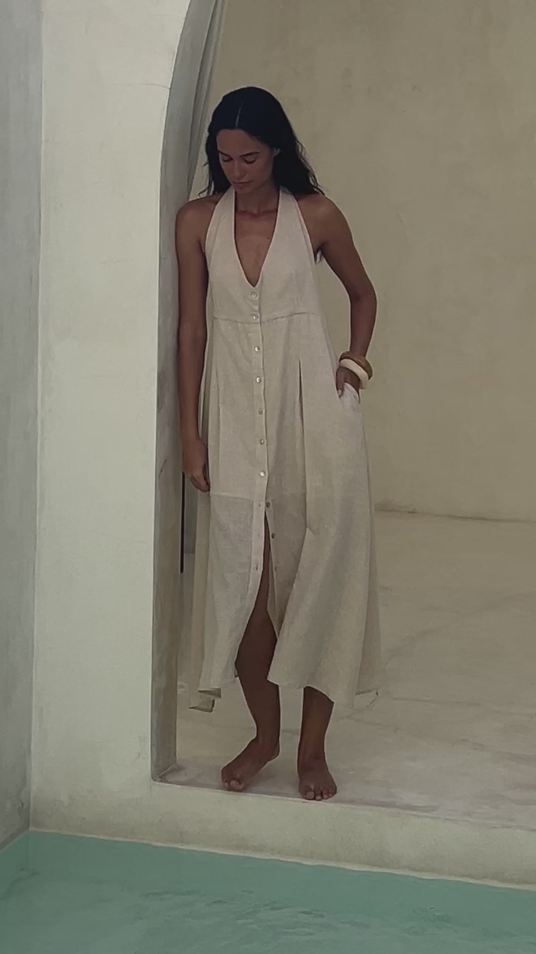 Crafted from 100% Turkish cotton, its lightweight and breathable fabric features a natural texture with a soft lining for added comfort, making it perfect for warm weather. Designed with a relaxed halter-style silhouette, it offers an adjustable bow-tie halter neckline and an open-back detail for a touch of sophistication. The button-down front adds a vintage-inspired charm, while the side button detail with a strap allows you to fold and adjust the skirt for customizable styling. Perfect for both casual outings and elevated occasions.