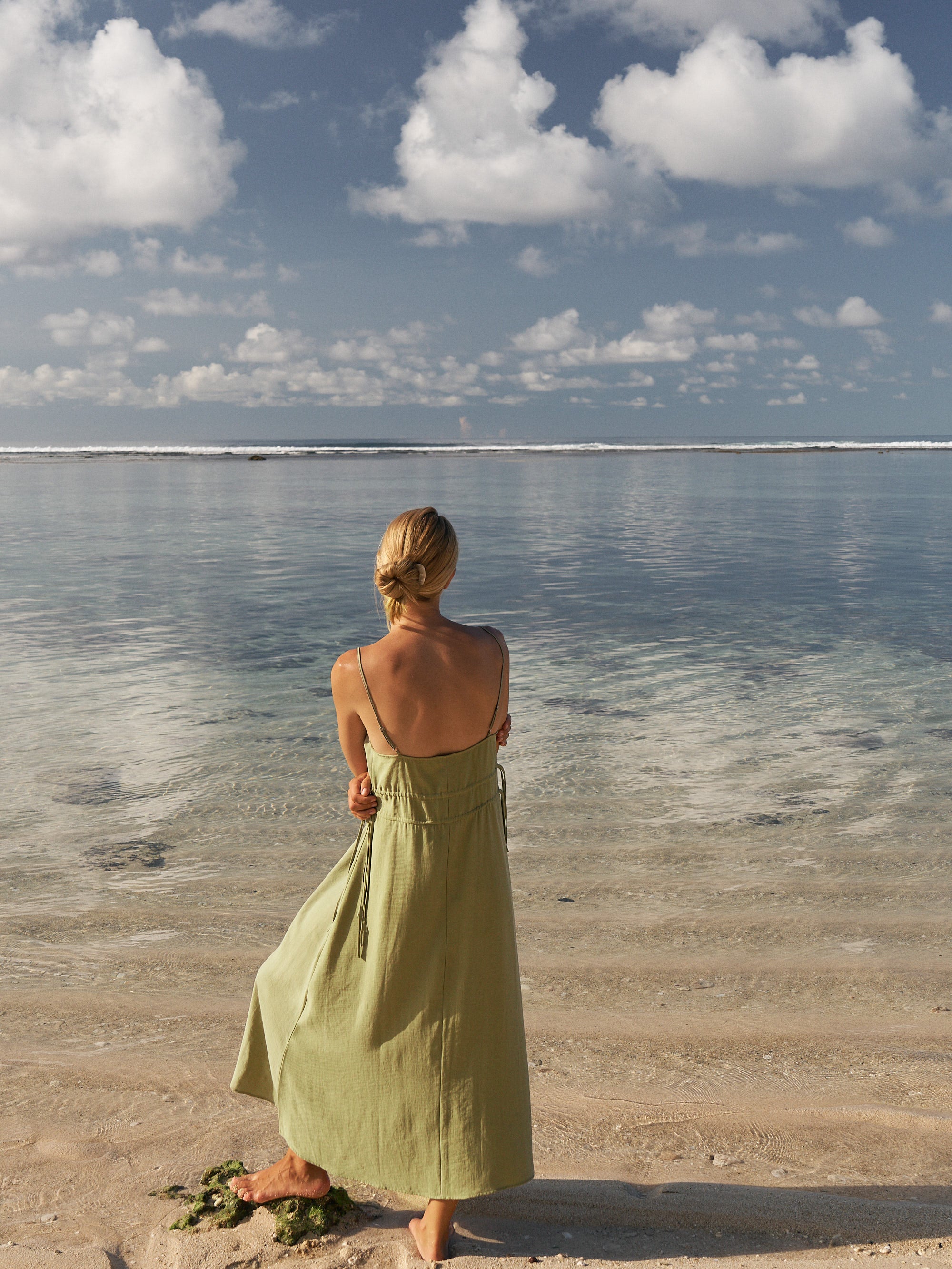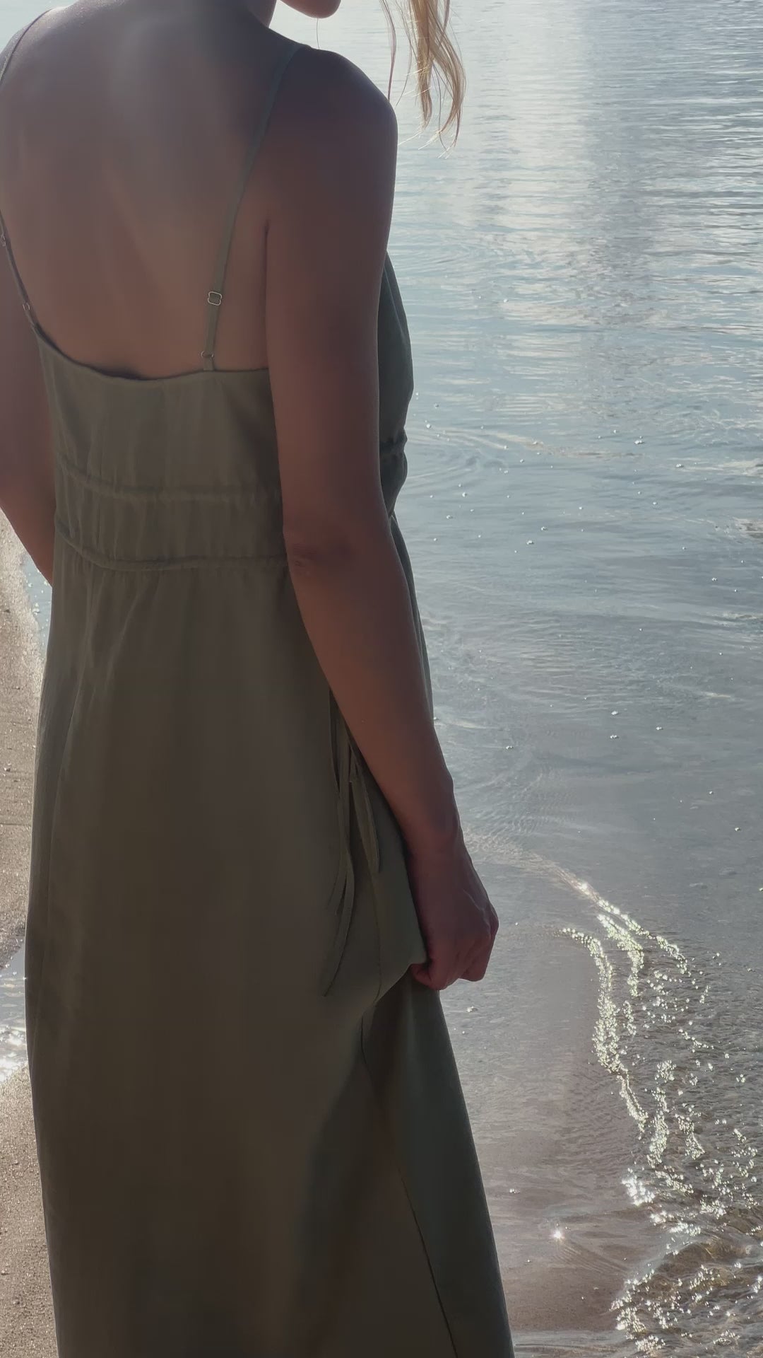 This maxi dress embodies effortless sophistication with a relaxed silhouette and fluid movement. The deep V-neckline and delicate shoulder straps create an elegant, feminine touch, while adjustable tie details at the sides allow for a customizable fit. Designed for versatility, it transitions seamlessly from day to night, making it a staple for any wardrobe.