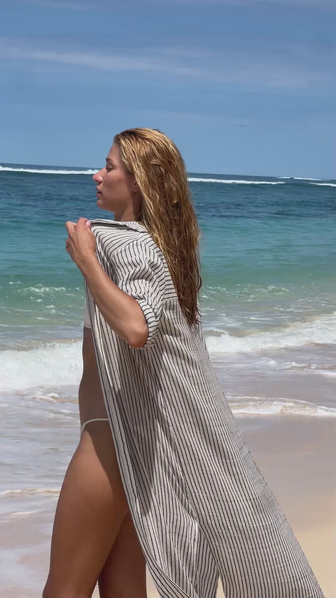 Featuring a button-down front and a relaxed fit, this versatile shirt dress offers effortless layering. Crafted from 100% Turkish cotton with soft, hand-loomed striped fabric, it can be worn open-front over swimwear or buttoned up as a chic beach cover-up. With a classic collar and rollable sleeves, it’s an essential addition to your summer wardrobe, perfect for beachside lounging or strolling through vacation days in style.