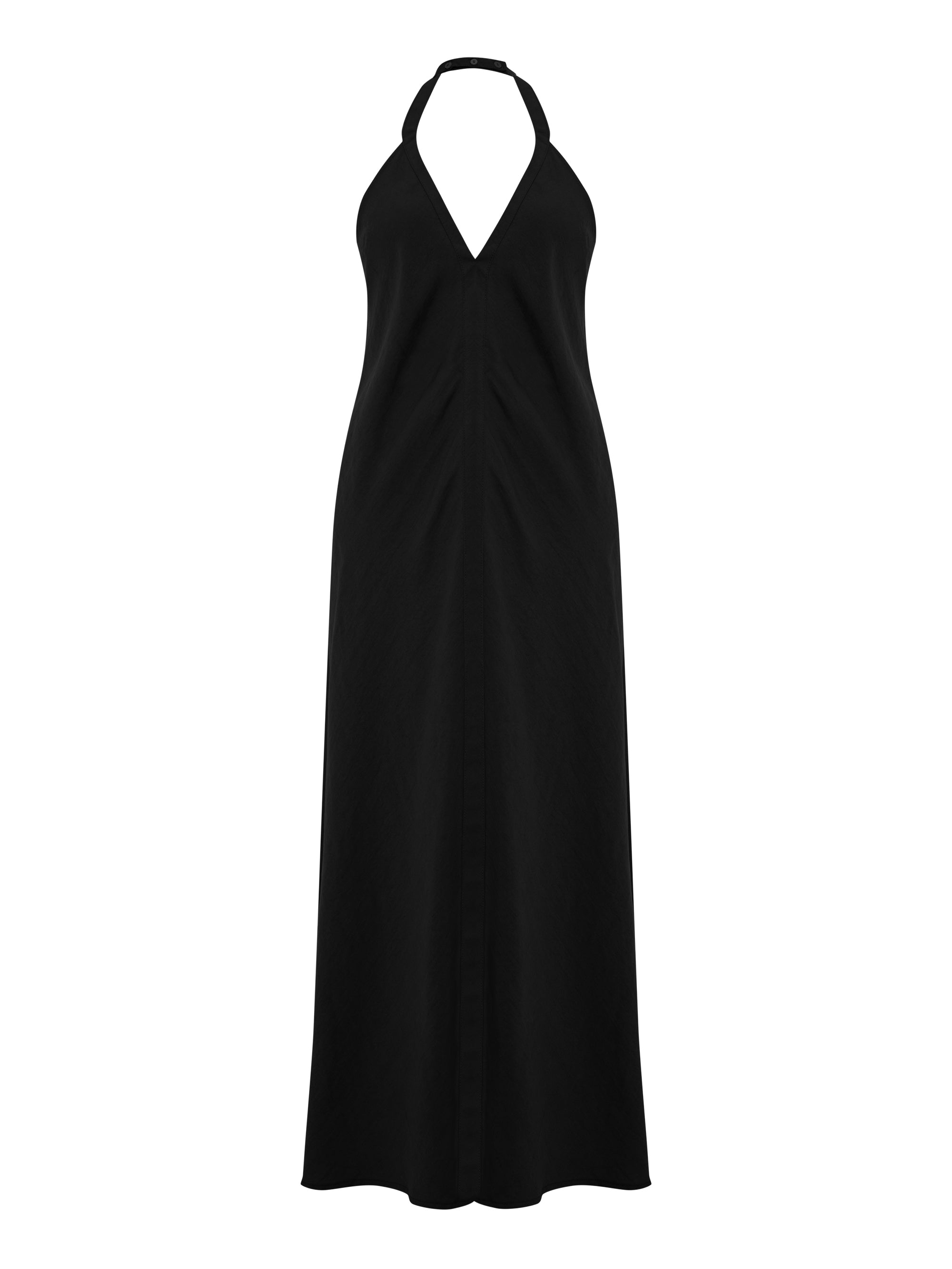 Effortless and refined, this maxi dress is designed to exude elegance with a modern edge. Featuring an open-back detail, a flowing wide-cut silhouette, and an adjustable halter neck with dual button closures, it combines ease and sophistication. The fabric offers a soft drape and a natural sheen. Perfect for any occasion, this versatile piece transitions seamlessly from daytime gatherings to evening events.