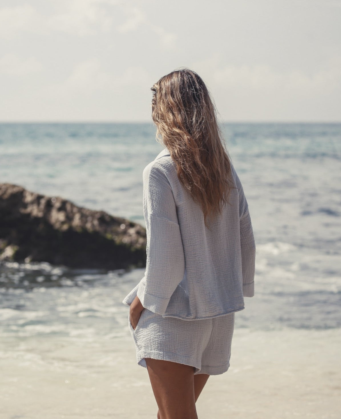 Effortless Echo Boy Short Baby Blue is an ideal style for brunch dates or a coffee break. Designed with a breeze from 70’s, will be a timeless piece in your wardrobe that withstands trends for supporting slow fashion. Made with sustainability in mind, this short features breathable fibers. This high elastic waisted short is slightly oversized with side pockets, allowing you to move freely throughout the day.