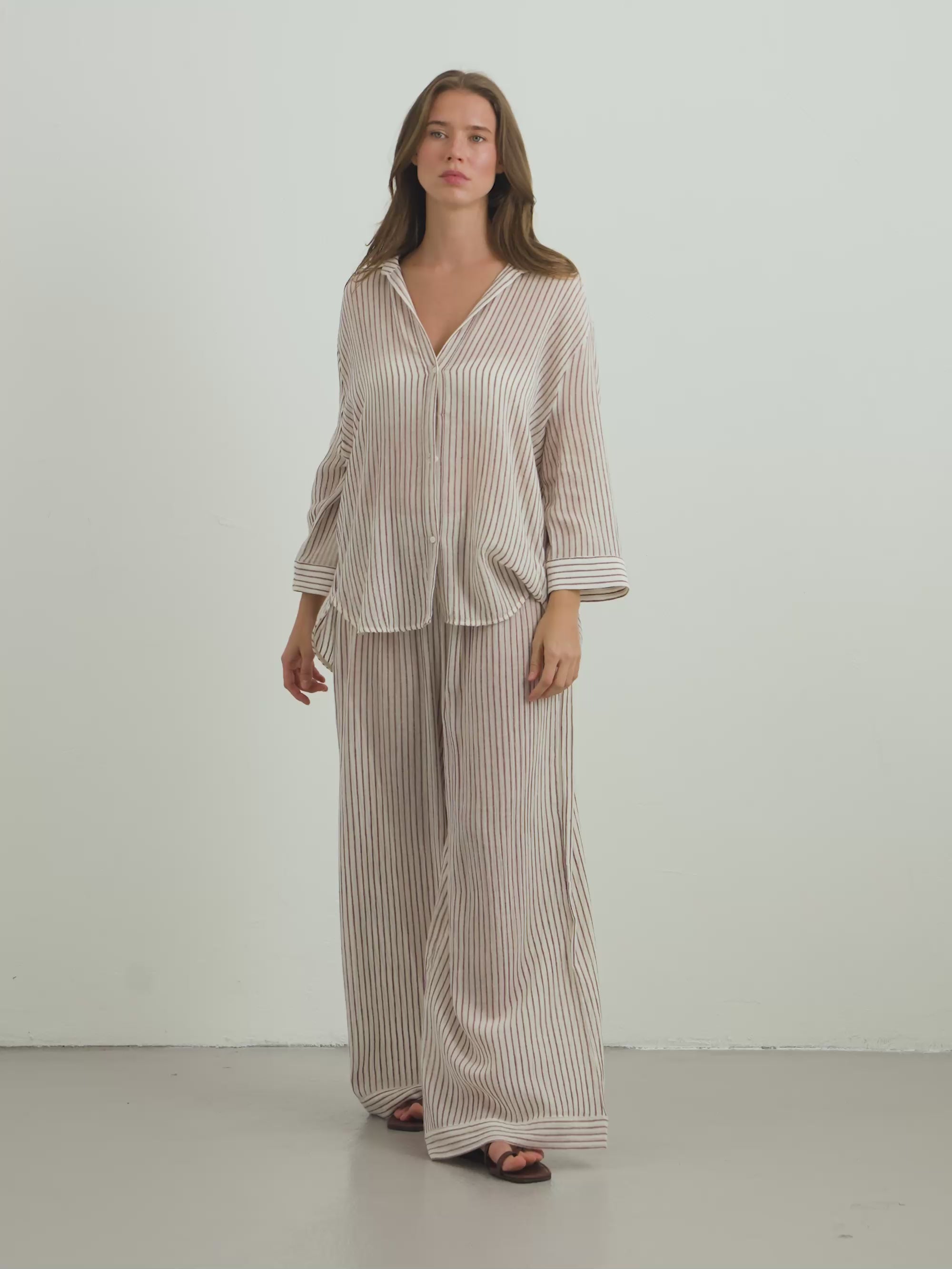 This modern Voyage Set Burgundy Stripes brings a burst of energy for body, mind and style. 100% textured cotton cues calm and coastal while light texture brings freshness to your hot summer days. The Sheer Cotton makes you feel irresistibly comfy and comes with a voyage Pant.