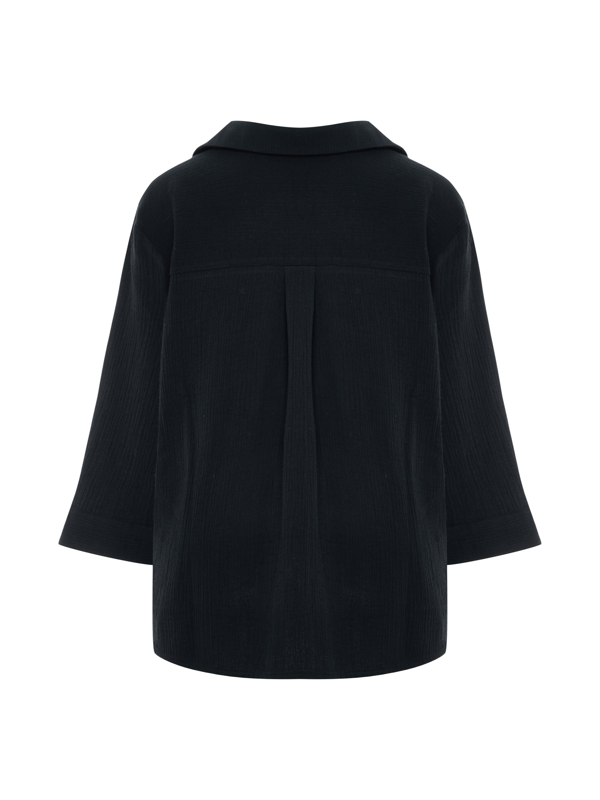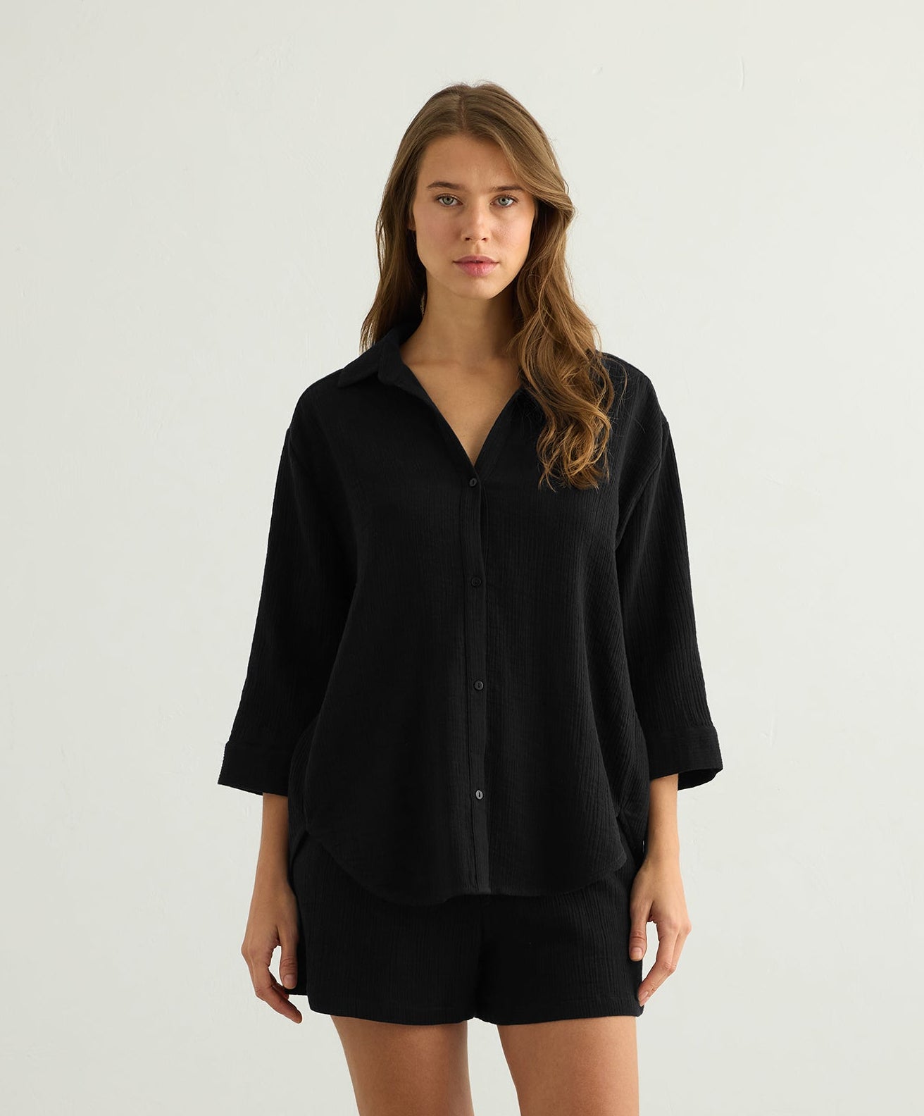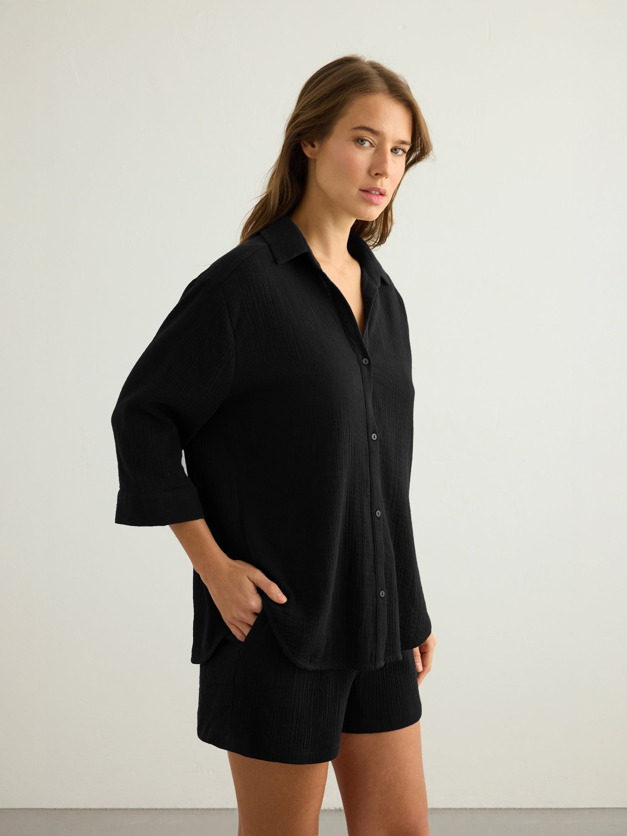Designed for everyday wear, this lightweight maxi shirt is cut in a relaxed, fluid silhouette that moves softly with the body. Crafted from breathable, textured fabric, it offers a light and airy feel for warm-weather days. Finished with a classic collar, button-down front and wide three-quarter sleeves, it is an effortless wardrobe staple for slow mornings, travel and long summer days. Wear it with the Aura Palazzo Pants or Aura Drawstring Shorts for an easy, coordinated set, or layer it open over swimwear for relaxed resort styling.