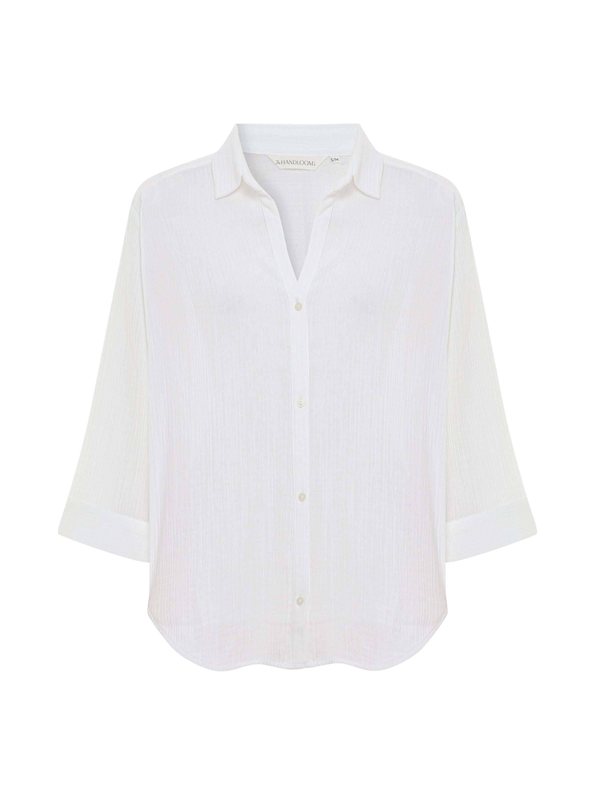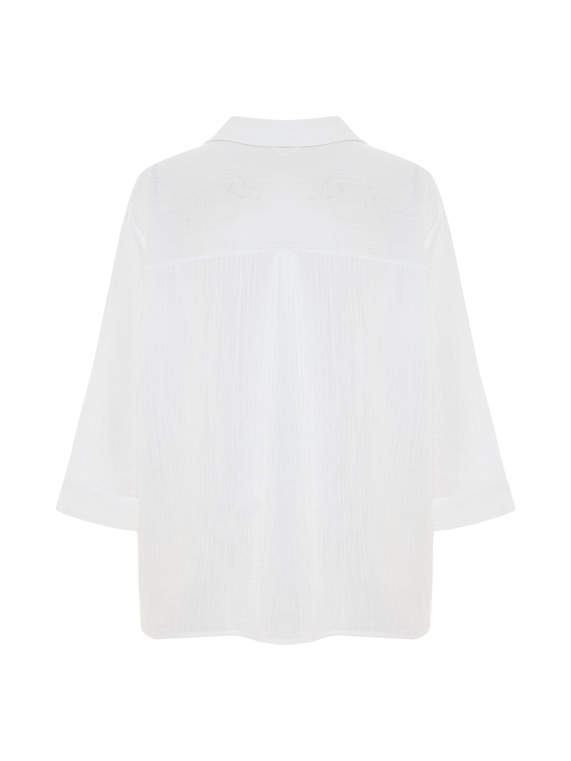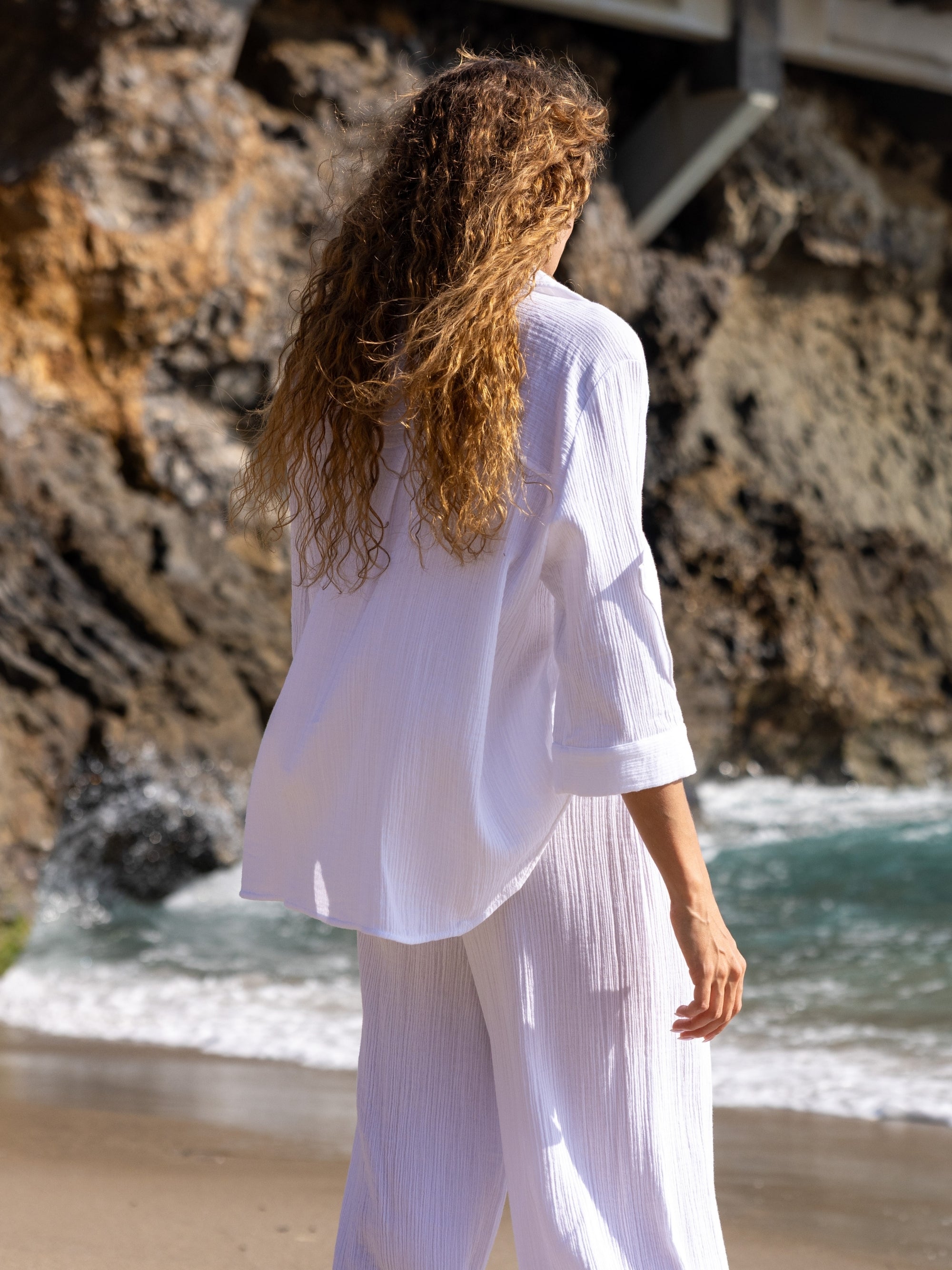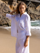 Designed for everyday wear, this lightweight maxi shirt is cut in a relaxed, fluid silhouette that moves softly with the body. Crafted from breathable, textured fabric, it offers a light and airy feel for warm-weather days. Finished with a classic collar, button-down front and wide three-quarter sleeves, it is an effortless wardrobe staple for slow mornings, travel and long summer days. Wear it with the Aura Palazzo Pants or Aura Drawstring Shorts for an easy, coordinated set, or layer it open over swimwear for relaxed resort styling.