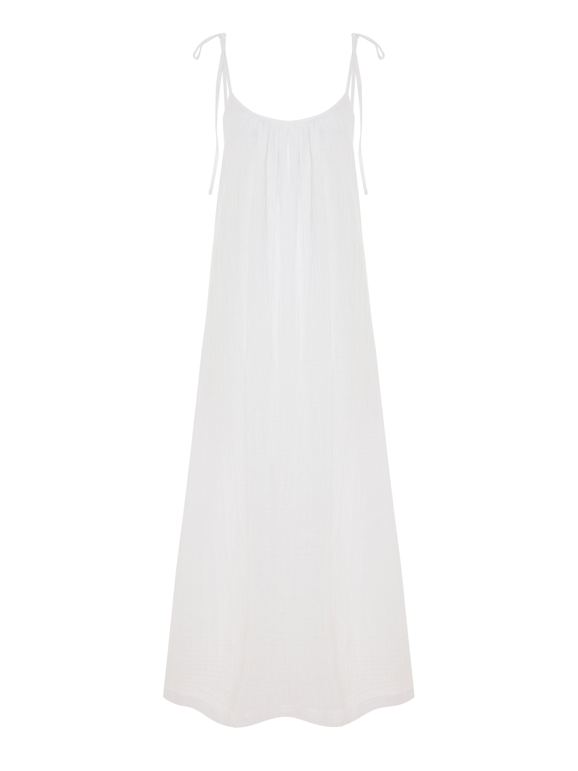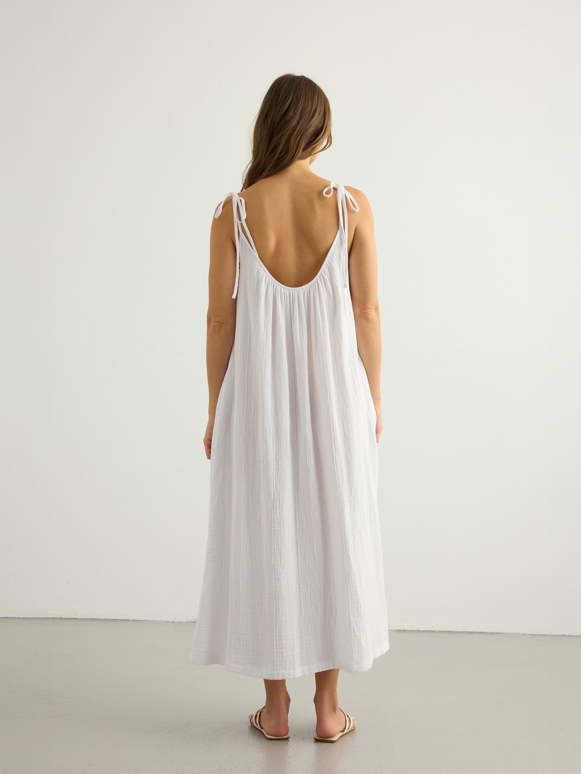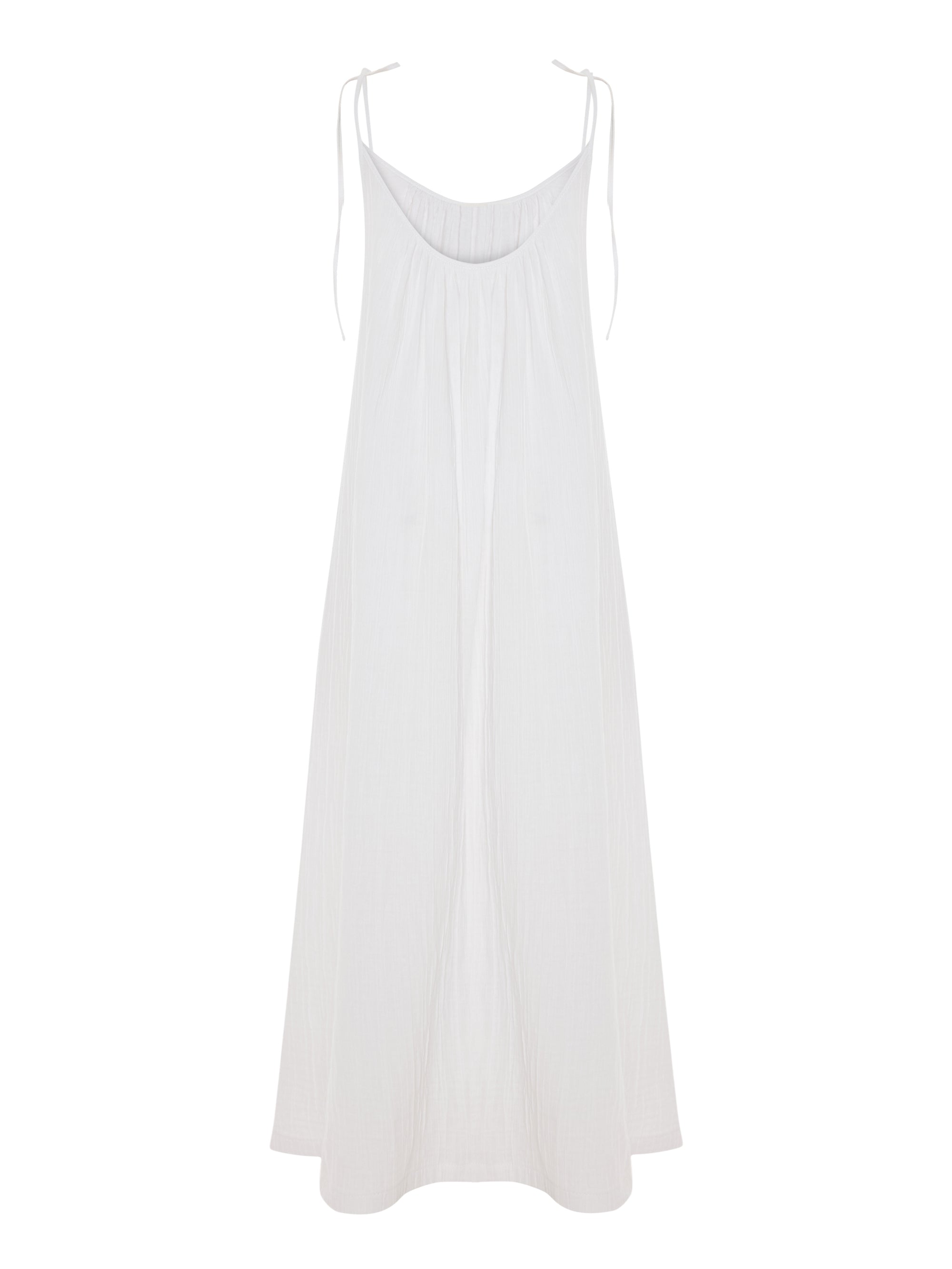 A softly draped maxi dress designed for slow summer days. Crafted from soft Turkish cotton with a lightweight, airy texture, this effortless silhouette features delicate tie straps and a gently gathered neckline that falls fluidly over the body. The relaxed shape moves beautifully with every step, creating an easy, understated elegance.