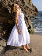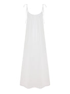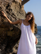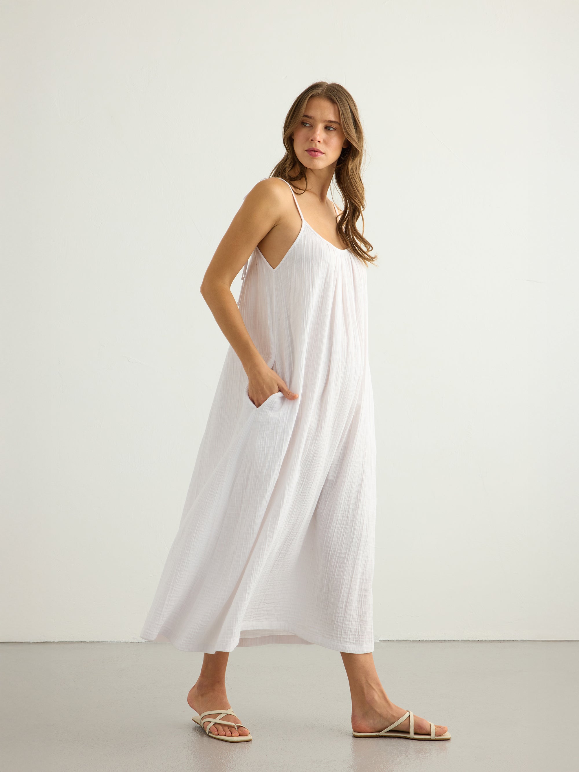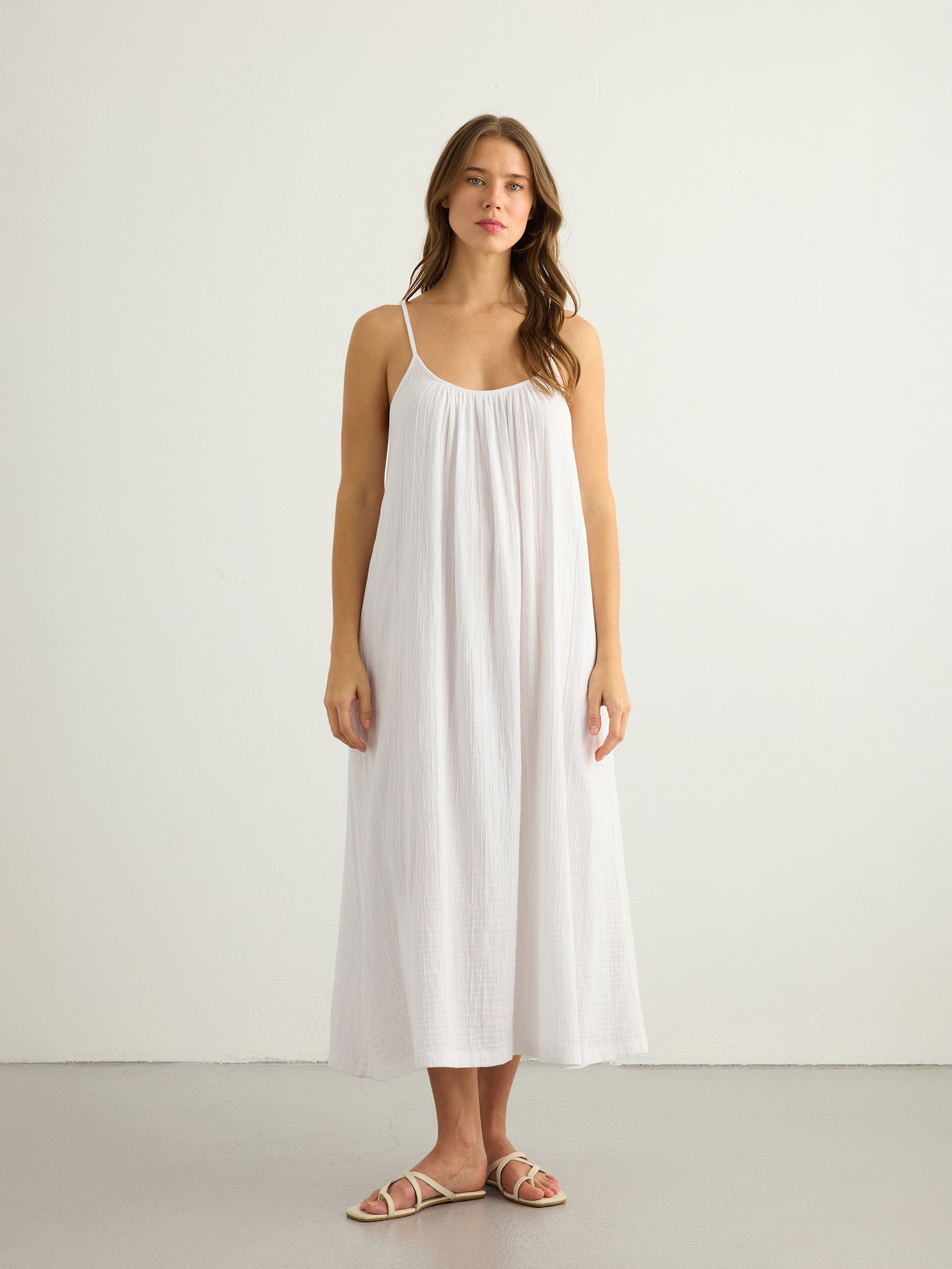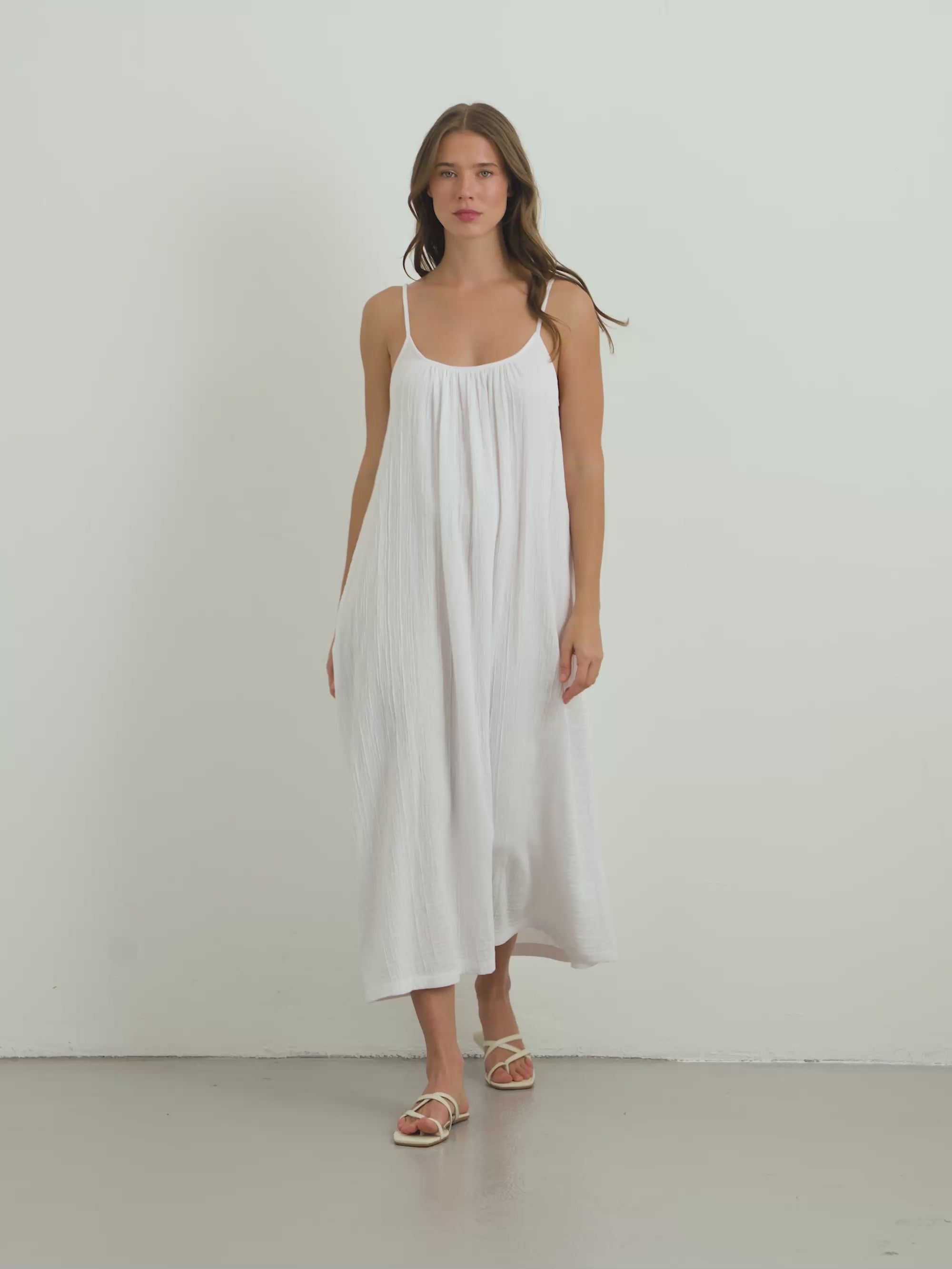 A softly draped maxi dress designed for slow summer days. Crafted from soft Turkish cotton with a lightweight, airy texture, this effortless silhouette features delicate tie straps and a gently gathered neckline that falls fluidly over the body. The relaxed shape moves beautifully with every step, creating an easy, understated elegance.