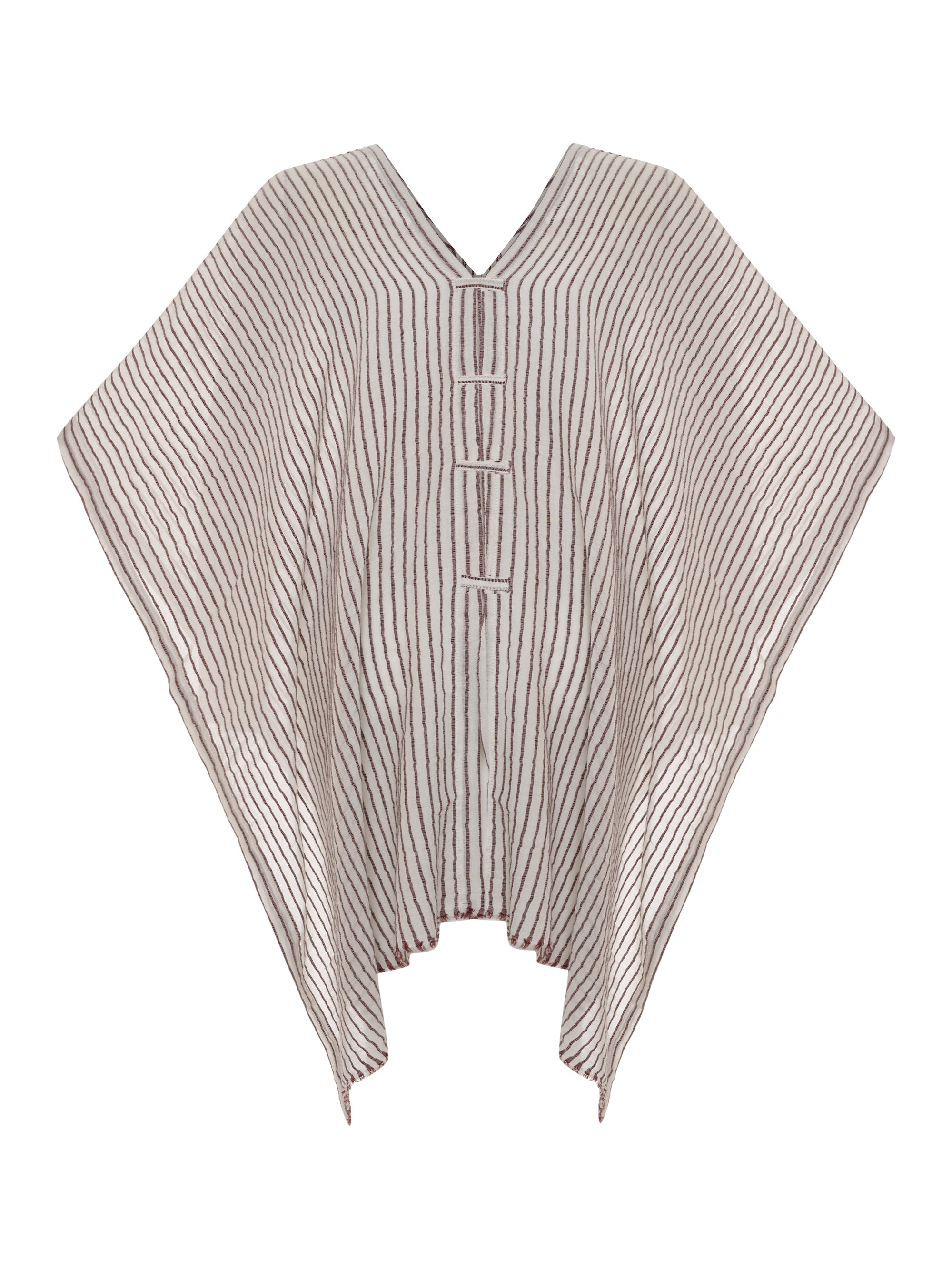 Make a memorable statement by the sea or in the lounge with the hand loomed Ava Kimono Burgundy Stripes. An asymmetric frayed hem along with side slits, add movement and flow to a roomy drape. Featured artisanal striped motifs woven into its flowy fabric which boasts a linen-like feel. Breathable fibers and naturally built-in cooling properties make this the perfect beach kaftan.