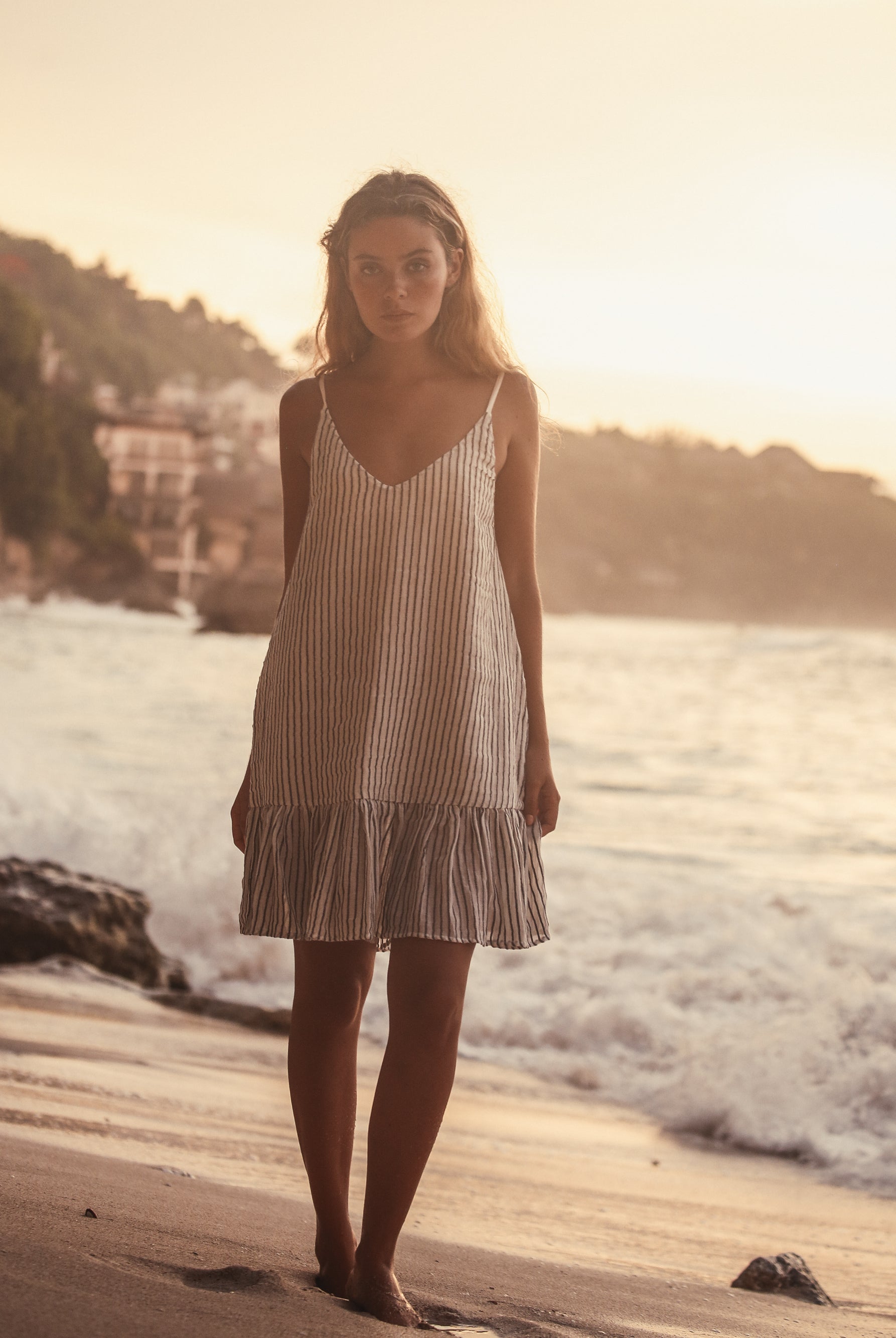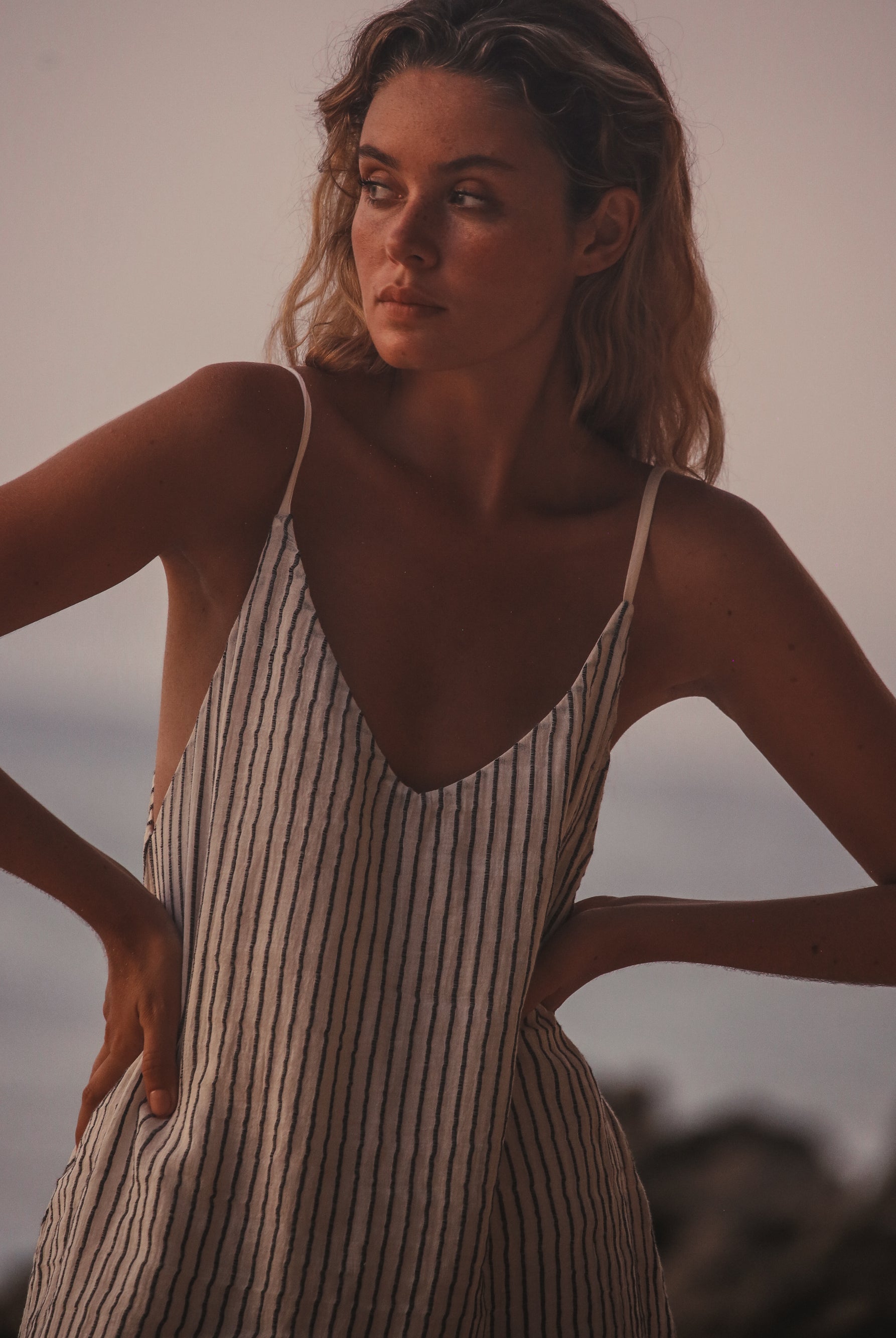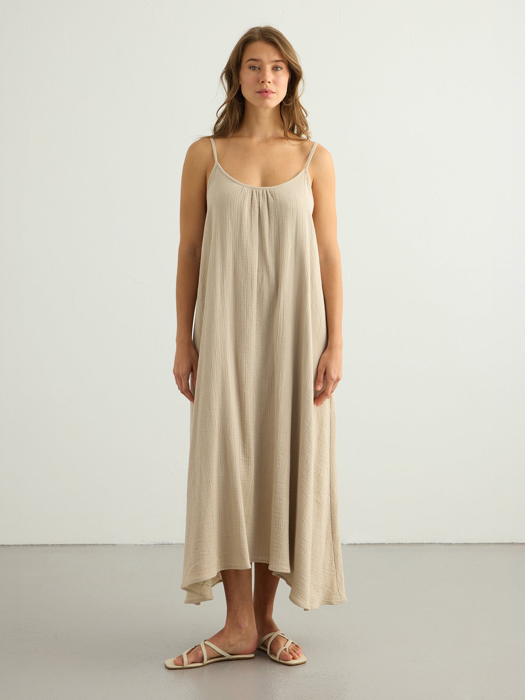 This lightweight maxi dress is designed to move effortlessly with the body, offering an elegant silhouette with a relaxed, fluid drape. Crafted from softly textured 100% Turkish cotton fabric, it features slender shoulder straps and a gentle scoop neckline for a feminine, understated look. The low back is finished with adjustable drawstring ties, allowing for a customizable fit while adding a refined design detail. An easy pull-on style, it is the perfect piece for warm-weather days and elevated summer evenings.