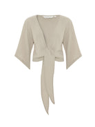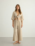 Designed for warm days and slow moments, this lightweight wrap top is cut in a relaxed, softly draped silhouette. Crafted from breathable, textured fabric, it feels light on the skin and moves effortlessly with the body. Featuring wide kimono-style sleeves and a long self-tie wrap detail, it allows for an adjustable fit while creating an easy, feminine shape. Style it with the Aura Palazzo Pants for an effortless summer set.