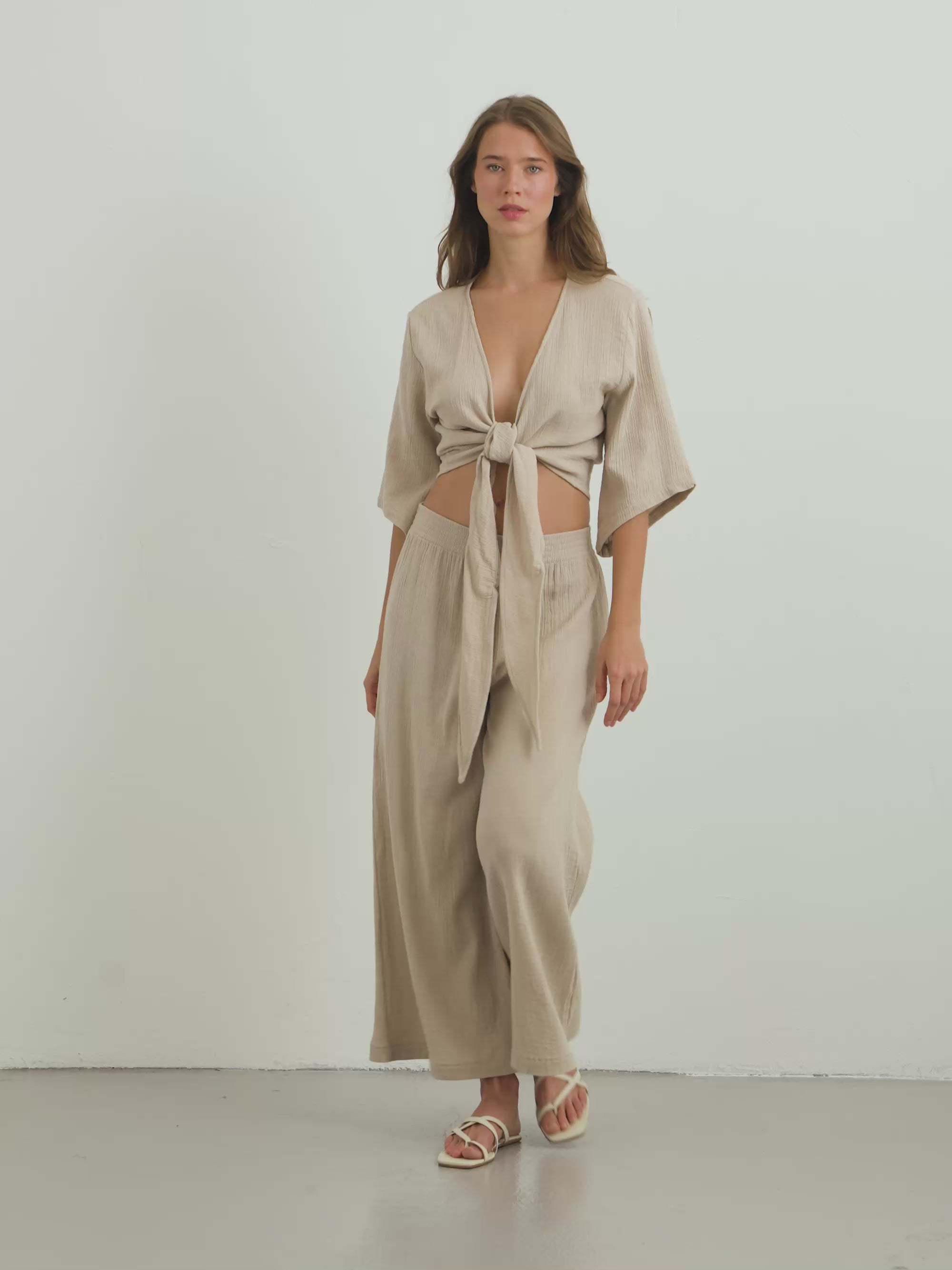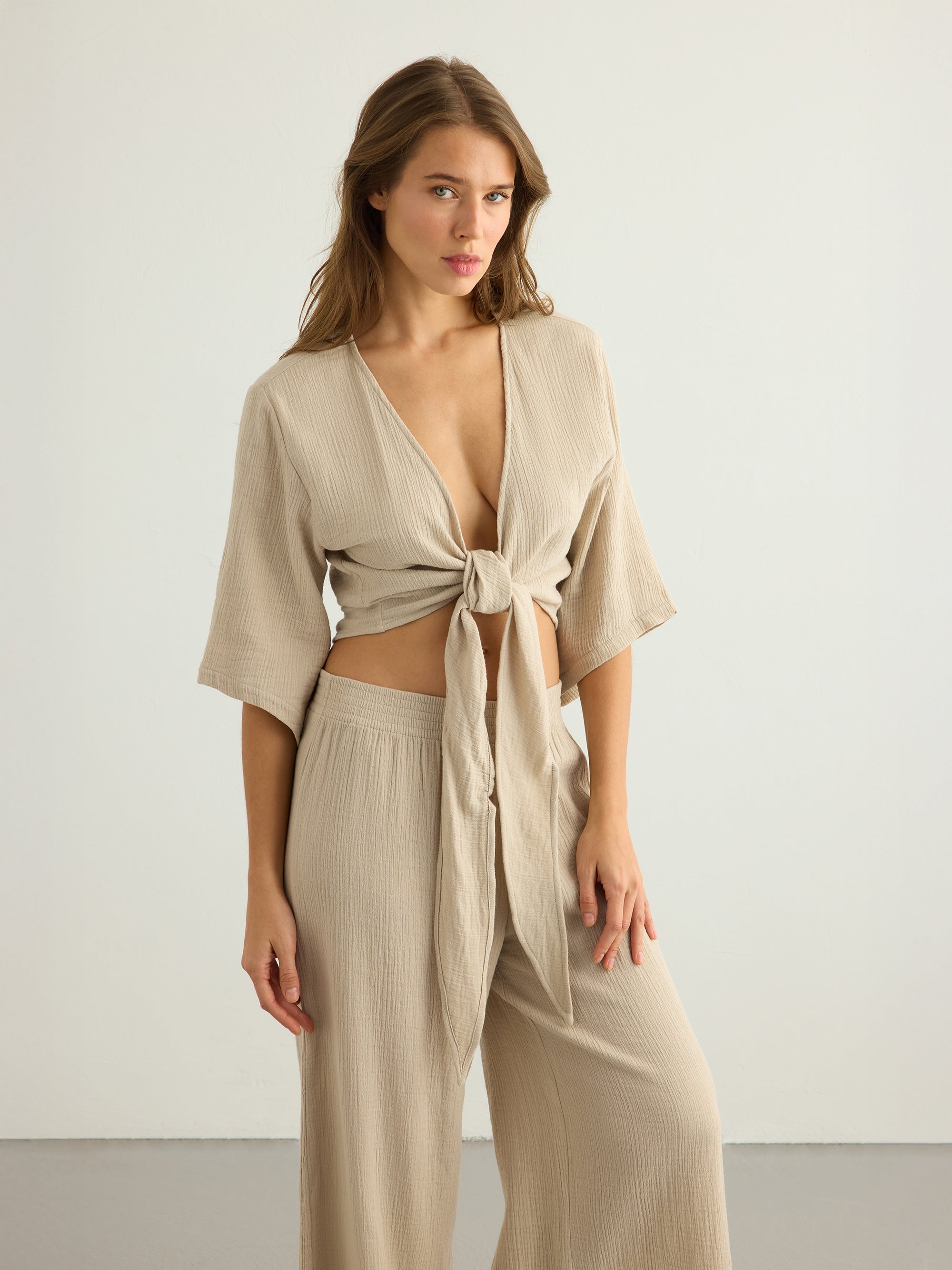 Wrap and tie it into a soft bow at the front for an easy, feminine shape, or wind the ties around the waist for a more defined silhouette. Wear it with relaxed trousers on warm afternoons or leave it open over a simple tank on sun-filled days. Finish with flat sandals and effortless summer ease.