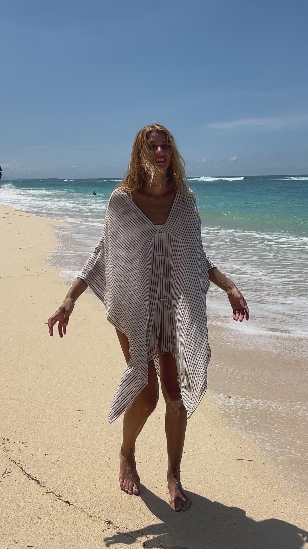 Make a memorable statement by the sea or in the lounge with the hand loomed Ava Kimono Burgundy Stripes. An asymmetric frayed hem along with side slits, add movement and flow to a roomy drape. Featured artisanal striped motifs woven into its flowy fabric which boasts a linen-like feel. Breathable fibers and naturally built-in cooling properties make this the perfect beach kaftan.