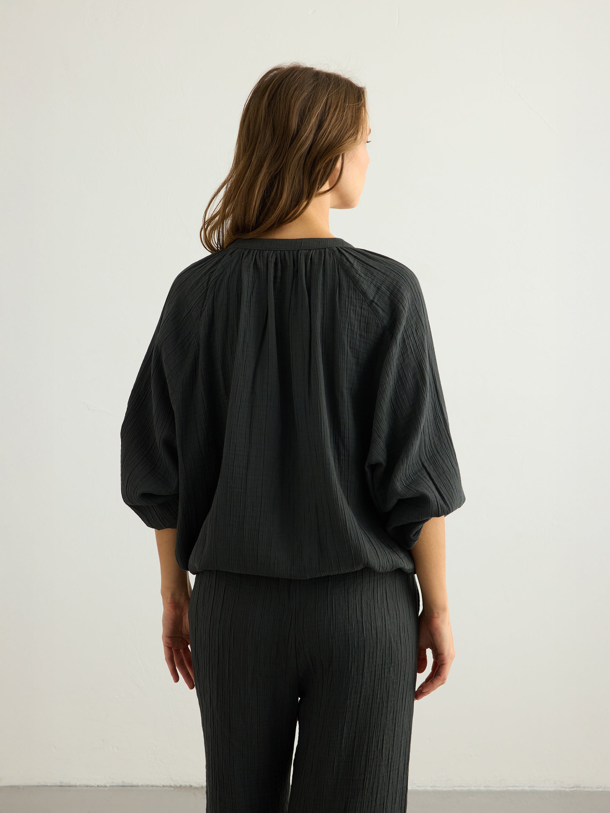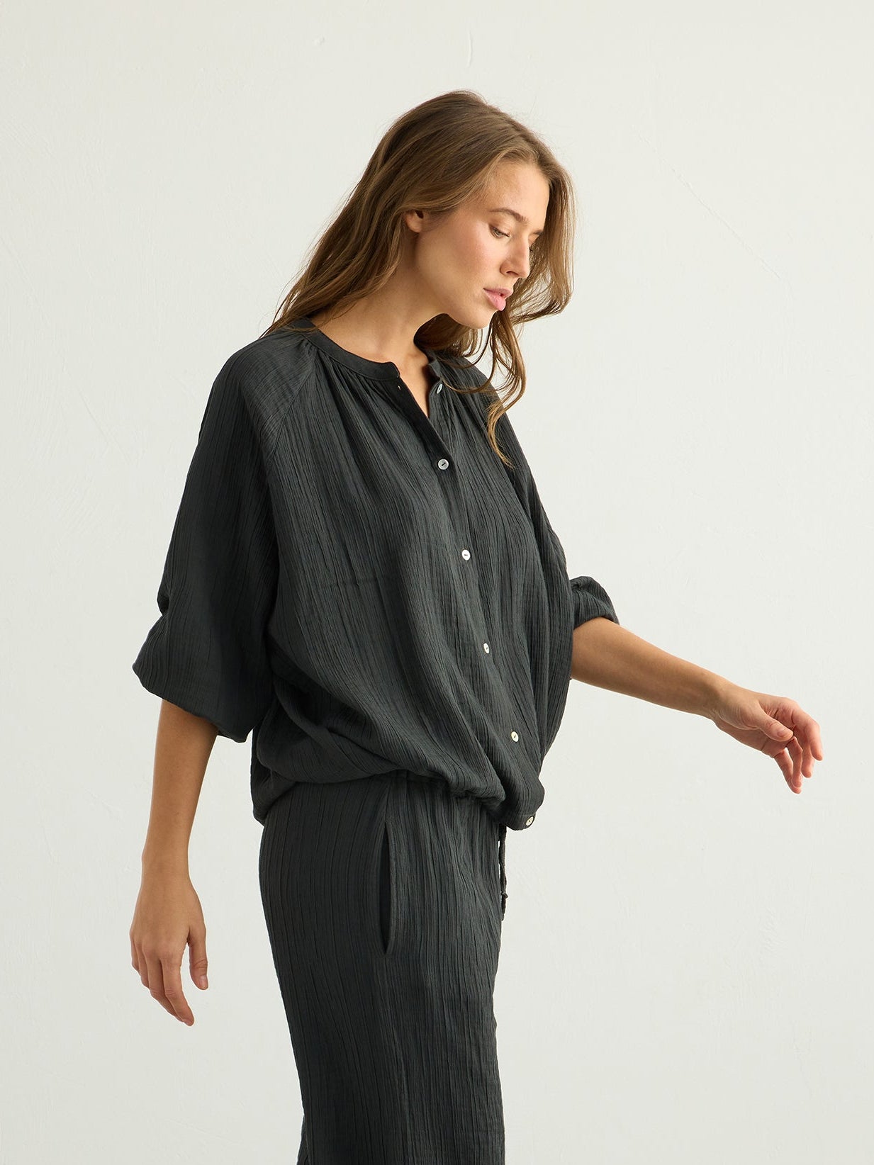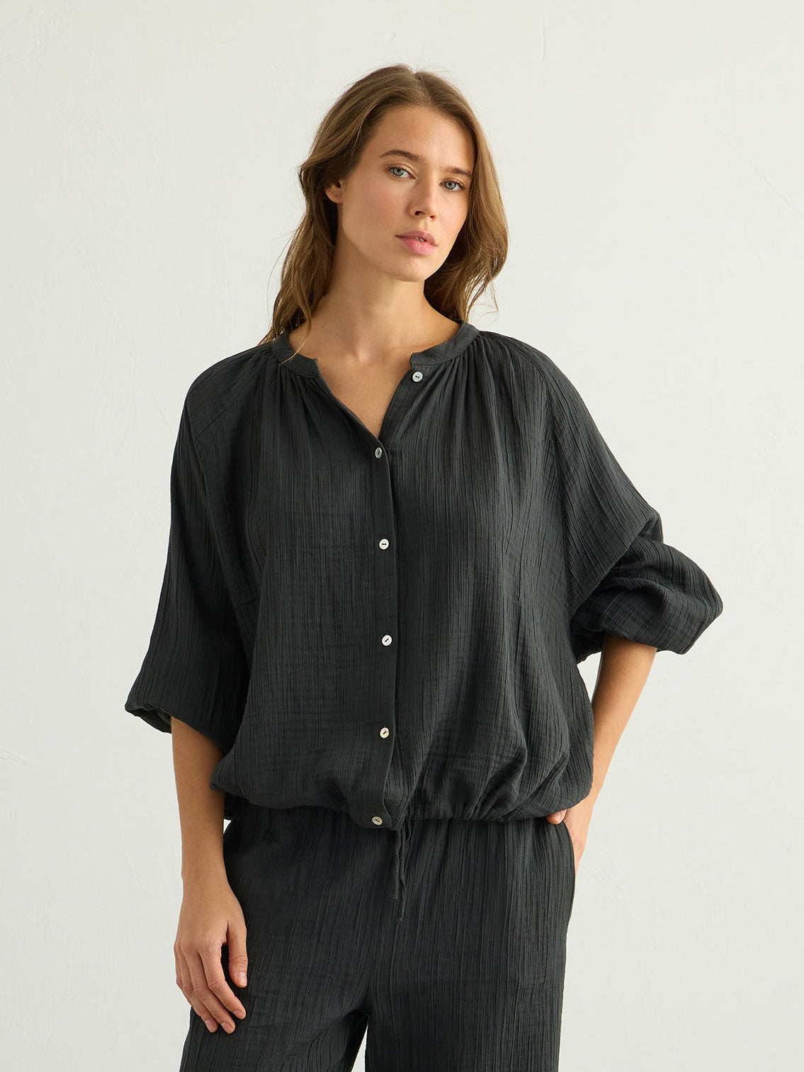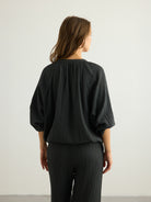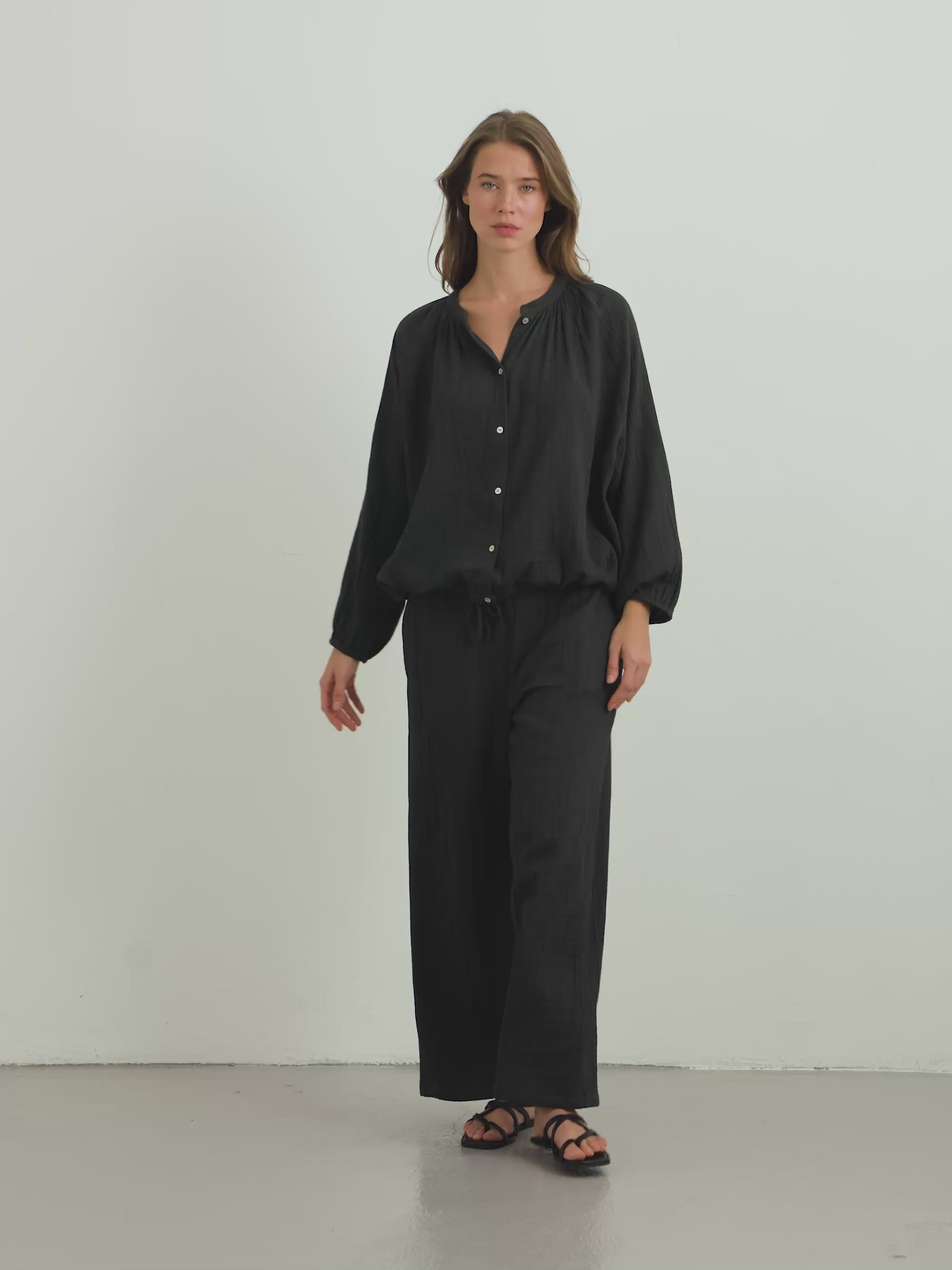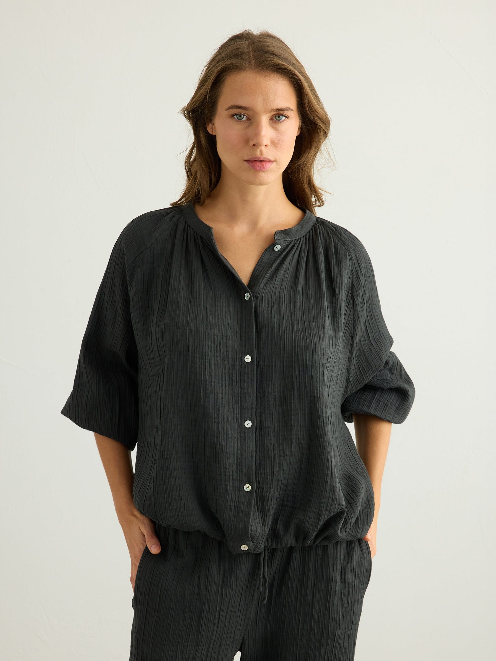 Designed for effortless everyday wear, this lightweight button-down blouse is cut in a relaxed, softly flowing silhouette. Crafted from soft Turkish cotton, it drapes gently over the body and feels easy on the skin. Featuring wide, voluminous sleeves with elasticated cuffs, a classic button-down front, and adjustable ties at the hem, it allows for a customizable fit and an easy, relaxed shape. It can be styled with the Kaya Drawstring Pants for an effortless, coordinated summer look.Wear it over your favourite jeans with one or two buttons left open for an easy, relaxed look.