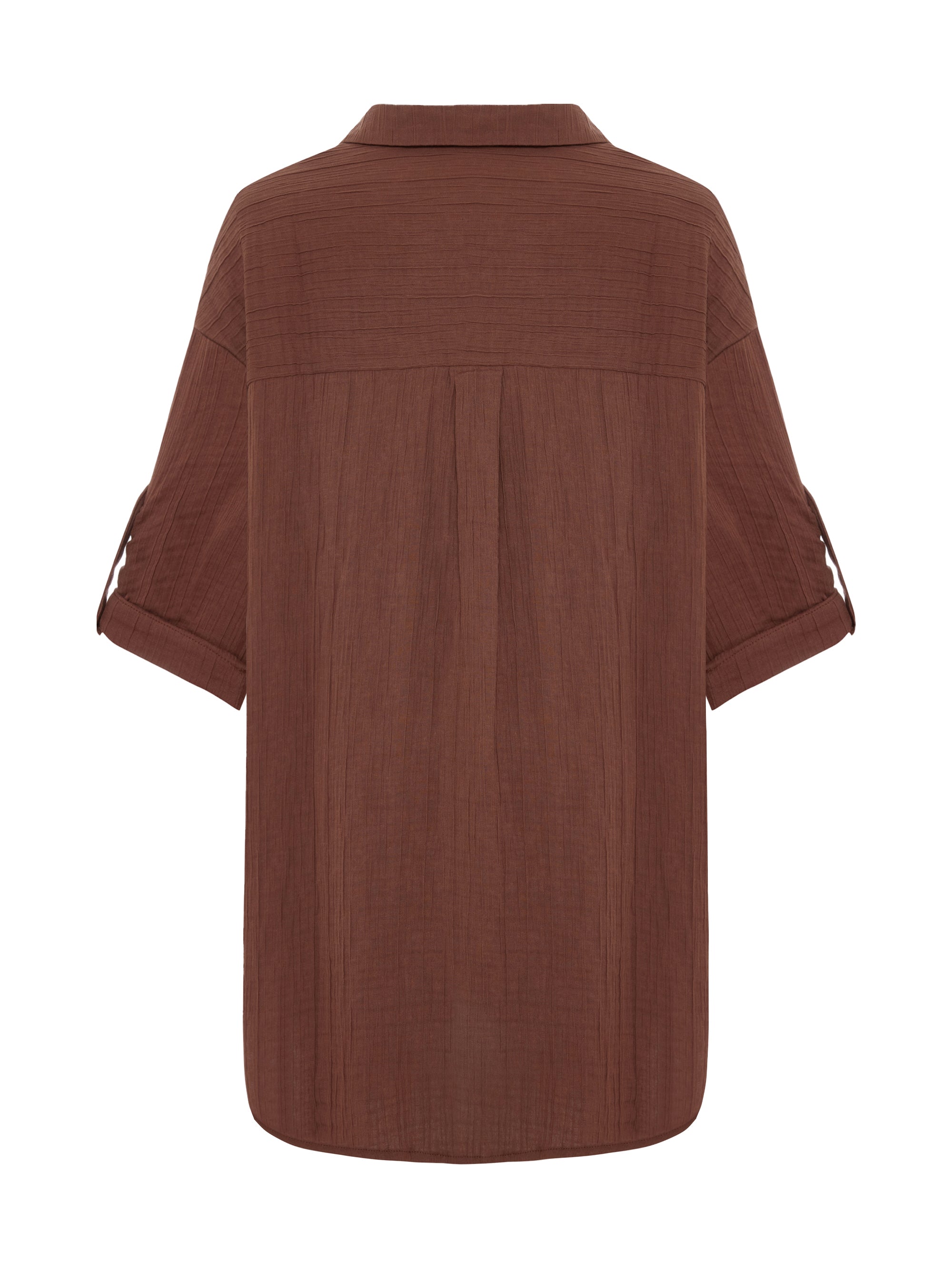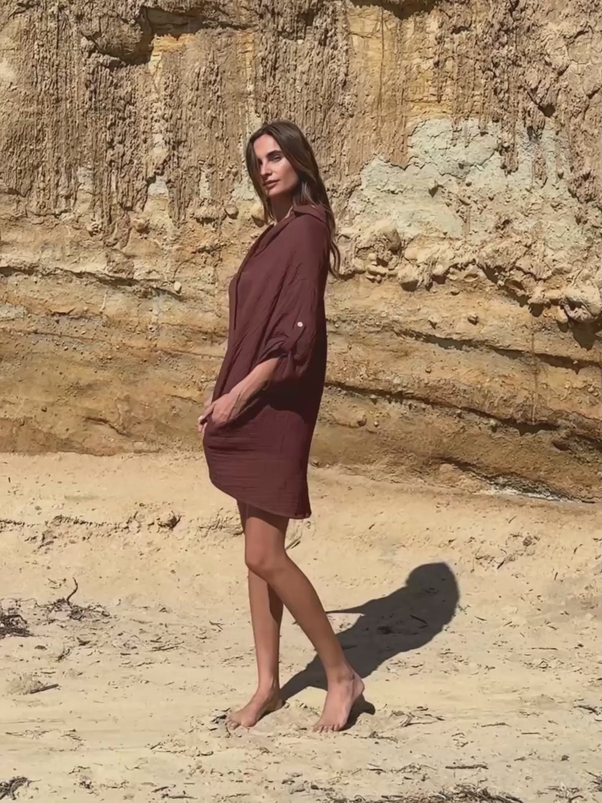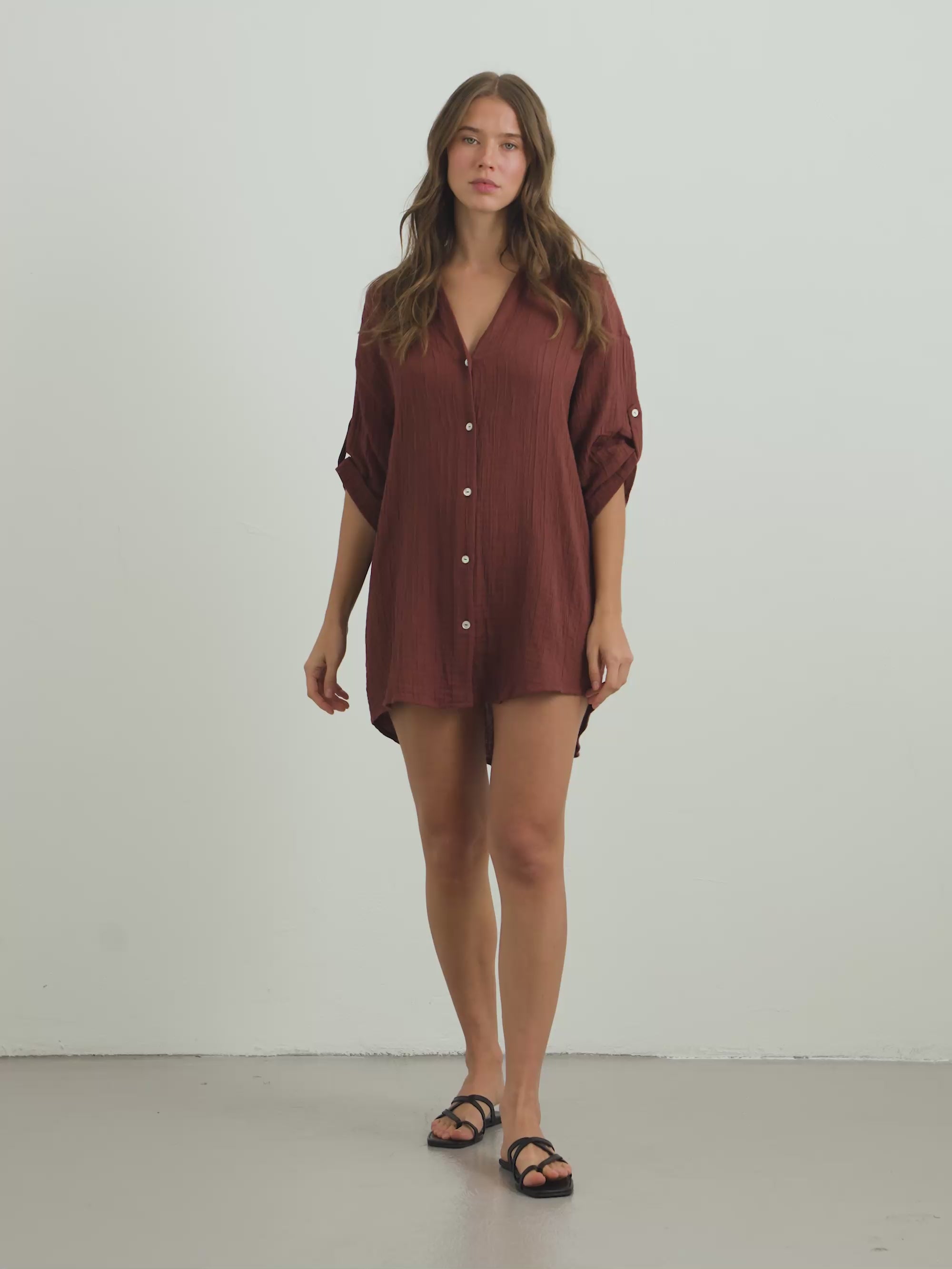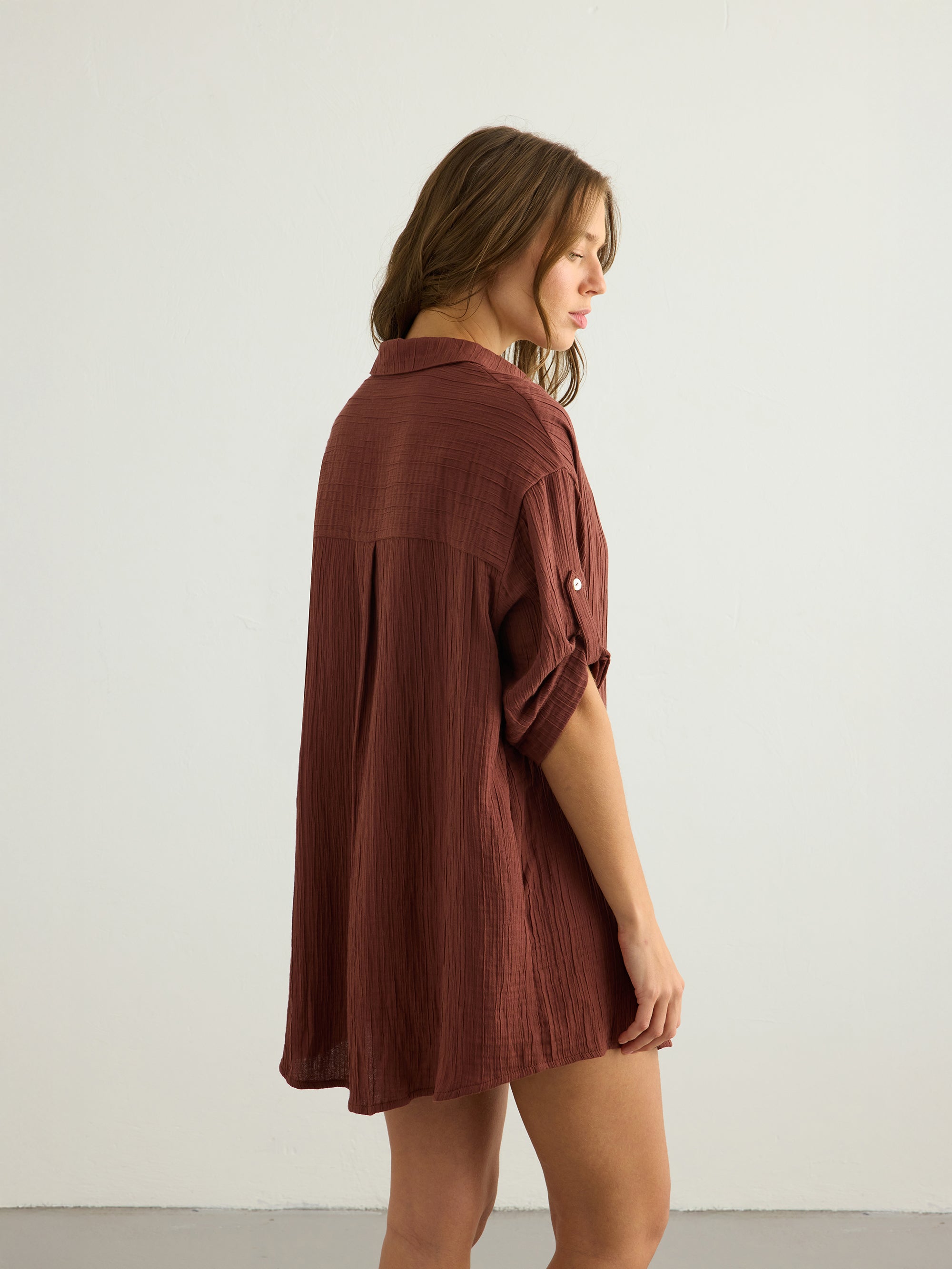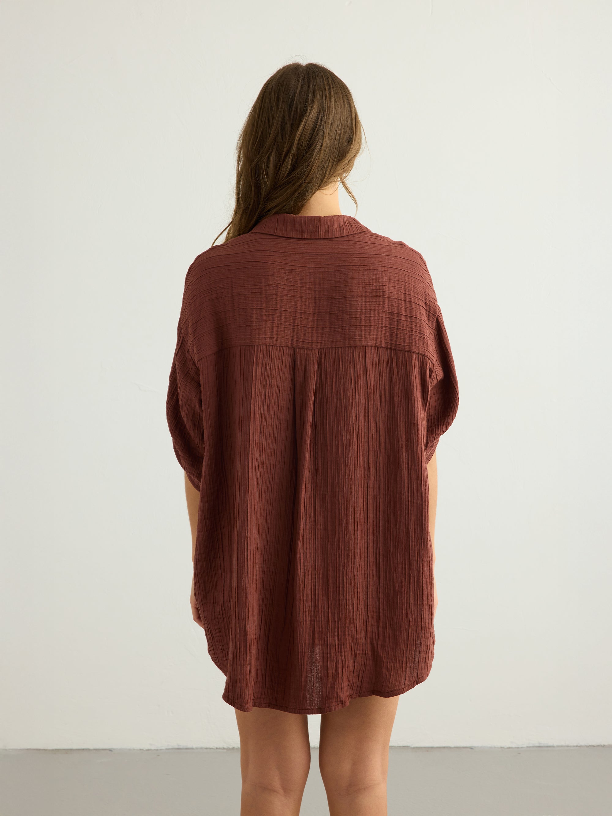 Designed with an effortless oversized silhouette, this shirt dress is crafted from soft Turkish cotton with a naturally textured finish. The relaxed shape is balanced by classic tailoring details, including a pointed collar, button-down front, and roll-up sleeves with buttoned tabs. A pleated back yoke adds subtle volume, while the curved hem creates an easy, fluid drape. It can be styled with Kaya Drawstring Shorts for an effortless warm-weather look.