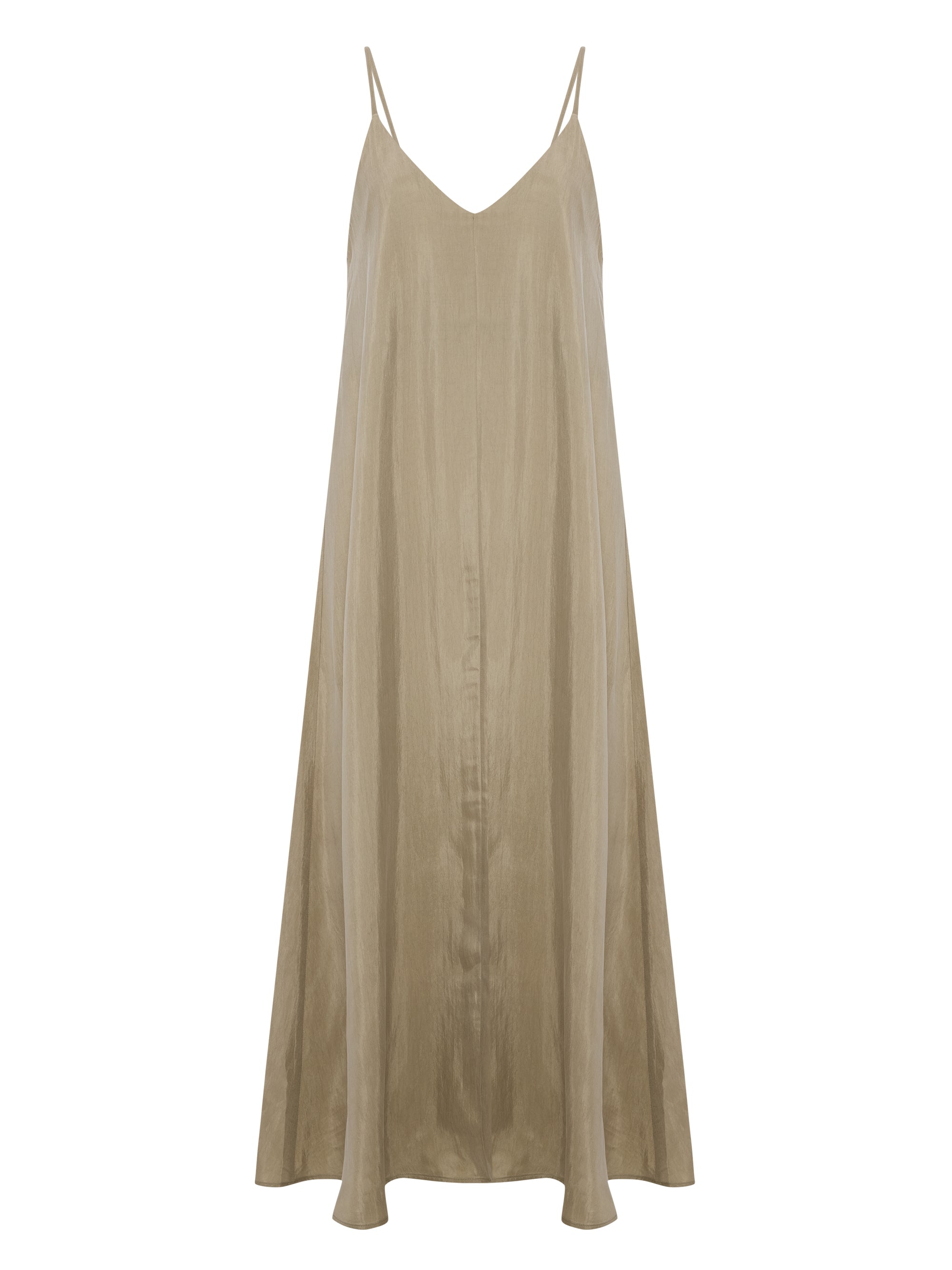 This voluminous summer style features a delicate V-neckline, slender adjustable straps, and a graceful silhouette. The lightweight fabric offers a subtle sheen and a luxurious drape. An elegant open-back detail adds sophistication, making it perfect for both relaxed days and evening occasions.
