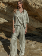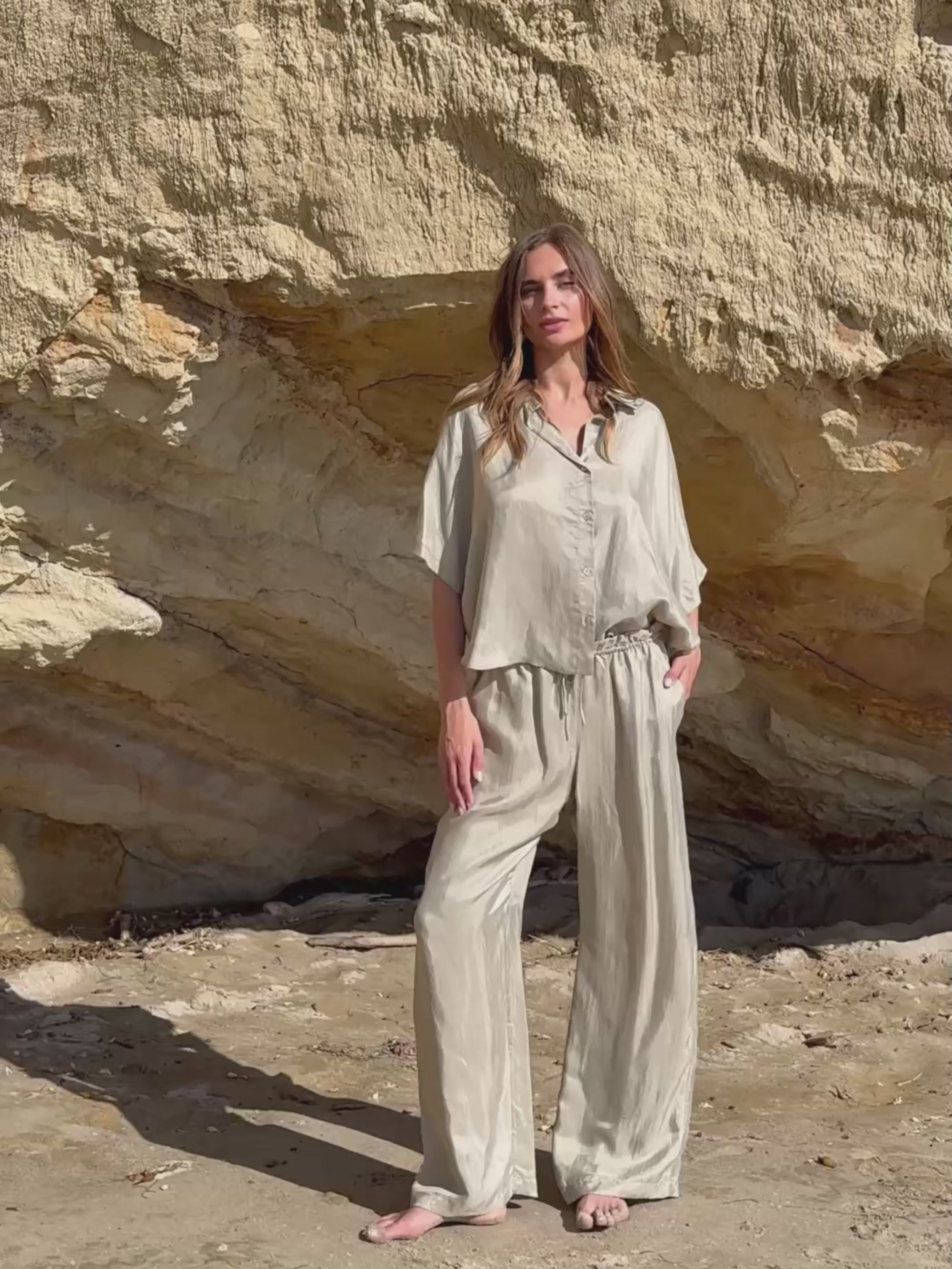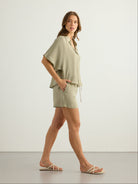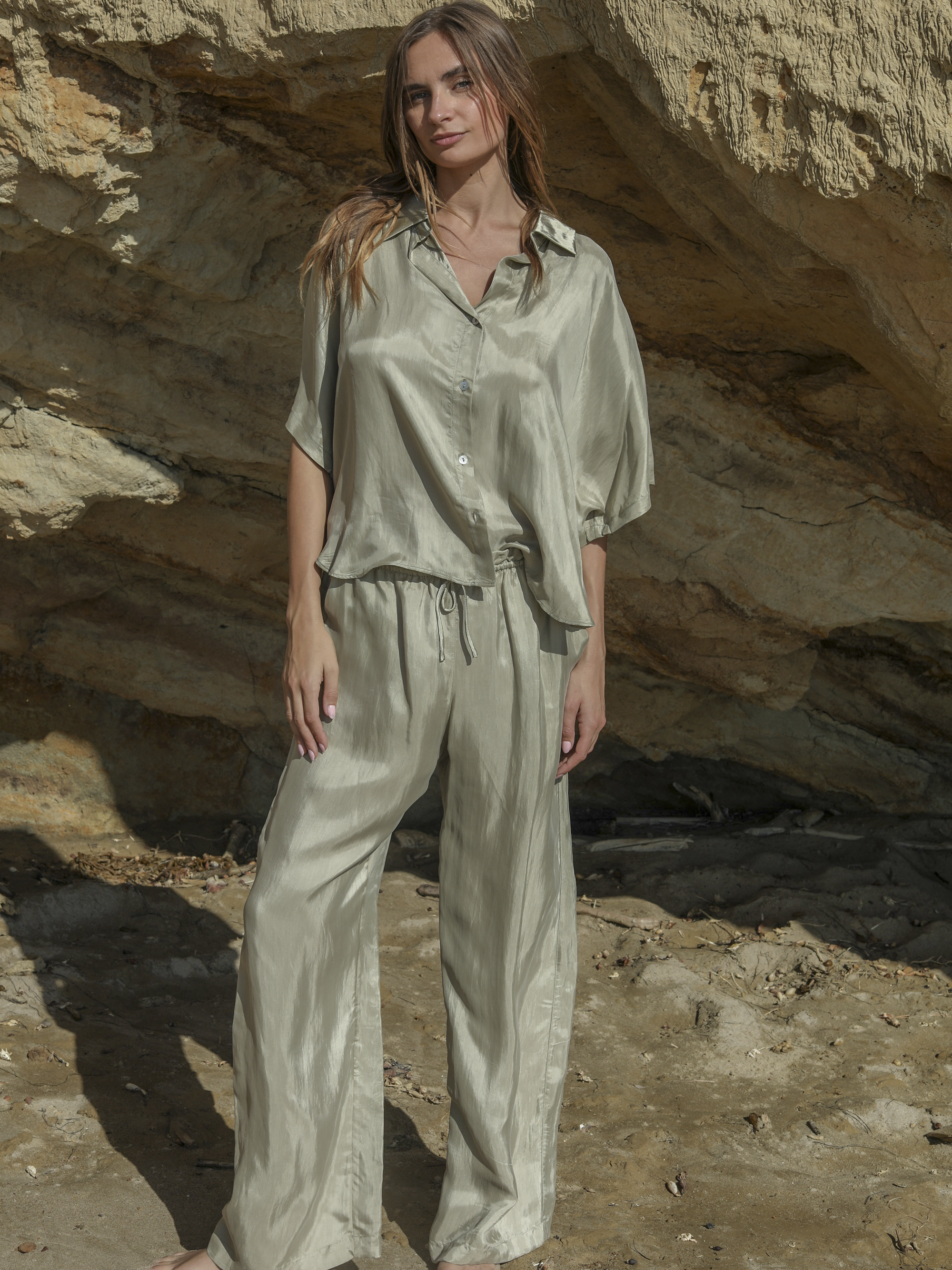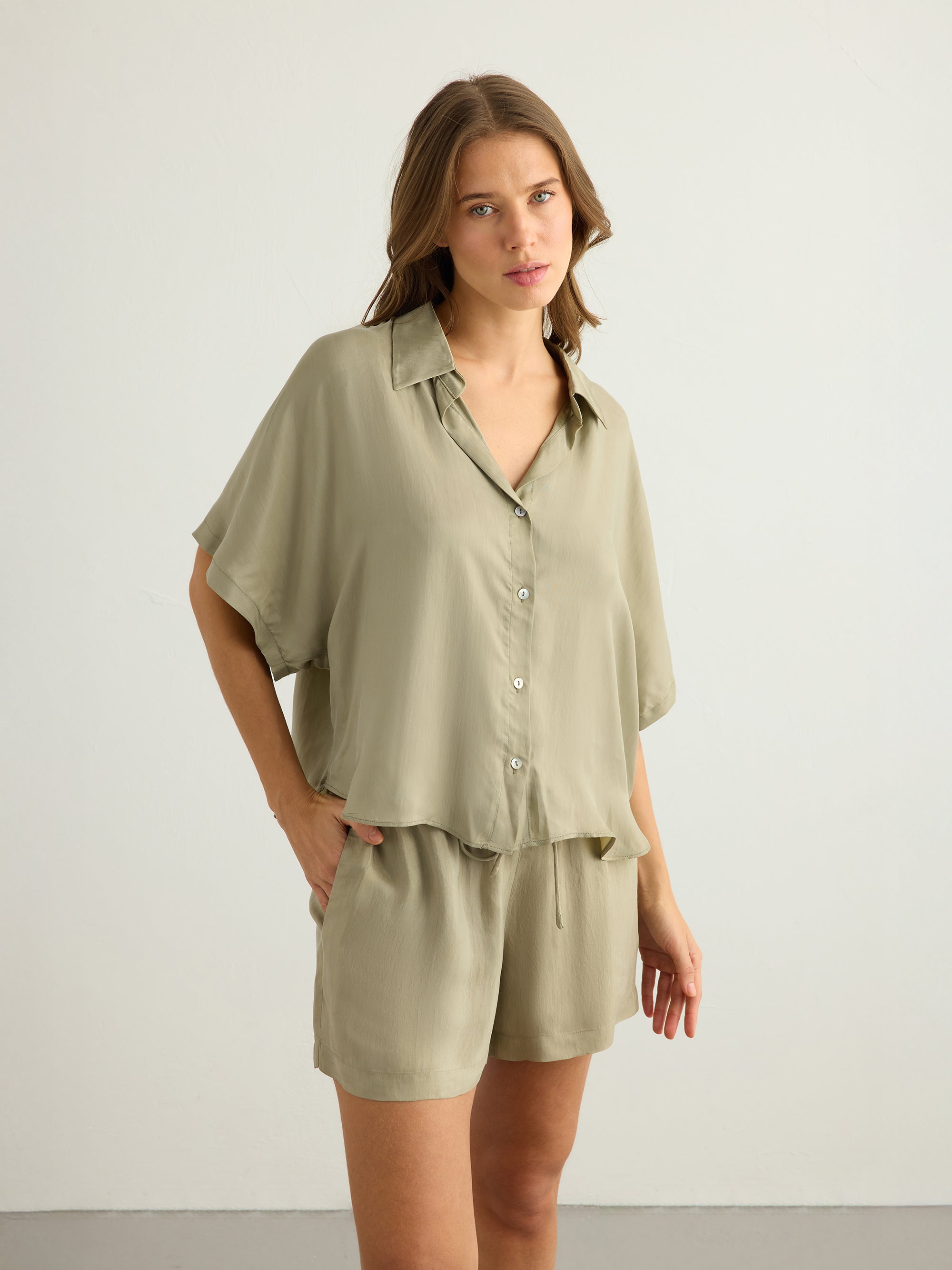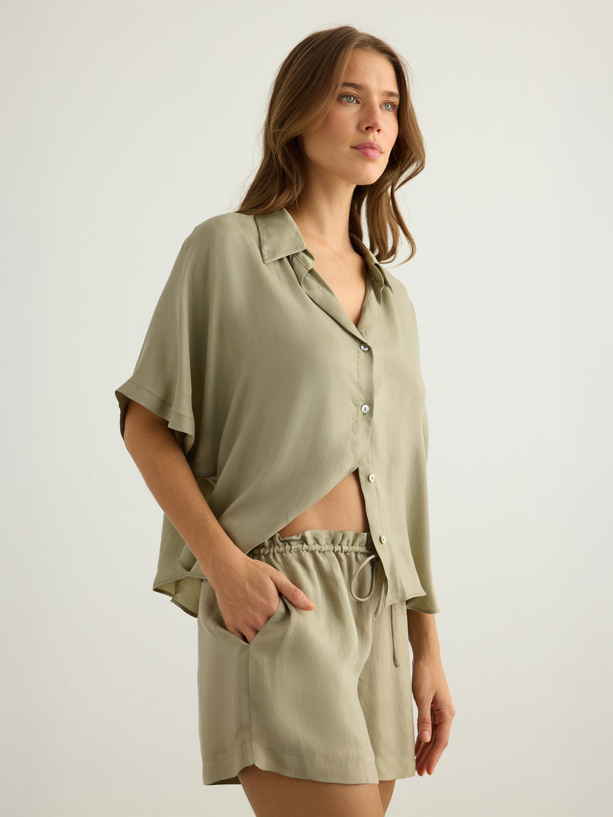 Wear it loose over your favourite jeans with one or two buttons left open for an easy, relaxed look. For warmer days, style it with the matching tie shorts or pants and finish with sandals and a simple tote for an effortless summer outfit.