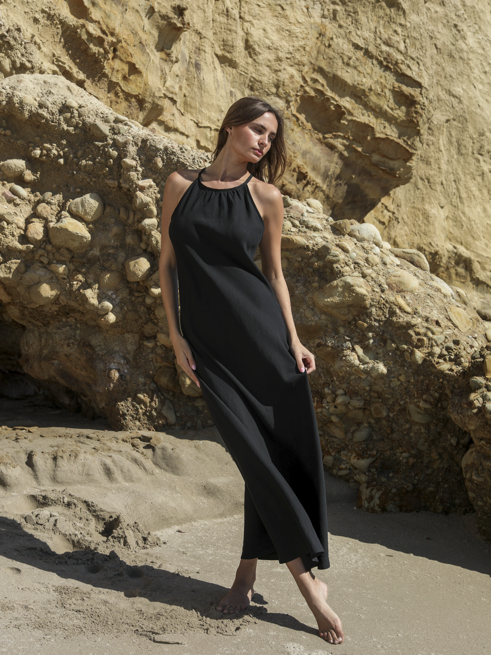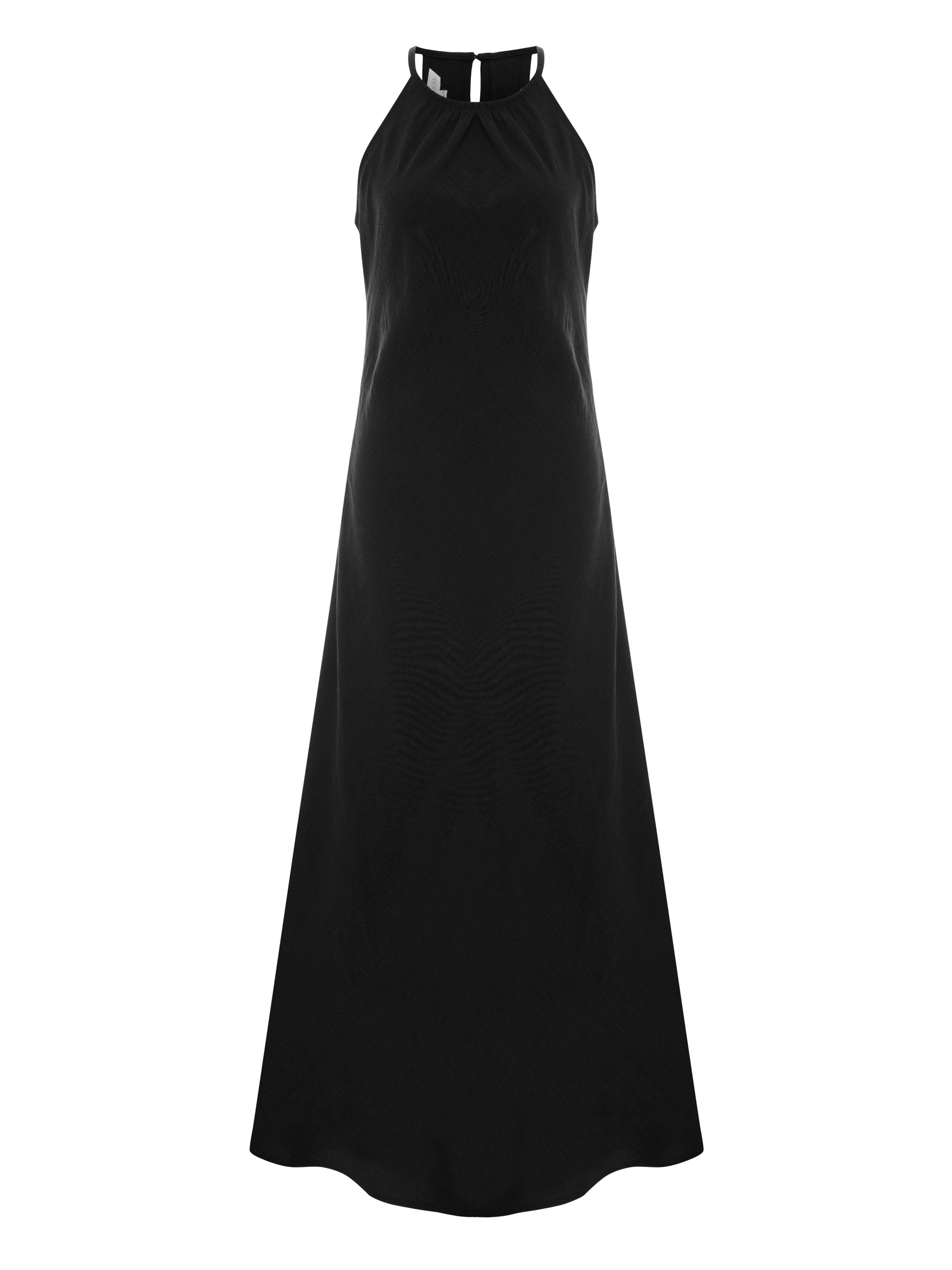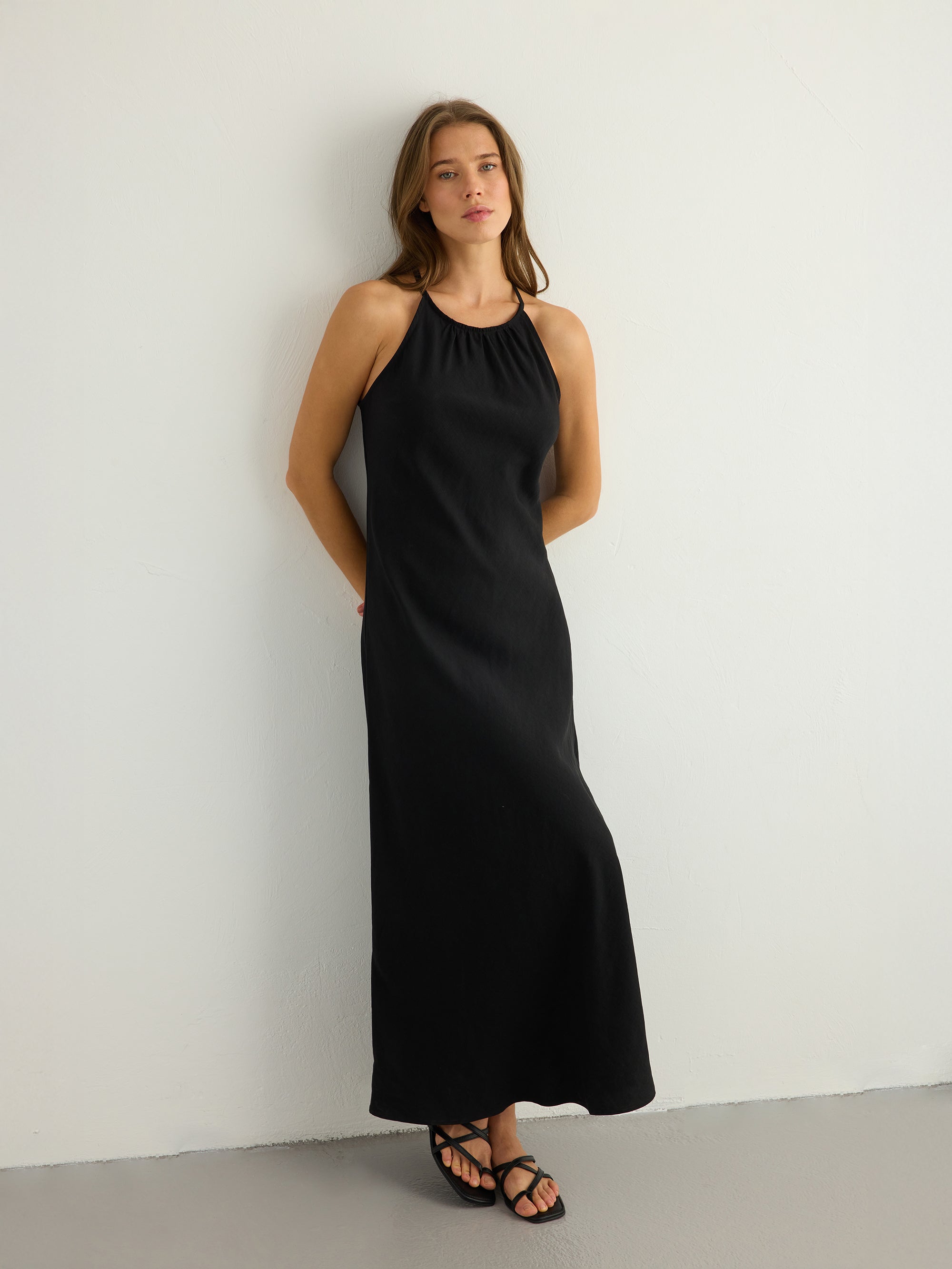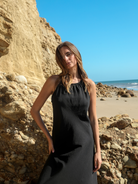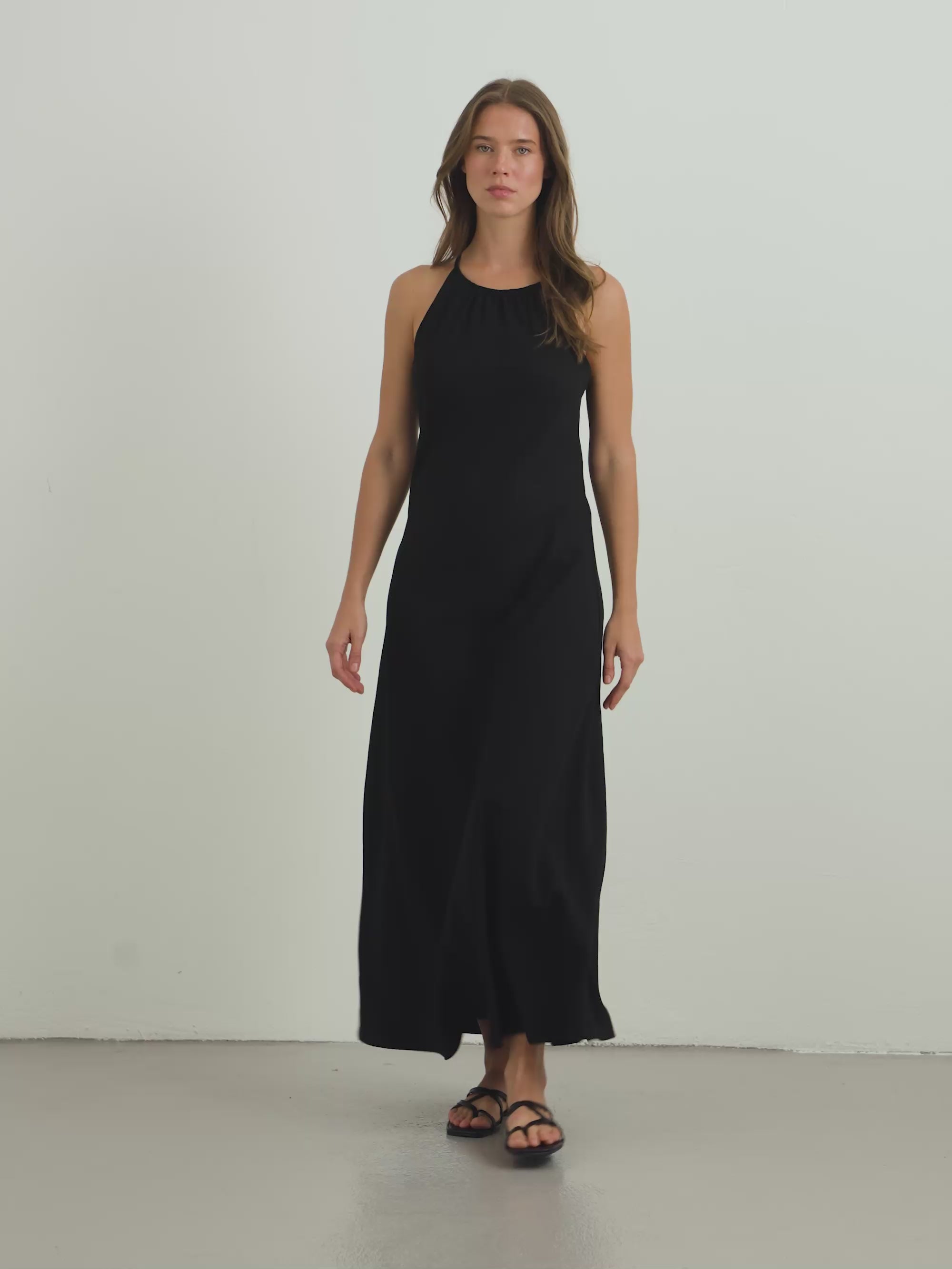 Refined elegance meets modern femininity in this halter-neck maxi dress. Designed with a softly sculpted silhouette, it drapes fluidly over the body and moves beautifully with every step. The open-back halter neckline adds a subtle statement, while the clean lines create a timeless and refined look. Perfect for summer evenings, seaside dinners, or special occasions.