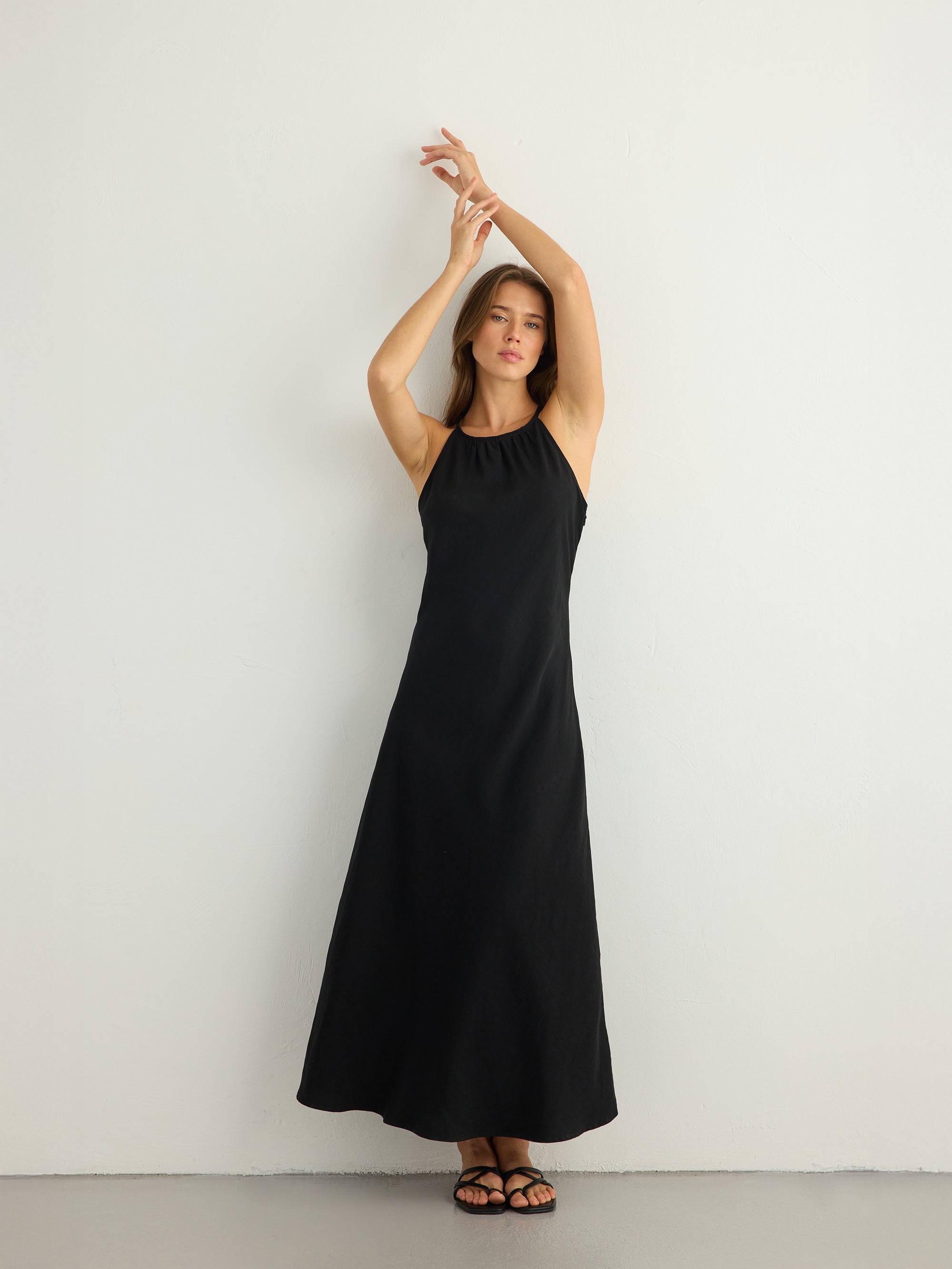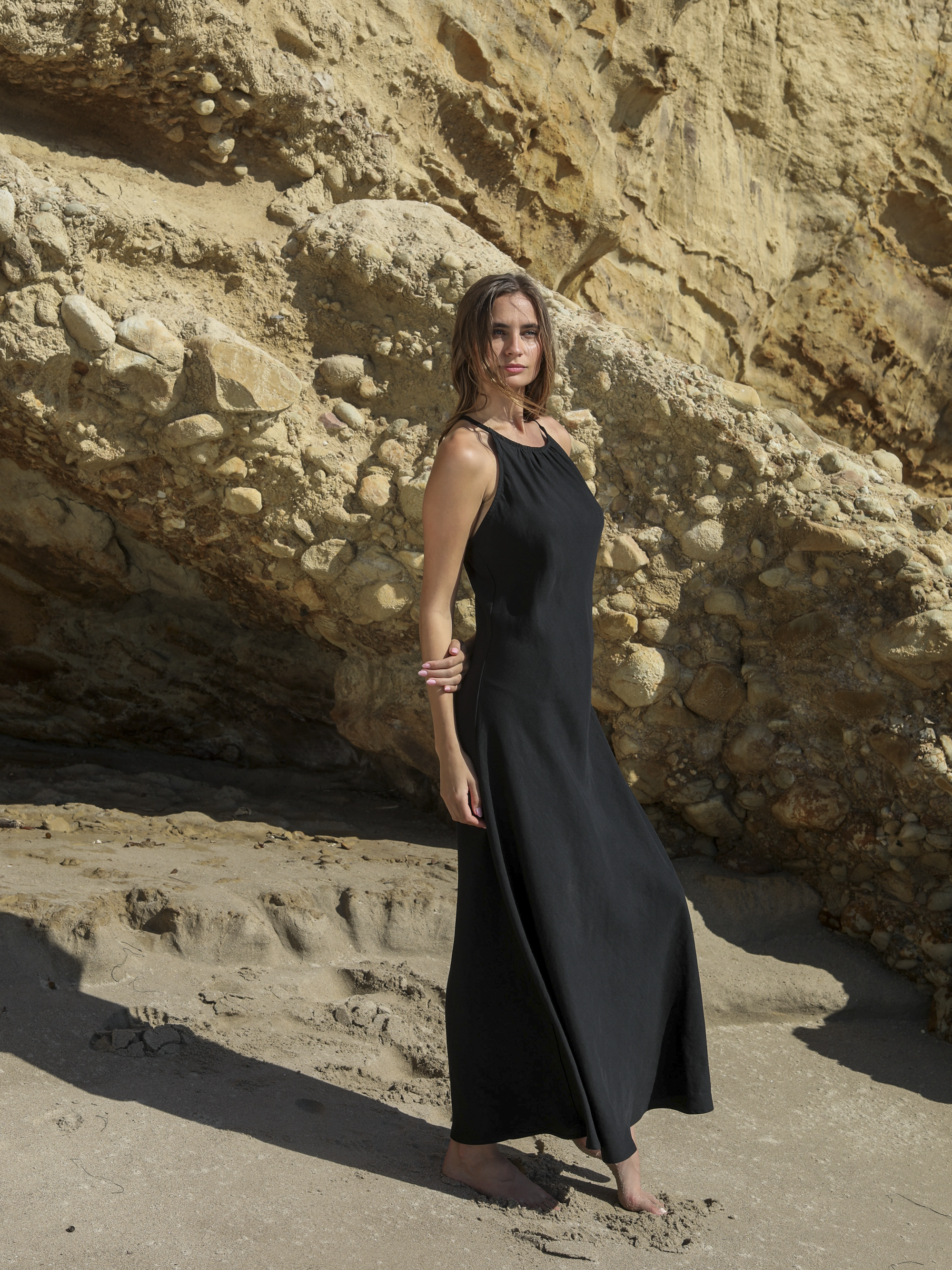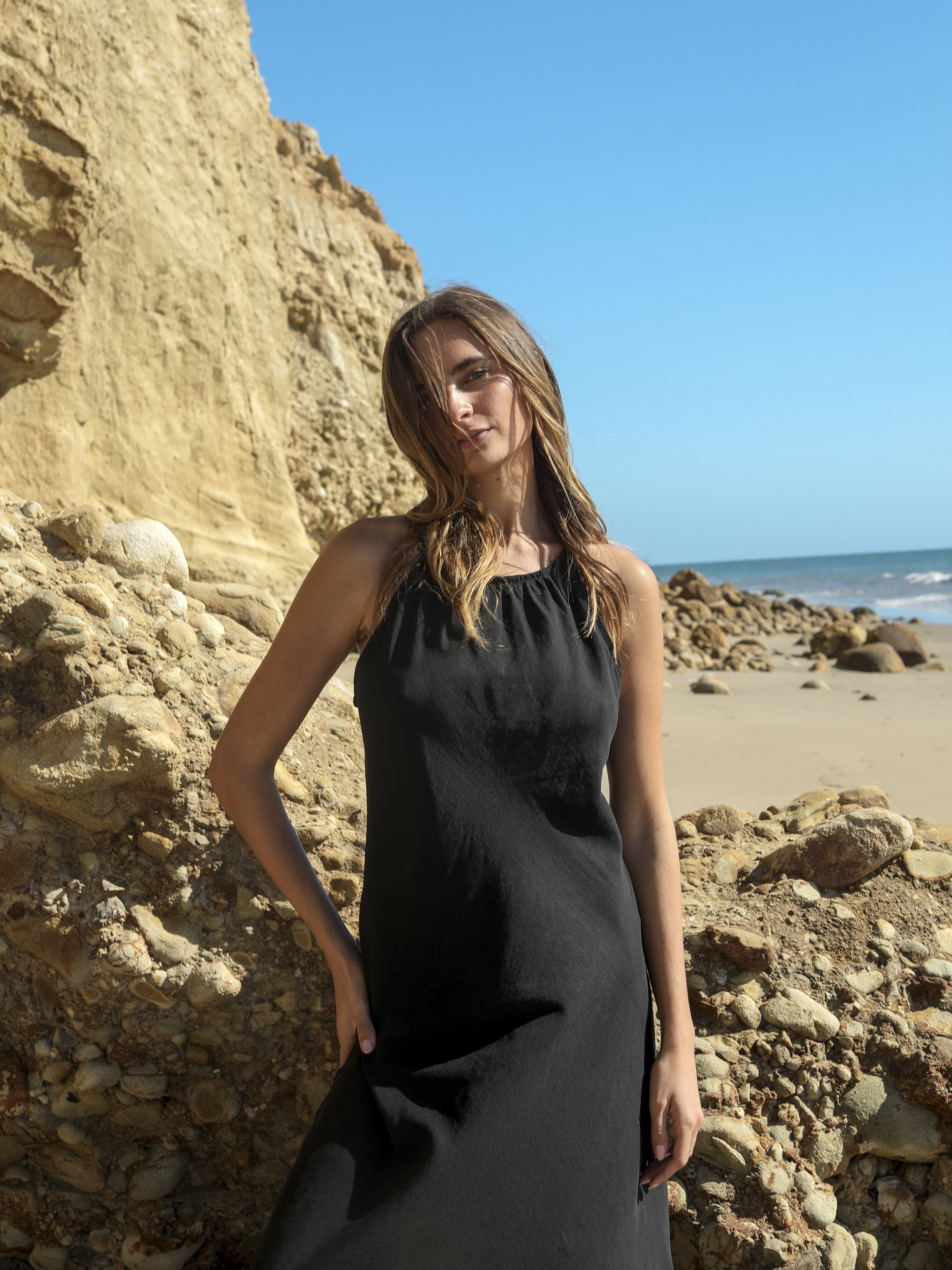 Refined elegance meets modern femininity in this halter-neck maxi dress. Designed with a softly sculpted silhouette, it drapes fluidly over the body and moves beautifully with every step. The open-back halter neckline adds a subtle statement, while the clean lines create a timeless and refined look. Perfect for summer evenings, seaside dinners, or special occasions.