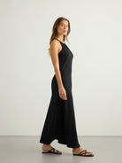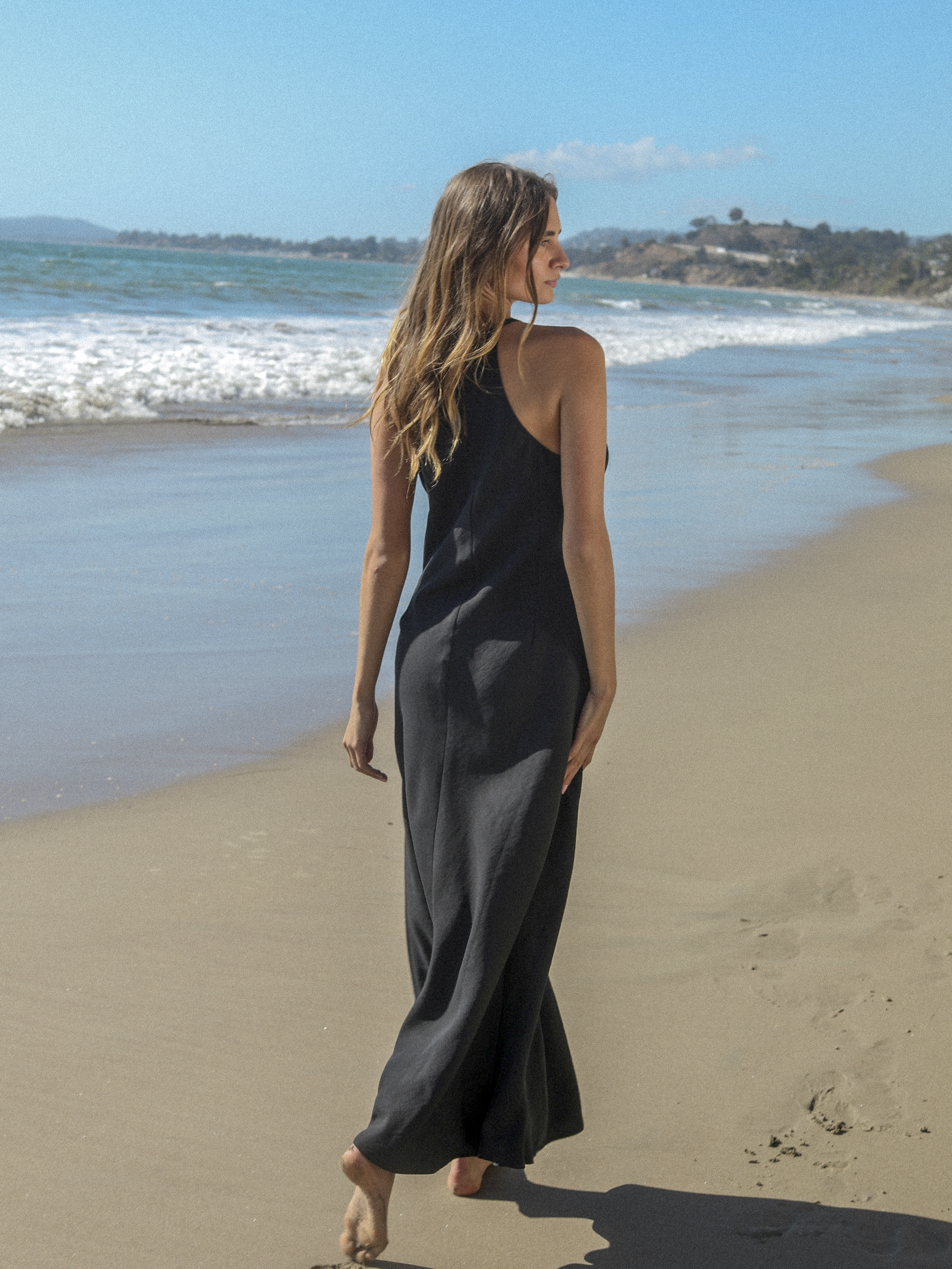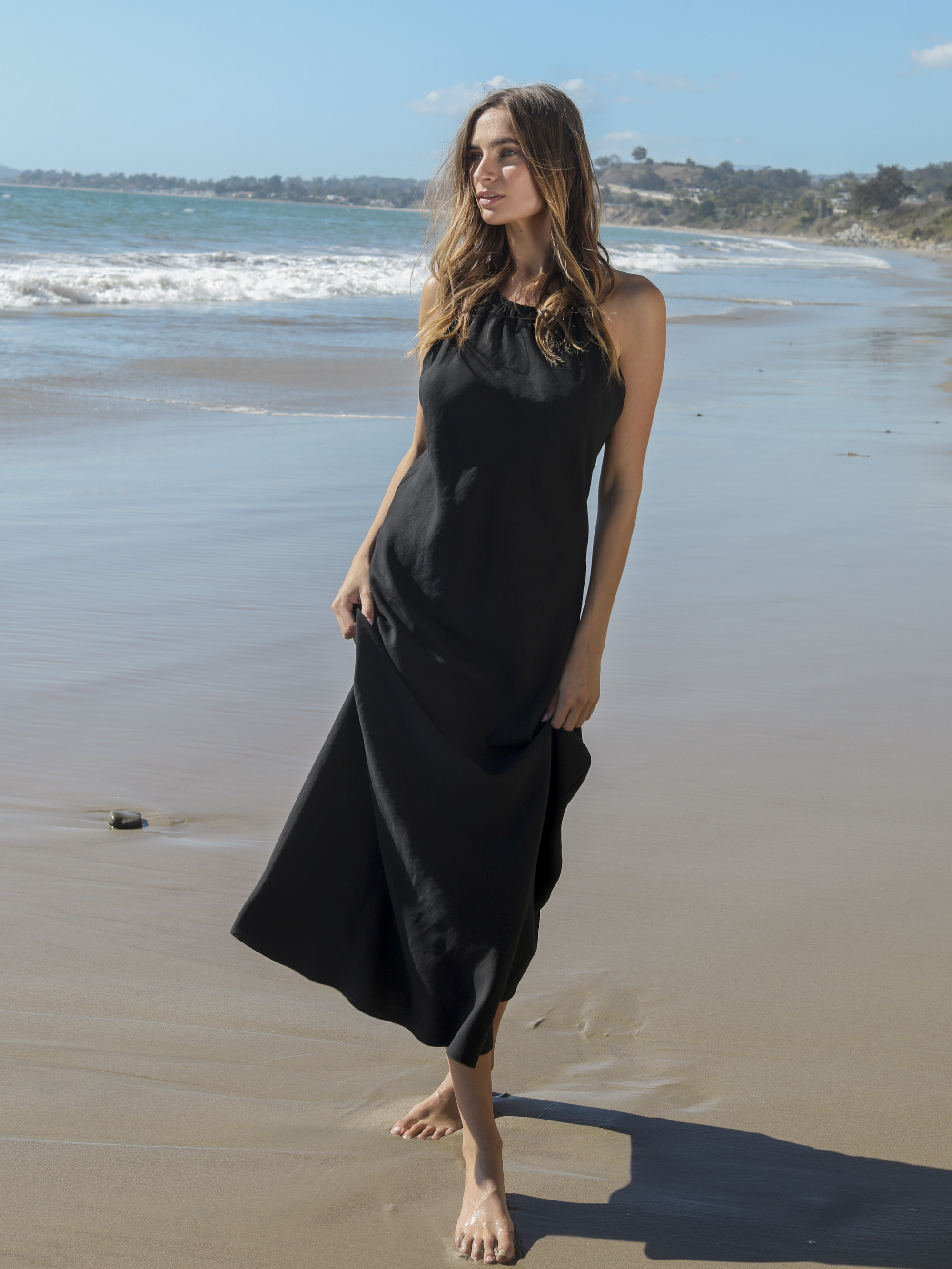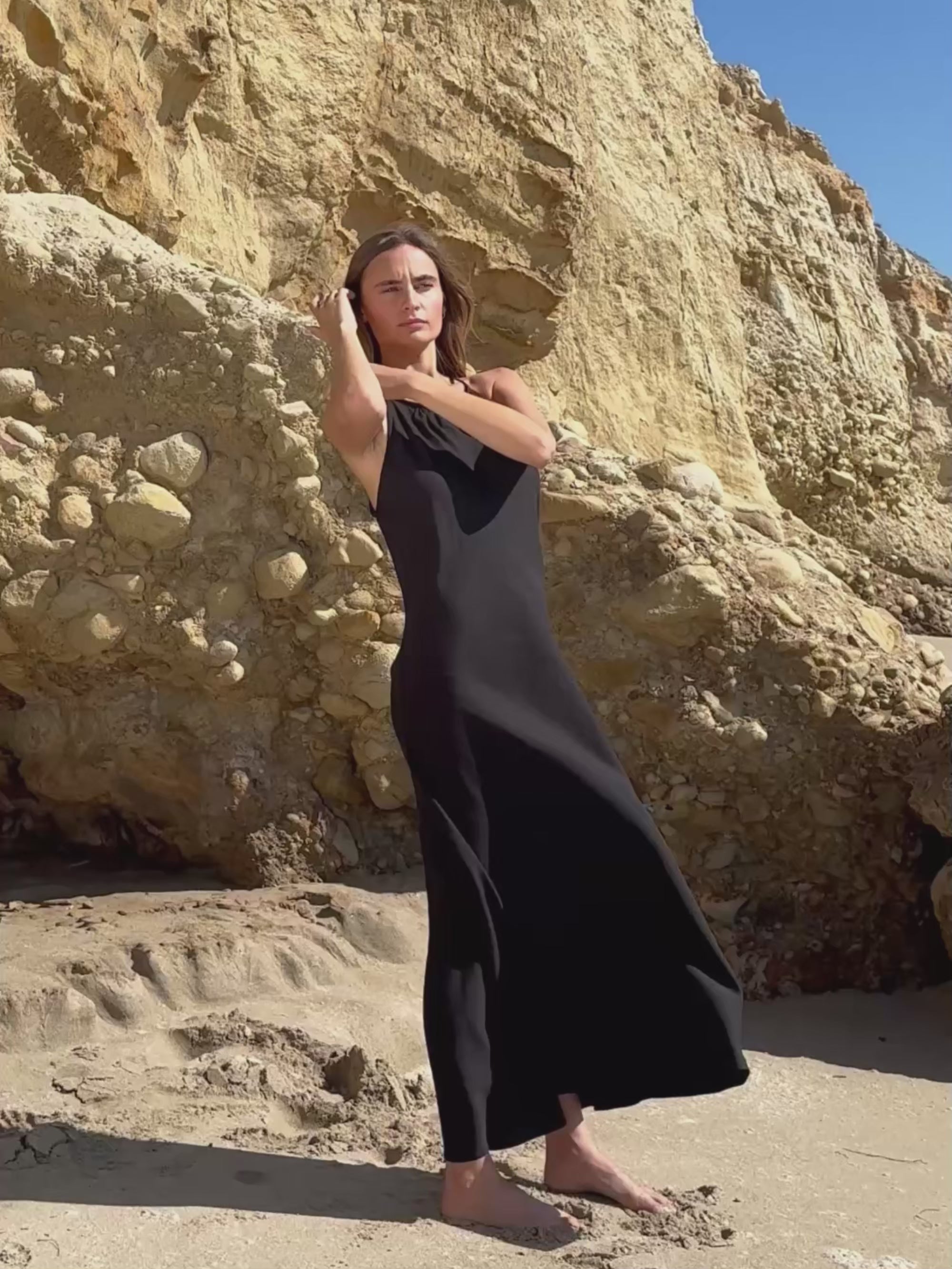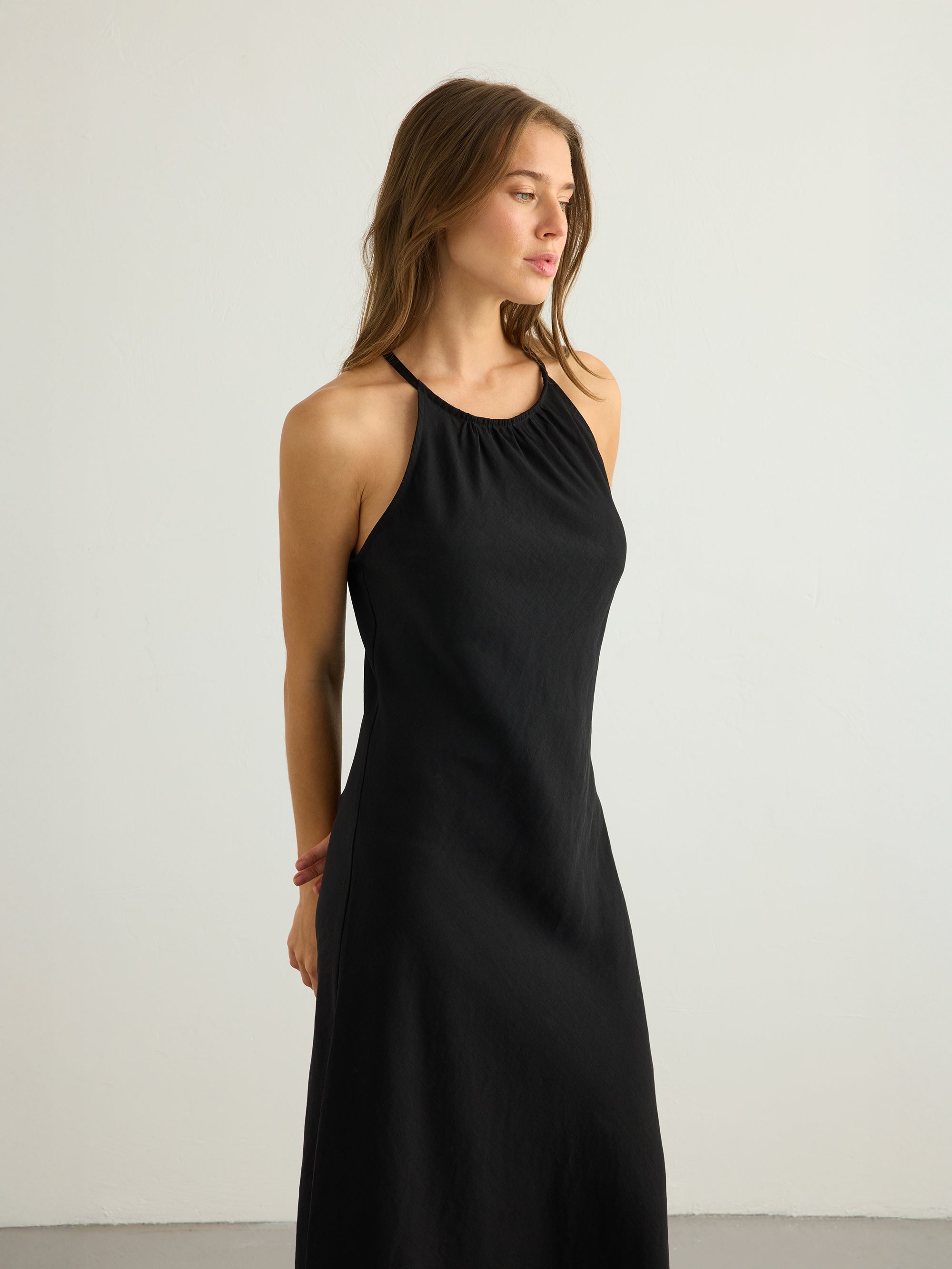 Refined elegance meets modern femininity in this halter-neck maxi dress. Designed with a softly sculpted silhouette, it drapes fluidly over the body and moves beautifully with every step. The open-back halter neckline adds a subtle statement, while the clean lines create a timeless and refined look. Perfect for summer evenings, seaside dinners, or special occasions.