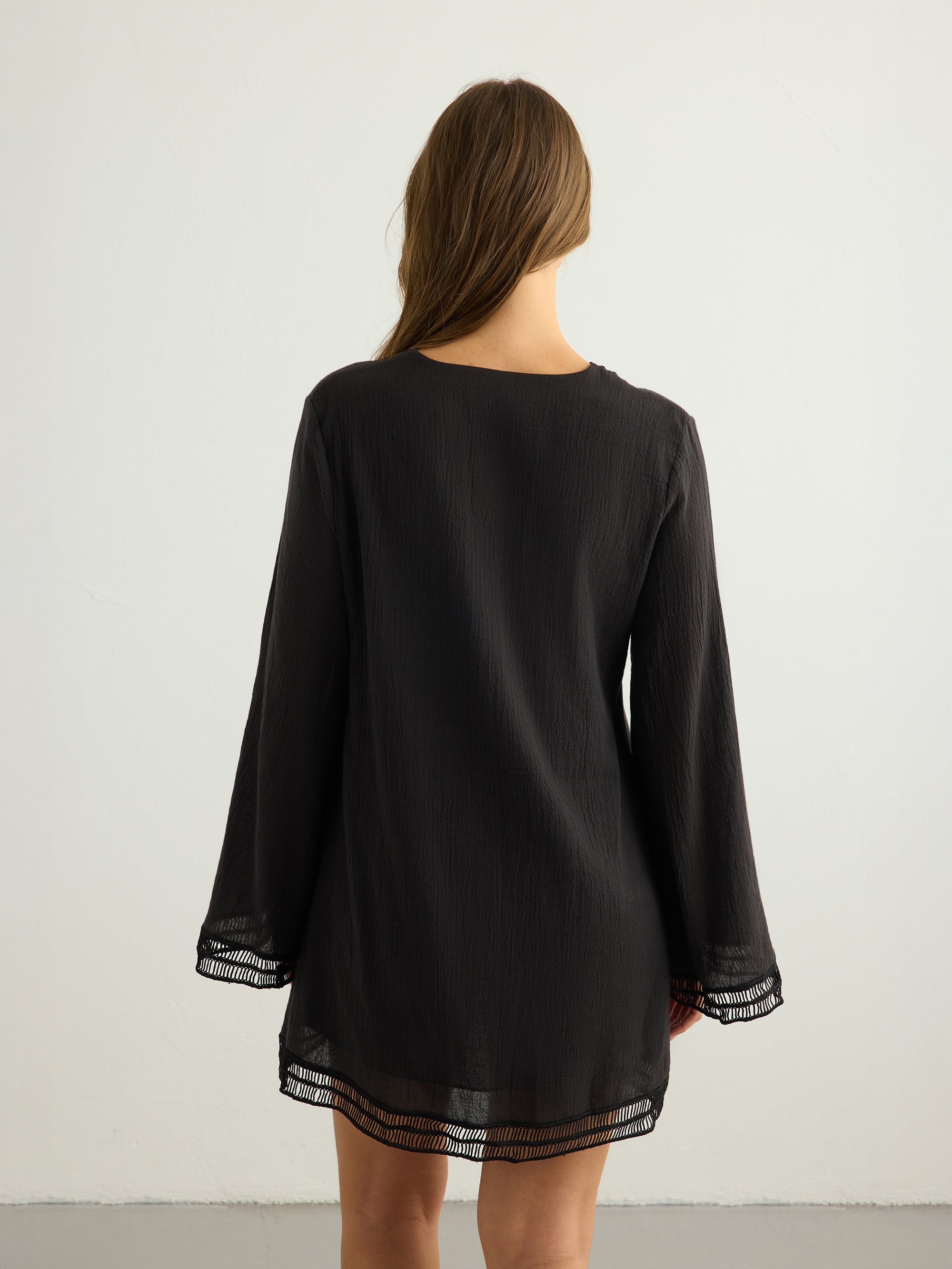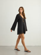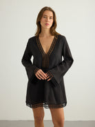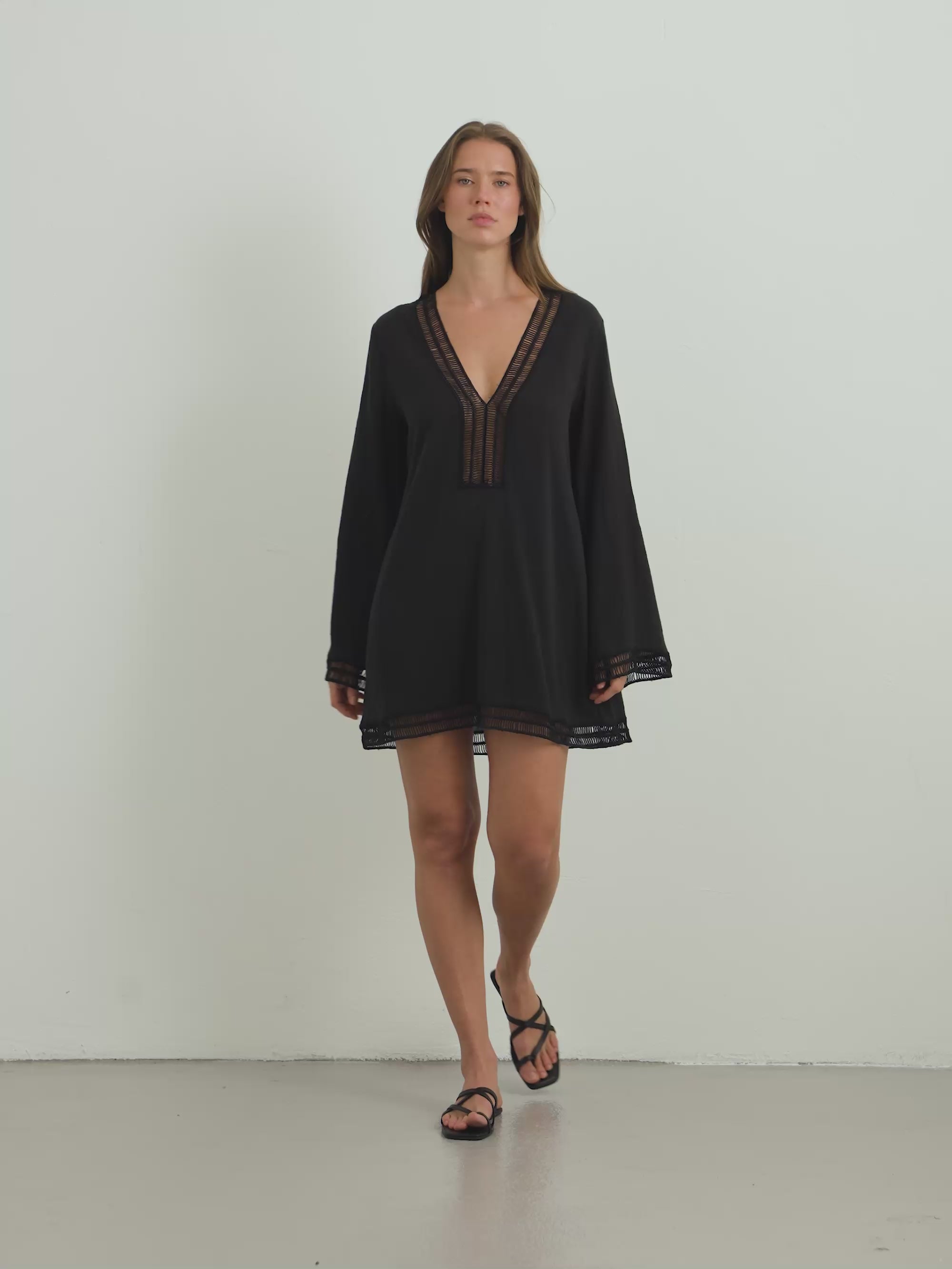 Elevate your style with this versatile garment. The plunging neckline and open, breezy silhouette offer relaxed elegance, while lace at the neckline, cuffs, and the bottom of the skirt adds a romantic touch. Lined throughout, it effortlessly transitions from a beach cover-up to a stylish evening choice.