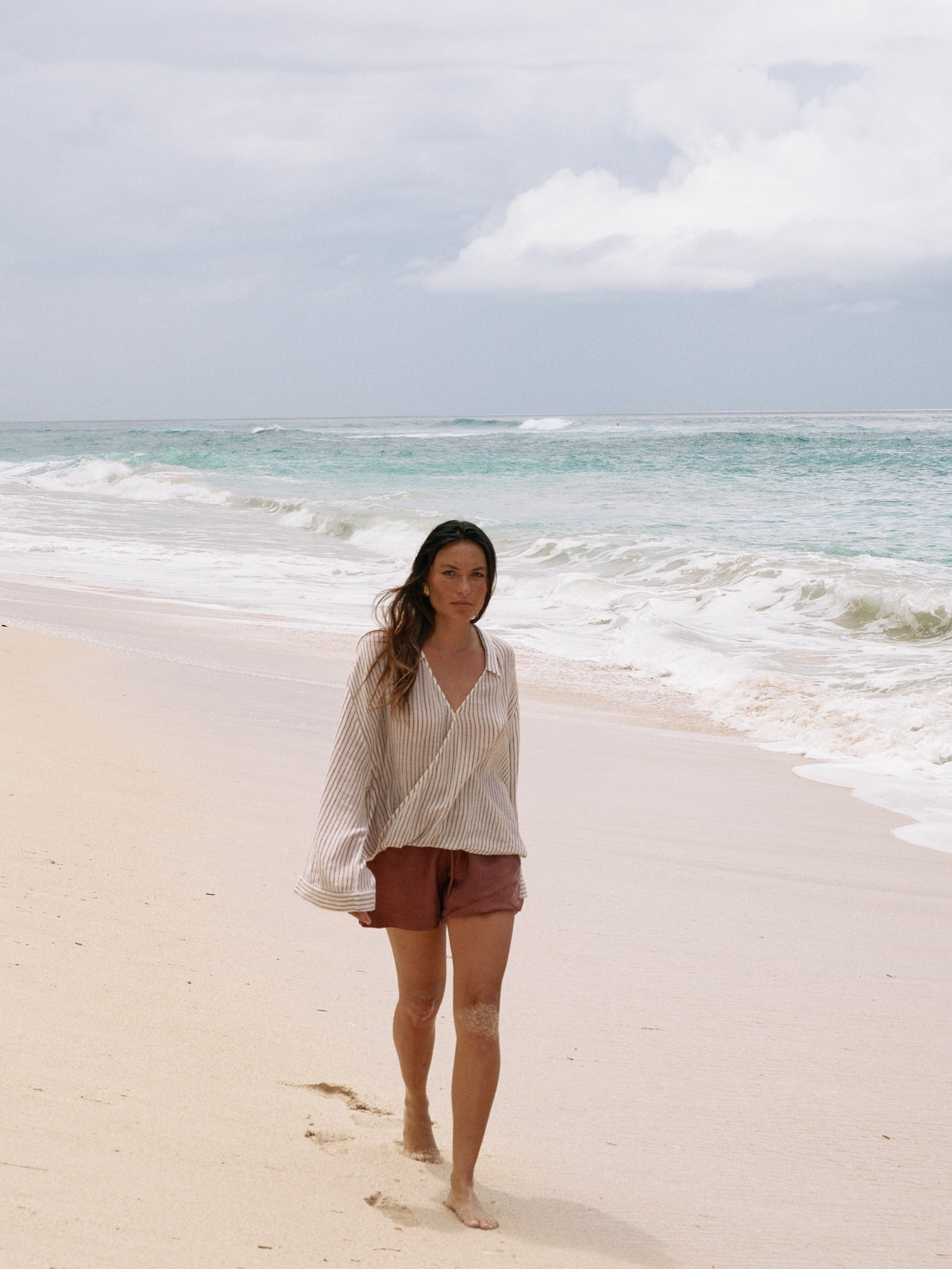The Sade Top Burgundy Stripes's surplice silhouette adds a romantic cross-front drape to a tunic body. An elongating vertical stripe cascades down its length. Flowing material feels irresistibly breezy with wide sleeves and a low back hem. It’s perfect for strolls in the sand or layering over a transitional look. A soft-tailored collar adds “boyfriend shirt” appeal, while an optional invisible closure lets you wear it more modestly.