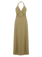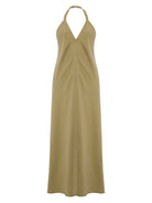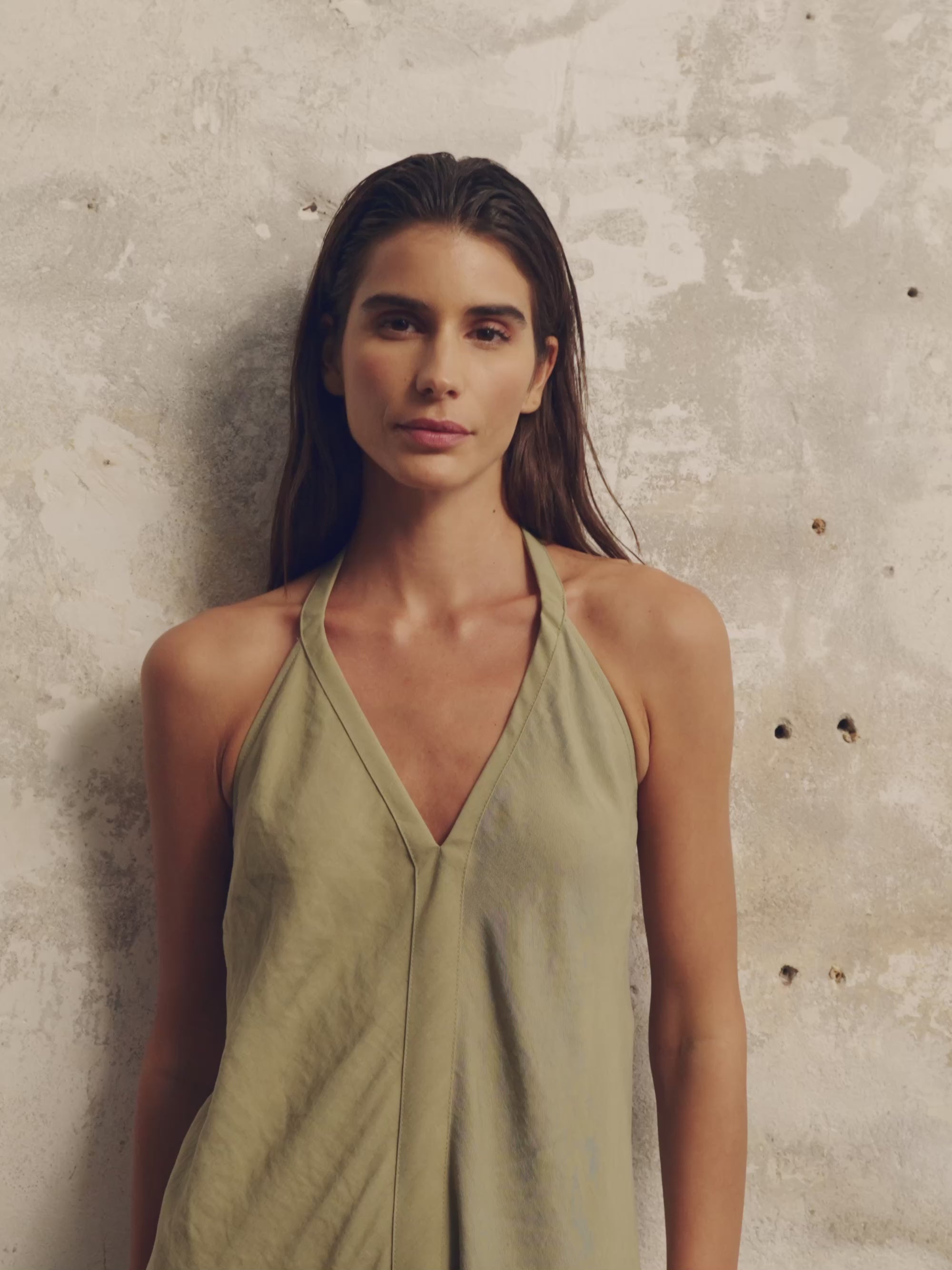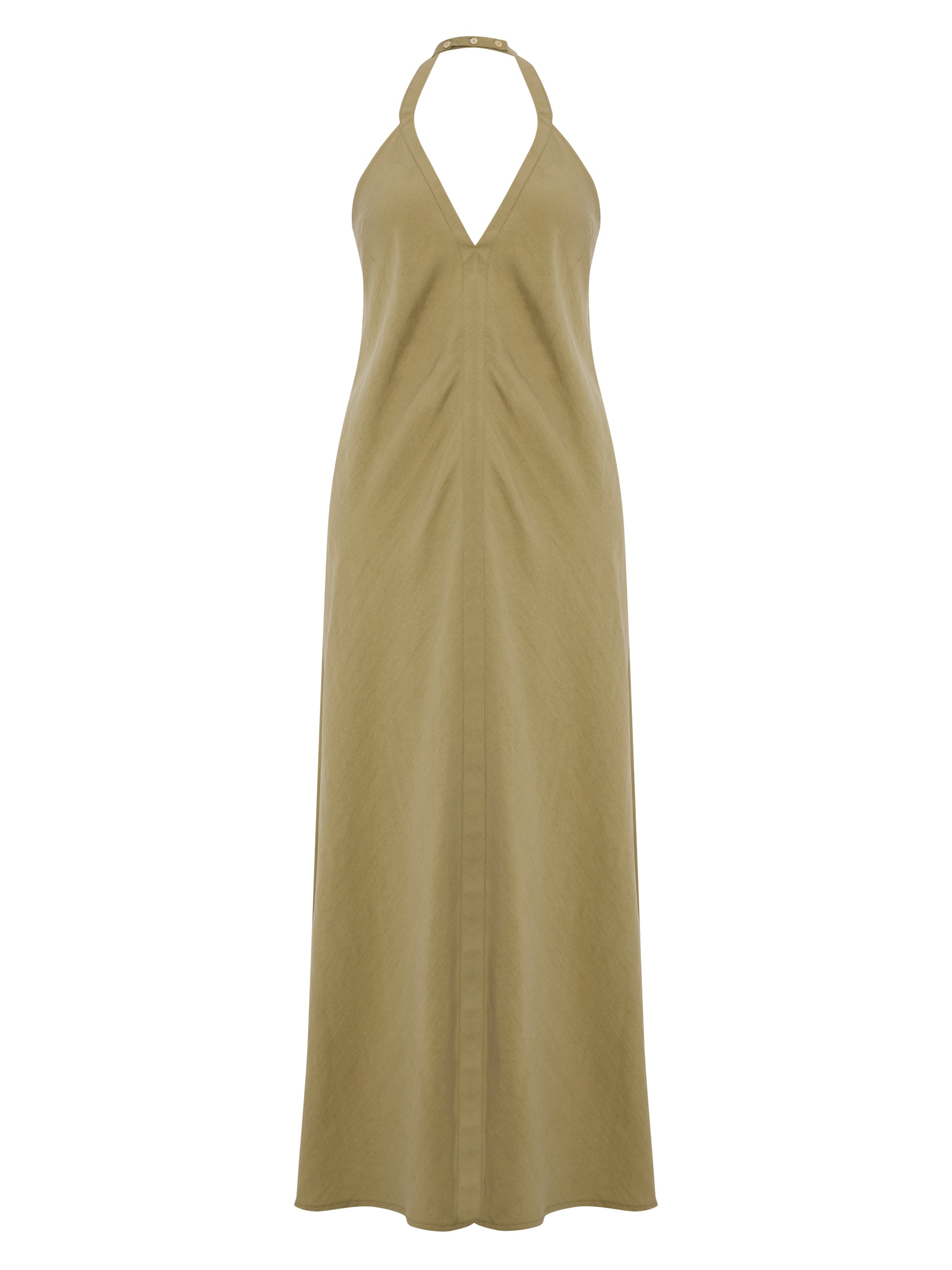 Effortless and refined, this maxi dress is designed to exude elegance with a modern edge. Featuring an open-back detail, a flowing wide-cut silhouette, and an adjustable halter neck with dual button closures, it combines ease and sophistication. The fabric offers a soft drape and a natural sheen. Perfect for any occasion, this versatile piece transitions seamlessly from daytime gatherings to evening events.